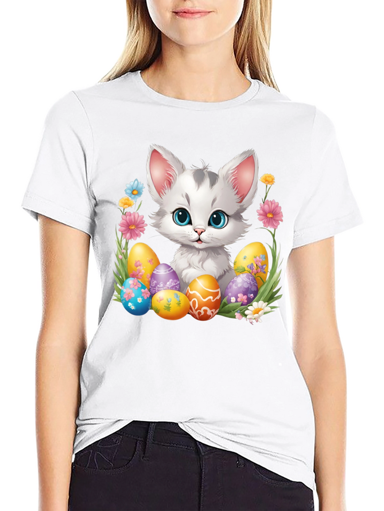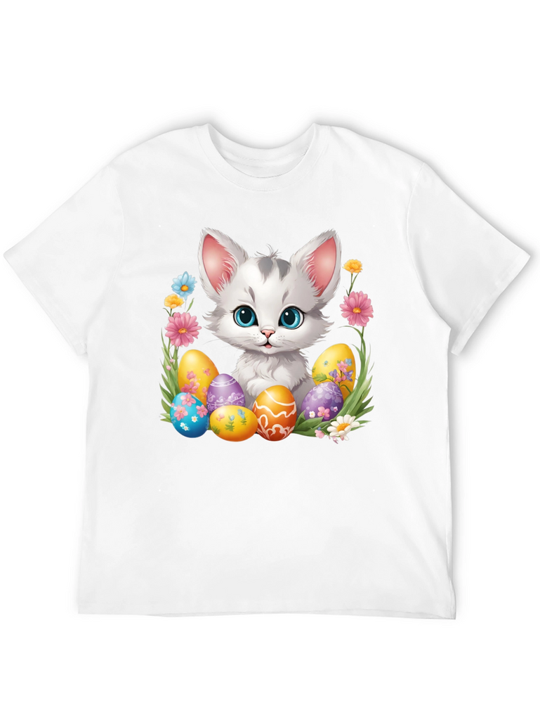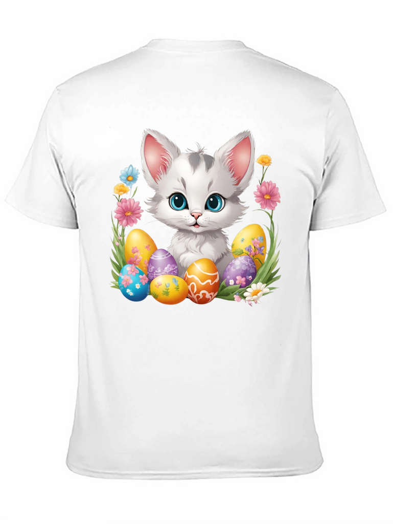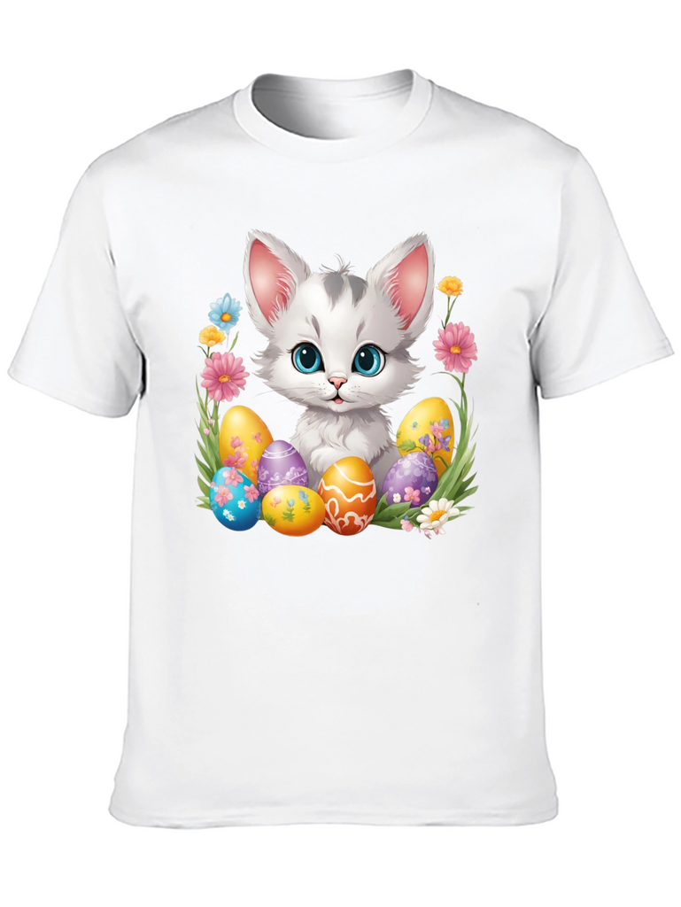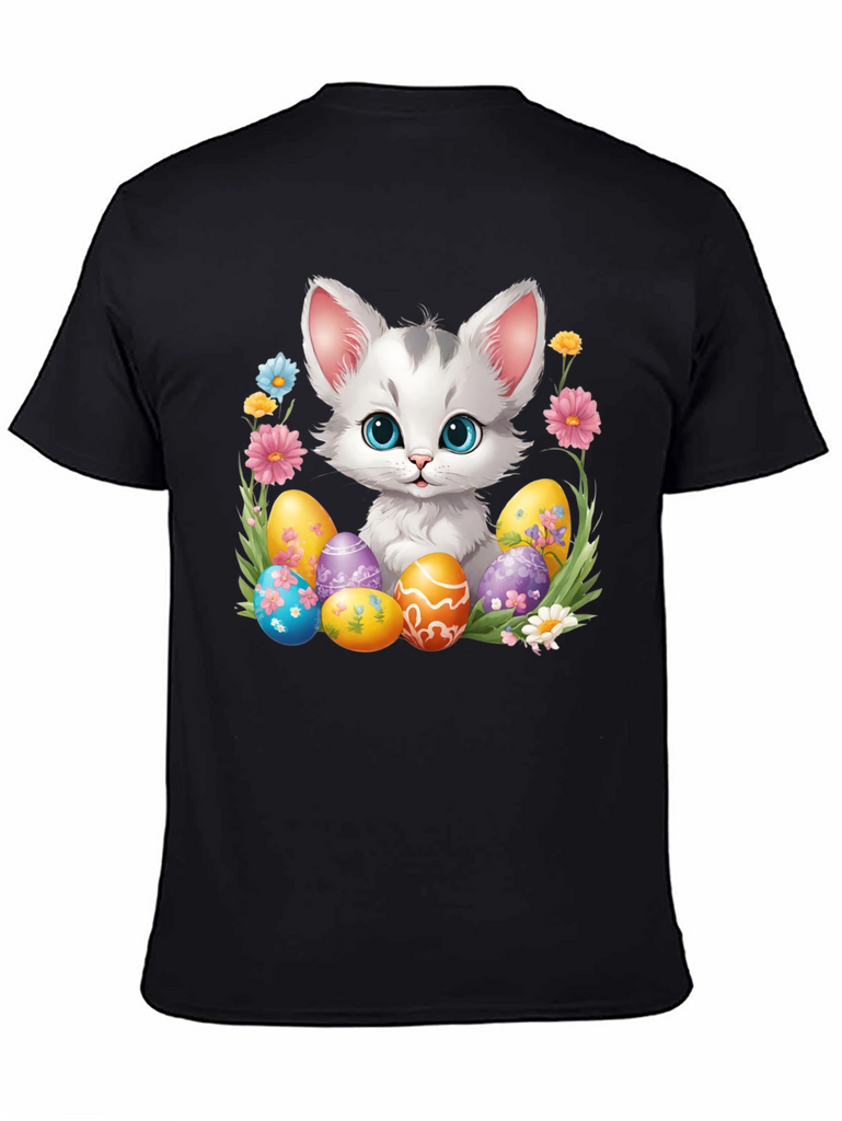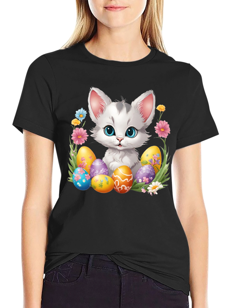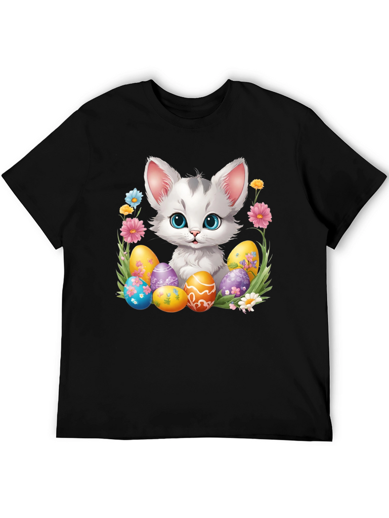 Celebrate Easter in style with this adorable kitten graphic tee. The design features a cute white kitten surrounded by colorful Easter eggs and spring flowers. Made from a comfortable black fabric, this t-shirt is perfect for casual wear during the Easter season. The vibrant colors and charming design make it a fun and festive choice for Easter egg hunts, family gatherings, or everyday wear. Show off your love for kittens and Easter with this unique and eye-catching t-shirt.