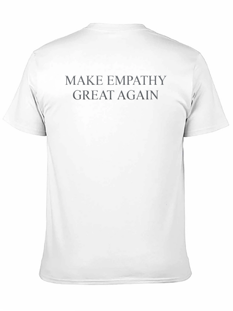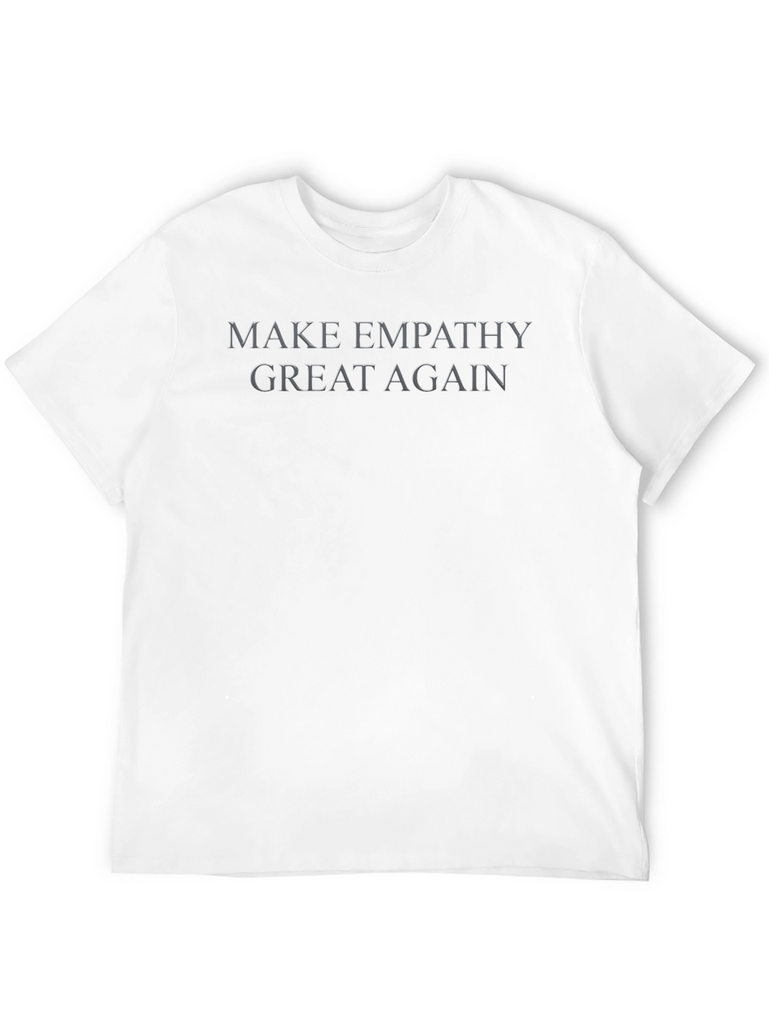 Show your support for empathy with this stylish black t-shirt. The shirt features the phrase "Make Empathy Great Again" in an elegant, eye-catching font. Made from a soft, comfortable fabric, this tee is perfect for everyday wear, social gatherings, or making a statement. The classic fit ensures a flattering silhouette for any body type. Wear it with jeans, shorts, or a skirt for a versatile look that promotes compassion. Get yours today and spread the message of empathy wherever you go!