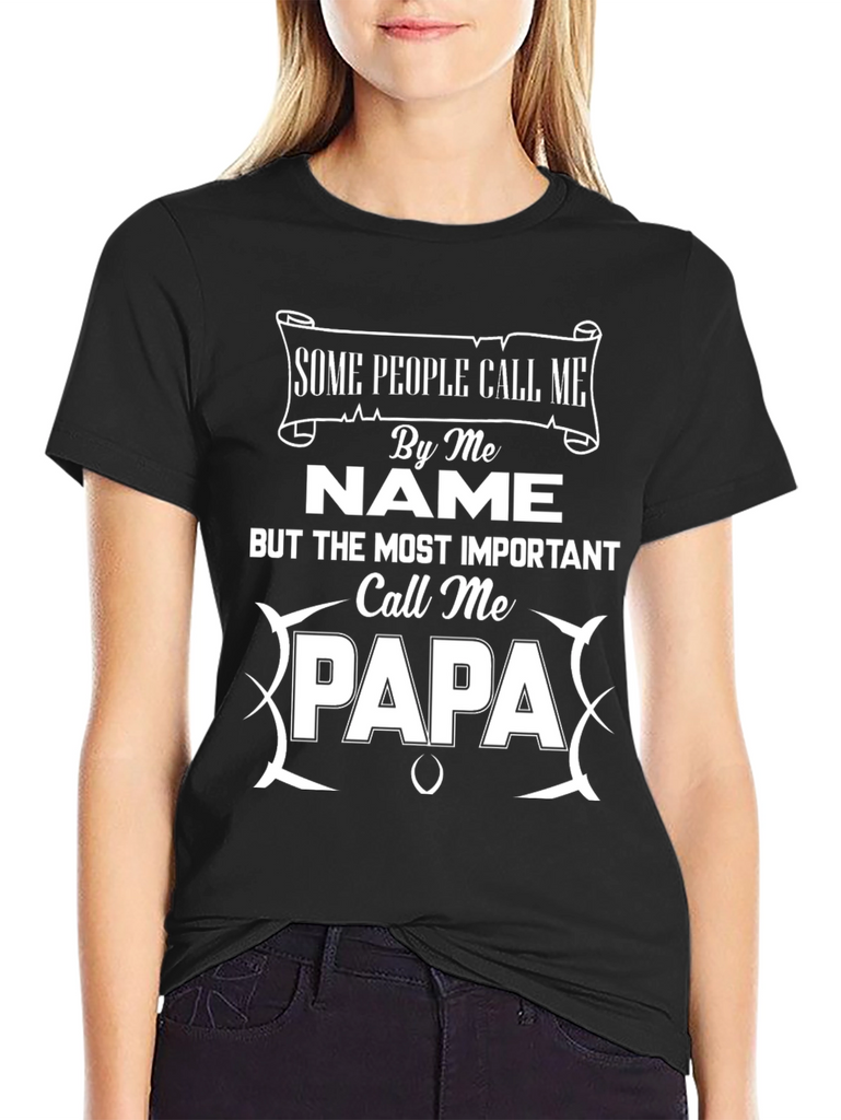 This classic black t-shirt features a heartwarming message for fathers. The shirt prominently displays the text "SOME PEOPLE CALL ME By Me NAME BUT THE MOST IMPORTANT Call Me PAPA" in bold, white lettering. The decorative flourishes enhance the playful and affectionate design. Made from a comfortable-looking fabric, this t-shirt is ideal for casual wear. It's a perfect gift for dads, celebrating their important role in the family. Wear it with pride and let everyone know you're a beloved Papa. This is the perfect shirt for Father's Day, birthdays, or just because!