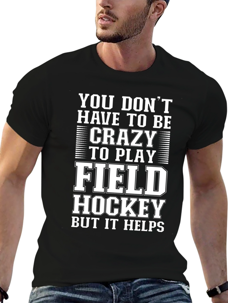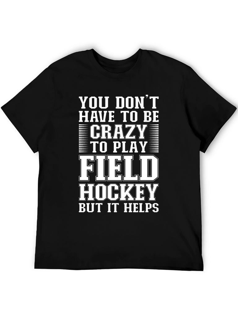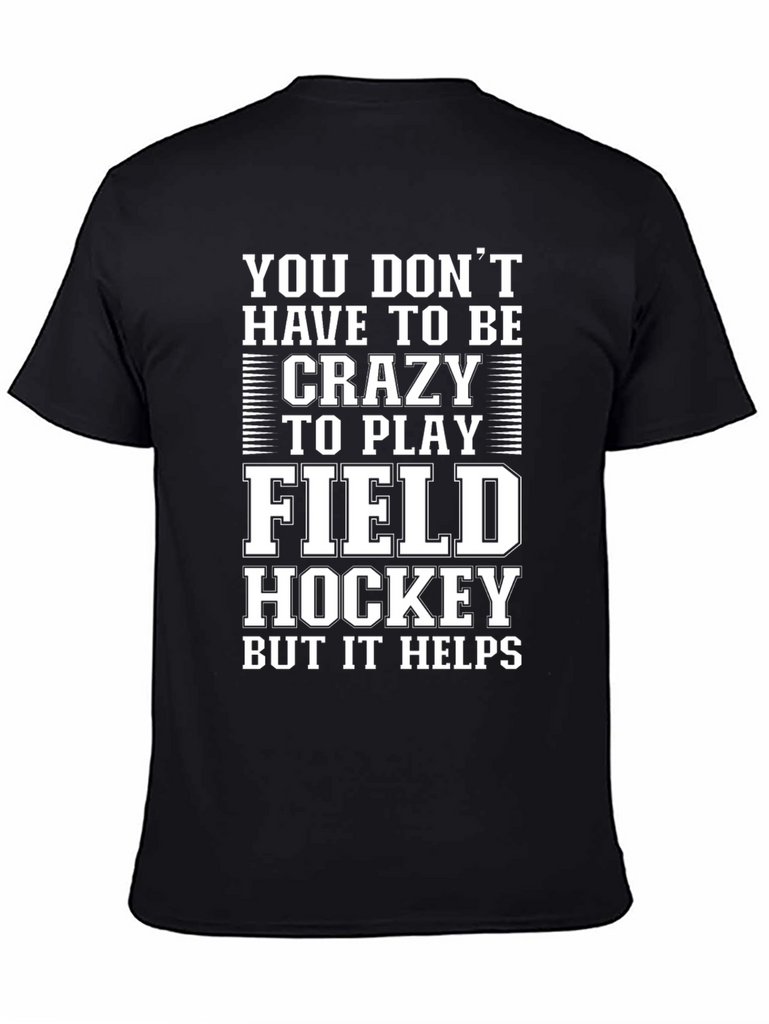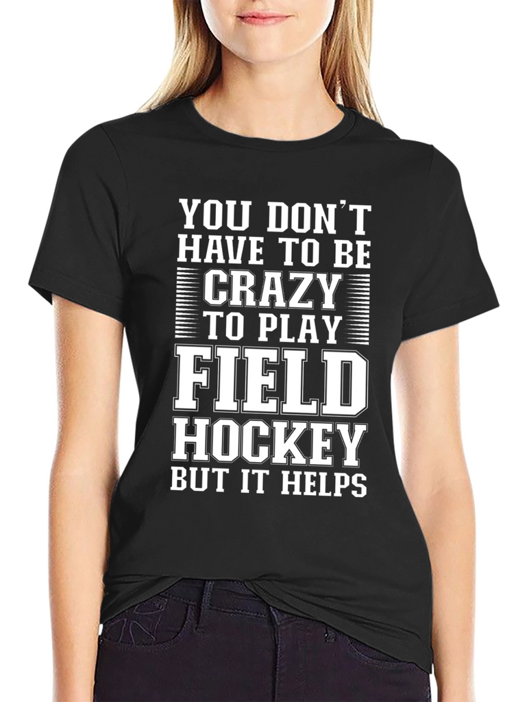 This black t-shirt features a bold white graphic print proclaiming, "YOU DON'T HAVE TO BE CRAZY TO PLAY FIELD HOCKEY BUT IT HELPS." The playful message and classic design make it a great choice for field hockey players and fans with a sense of humor. Made from what appears to be soft, comfortable cotton, this tee is ideal for casual wear, sports events, or everyday activities. Show off your passion for field hockey and your fun side with this unique t-shirt! Wear it to practices, games, or just hanging out with friends.