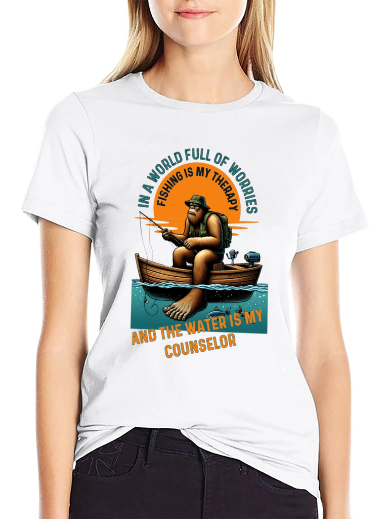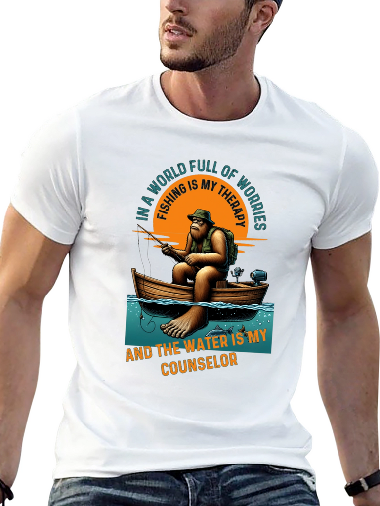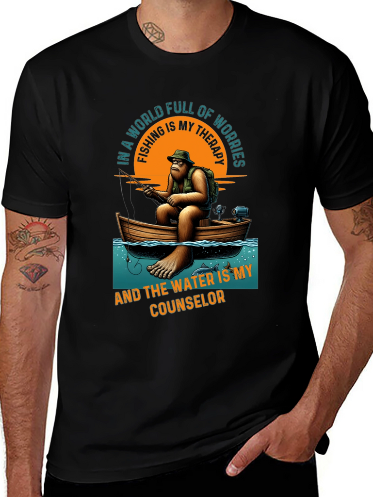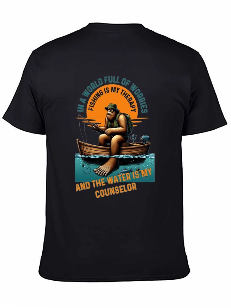 Embrace your love for fishing with this unique black t-shirt featuring a humorous design. The artwork showcases a Bigfoot character fishing in a boat, with the playful saying "In a world full of worries, fishing is my therapy and the water is my counselor". The design combines a love of nature and humor. Made from a comfortable-looking fabric, this tee is perfect for casual wear, fishing trips, or as a fun gift for the angler in your life. Show off your passion for the sport with this eye-catching shirt!