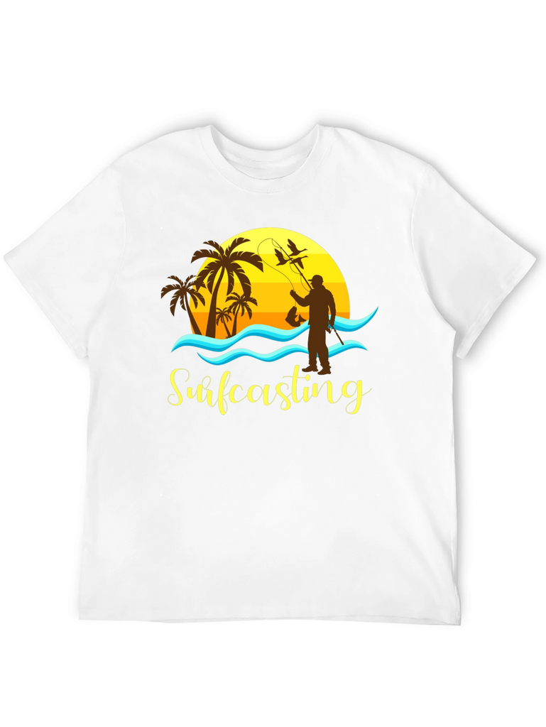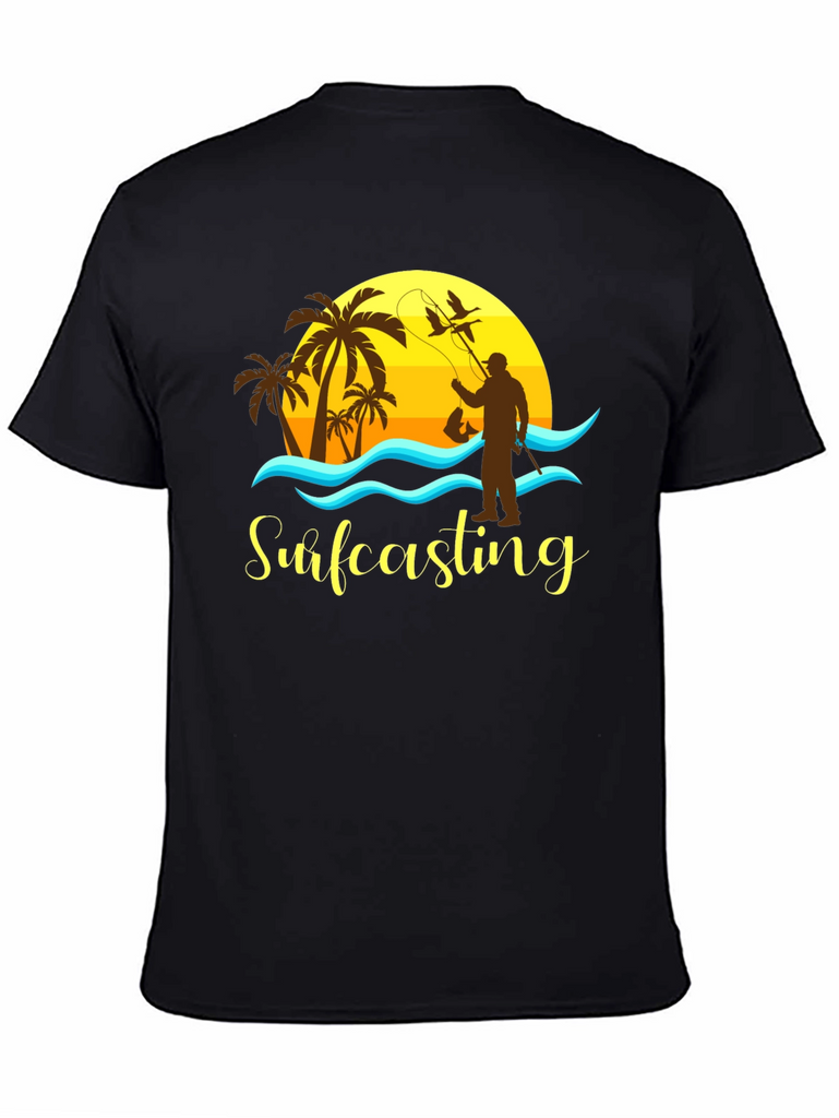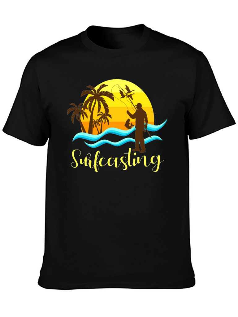 Show off your love for surfcasting with this unique t-shirt. The design features a silhouetted fisherman casting a line under a vibrant sunset, complete with palm trees, ocean waves, and flying birds. The word 'Surfcasting' is written in a yellow script across the chest. This comfortable tee is perfect for casual wear or a day out fishing. A great gift for fishing enthusiasts.