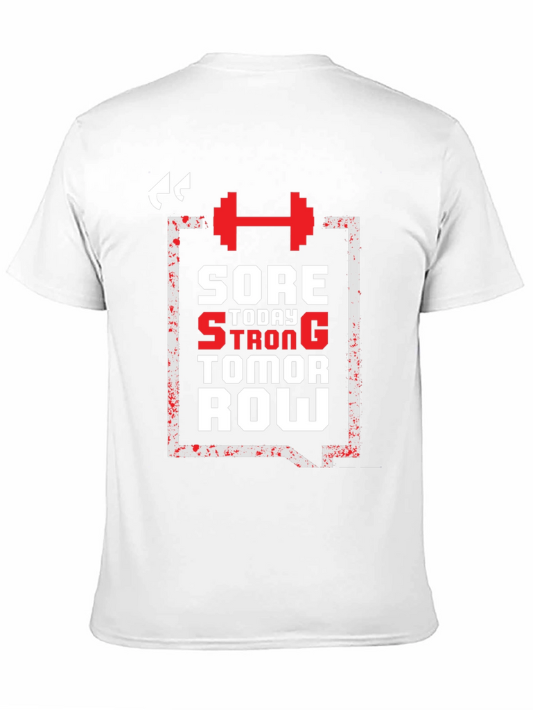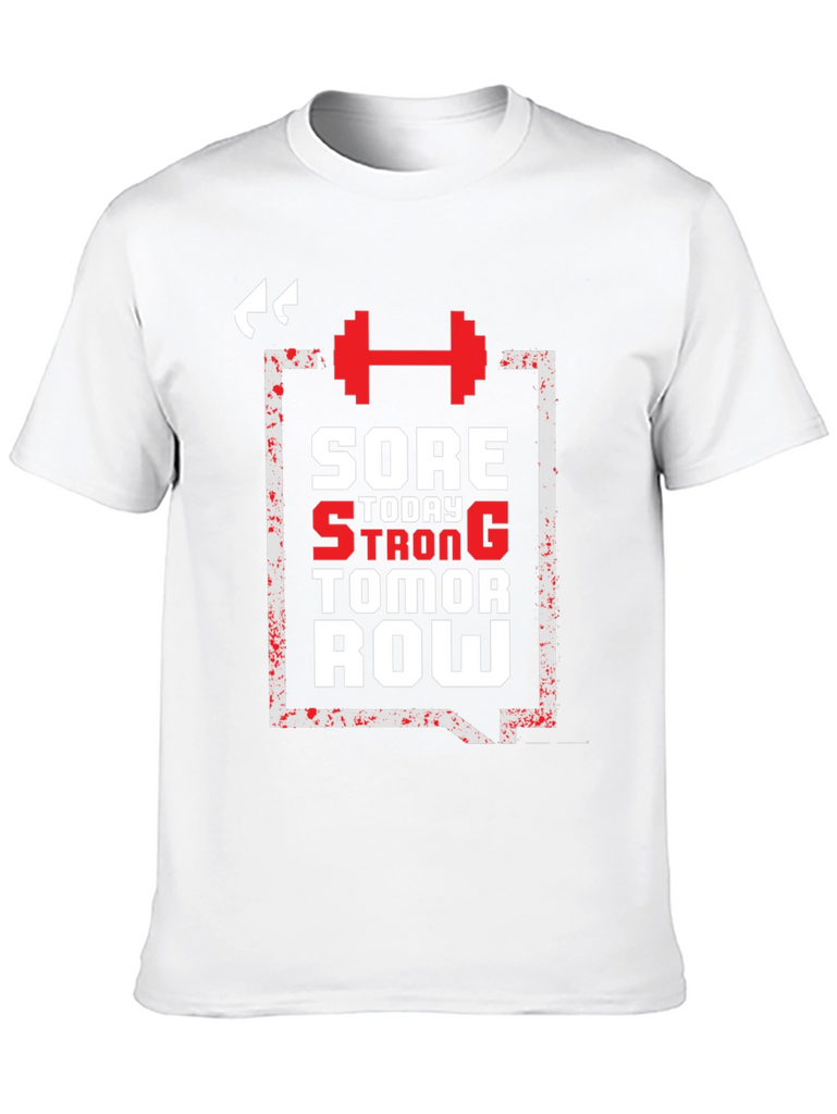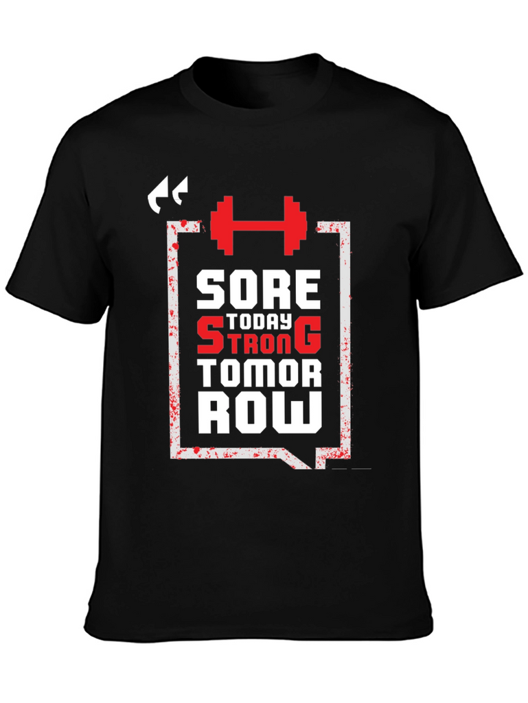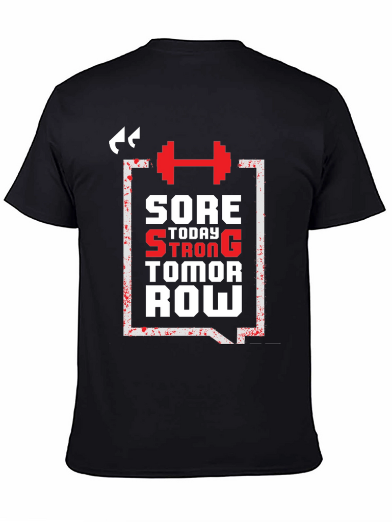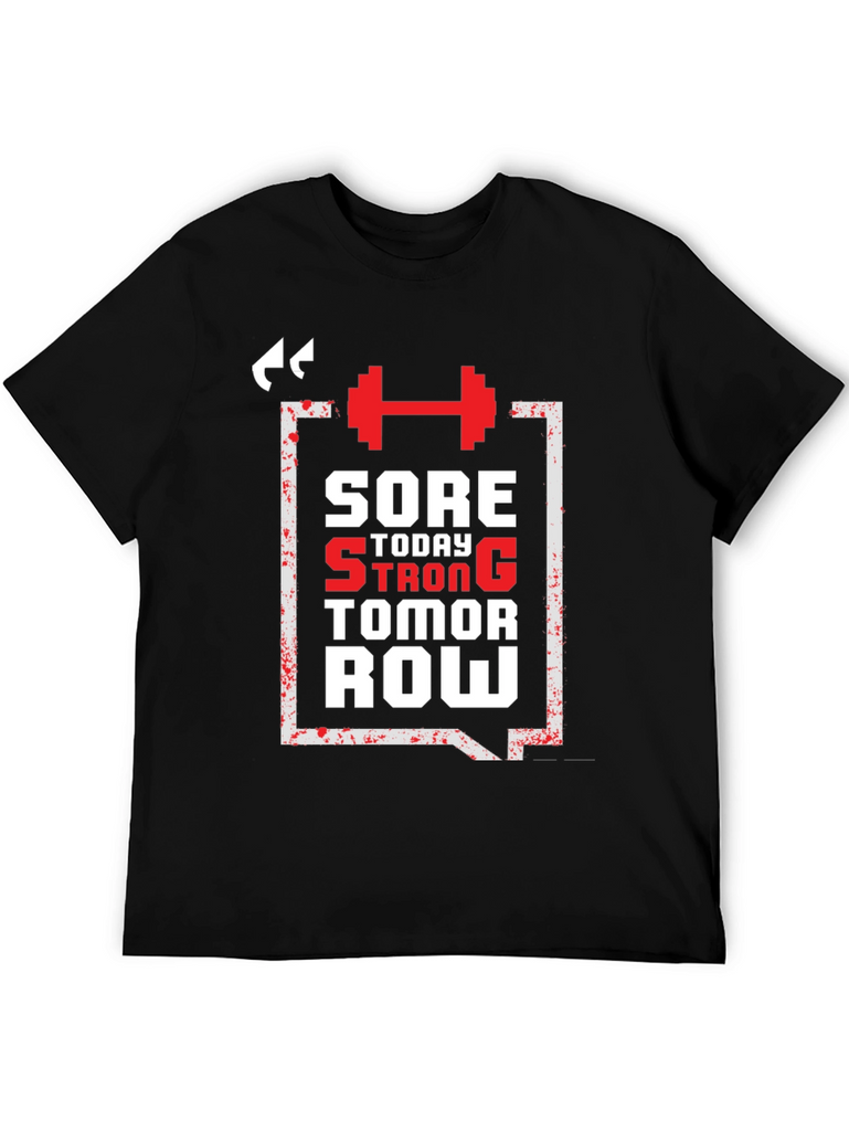 Show your dedication to fitness with this eye-catching black graphic tee. This shirt features a unique pixelated design of a barbell above the words 'Sore Today Strong Tomorrow Row' inside a rectangular border. The bold lettering and vibrant red accents create a striking contrast against the black background. Made from a comfortable-looking fabric, this t-shirt is perfect for workouts at the gym, casual outings, or lounging at home. Wear it as a statement of your commitment to strength and perseverance.