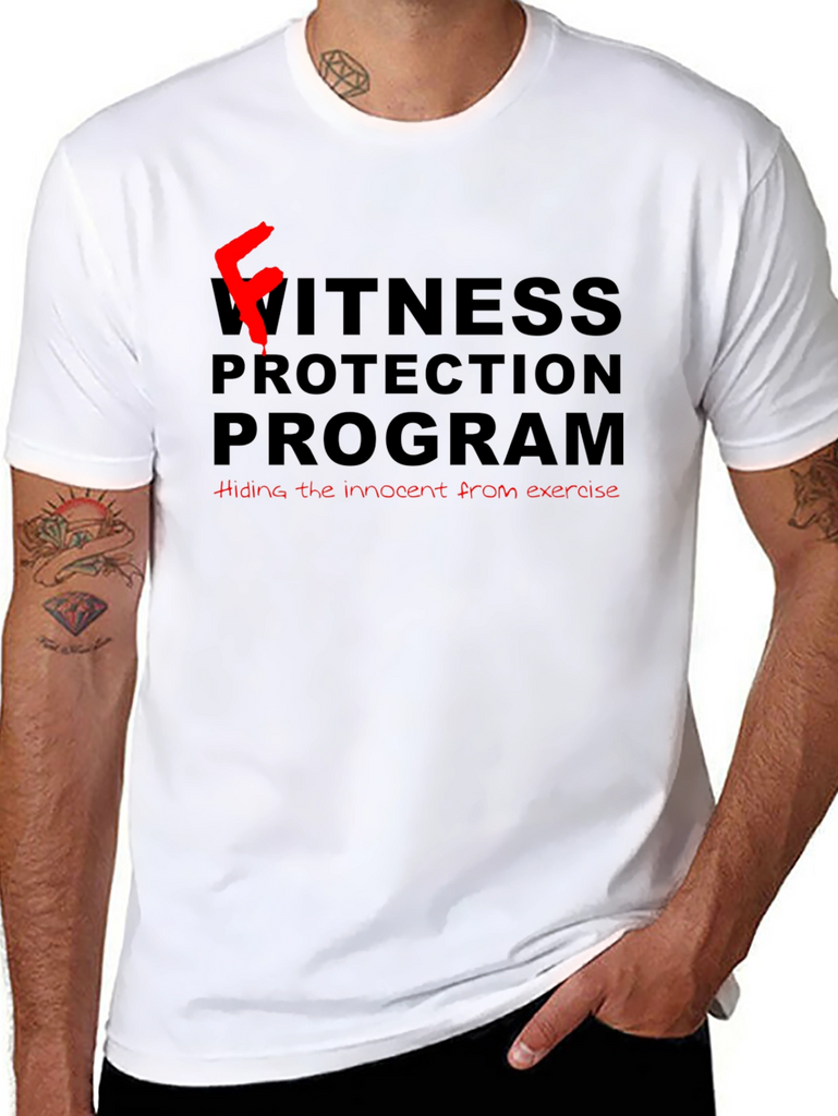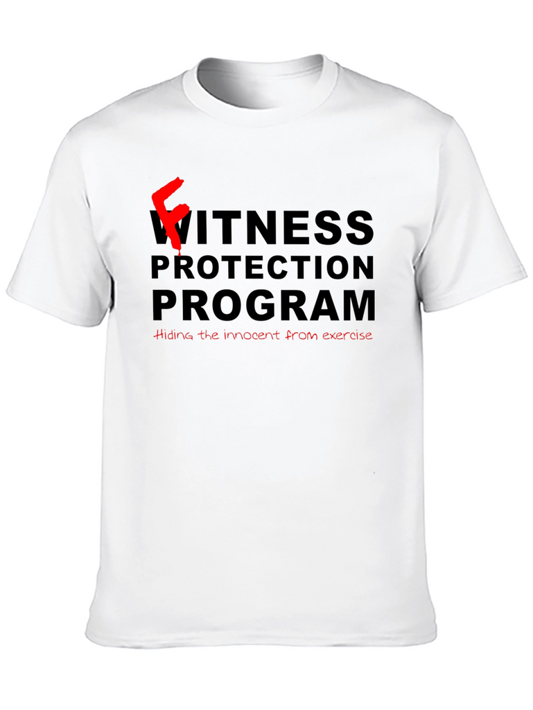 Stay protected from exercise with this humorous black t-shirt. Featuring a bold "Fitness Protection Program" design in contrasting red and black, this tee is perfect for those who prefer relaxation over rigorous workouts. The playful text and relaxed fit make it an ideal conversation starter, showcasing your unique sense of humor. Crafted from comfortable materials, this shirt is perfect for casual outings, lounging at home, or making a statement at social gatherings. Embrace your inner couch potato with this fun and relatable tee!