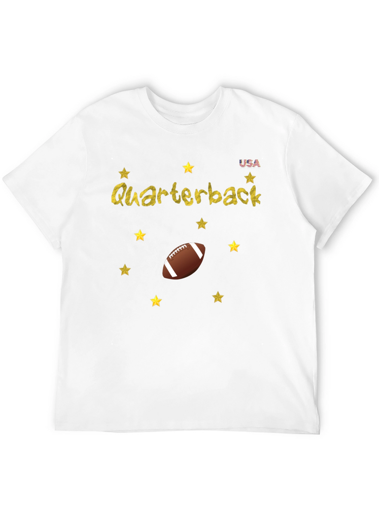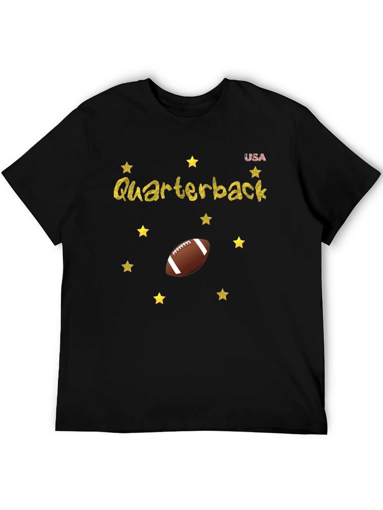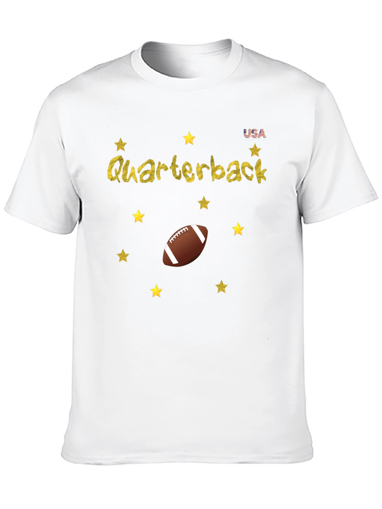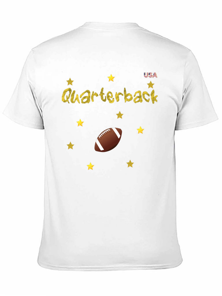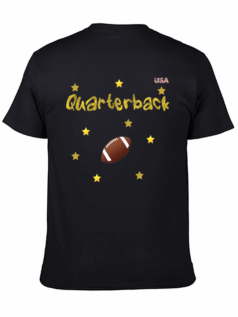 Show off your love for the game with this stylish black t-shirt! Featuring the word 'Quarterback' in a vintage gold font, it's surrounded by golden stars and a classic brown football. The design gives off a fun, sporty vibe perfect for game day or casual wear. Made from a soft, comfortable material, this tee will keep you feeling great whether you're watching the game or out with friends. It's a must-have for any football fan's wardrobe. Represent your team with style and comfort!