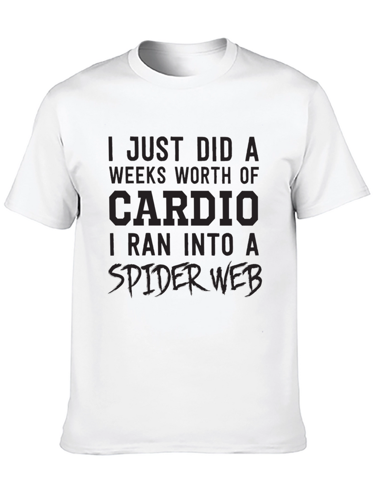 This humorous black t-shirt features the witty phrase, "I Just Did A Weeks Worth Of Cardio I Ran Into A Spider Web". The text is printed in a matching black color, giving it a slightly distressed or faded look. Made from a soft, comfortable fabric, this tee is perfect for casual wear. Show off your quirky sense of humor with this unique shirt, ideal for workouts, lounging at home, or running errands. A great conversation starter that highlights the lighter side of fitness, or perhaps the lack thereof.