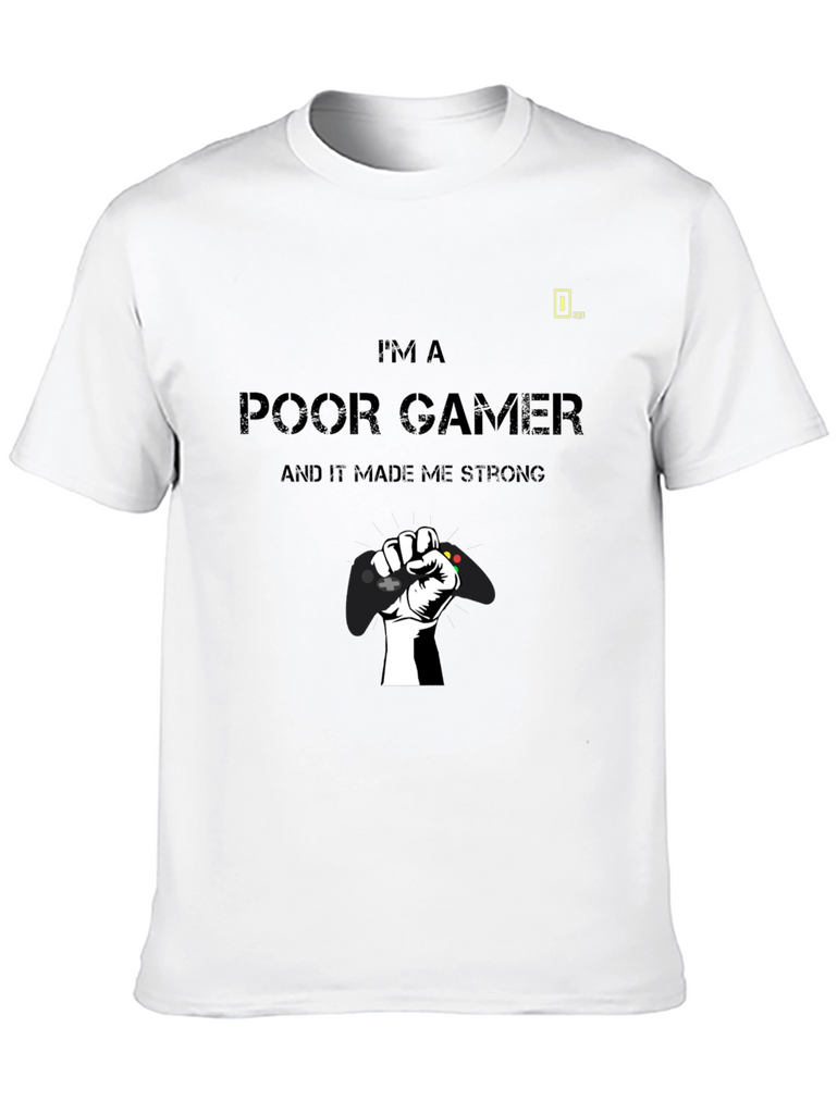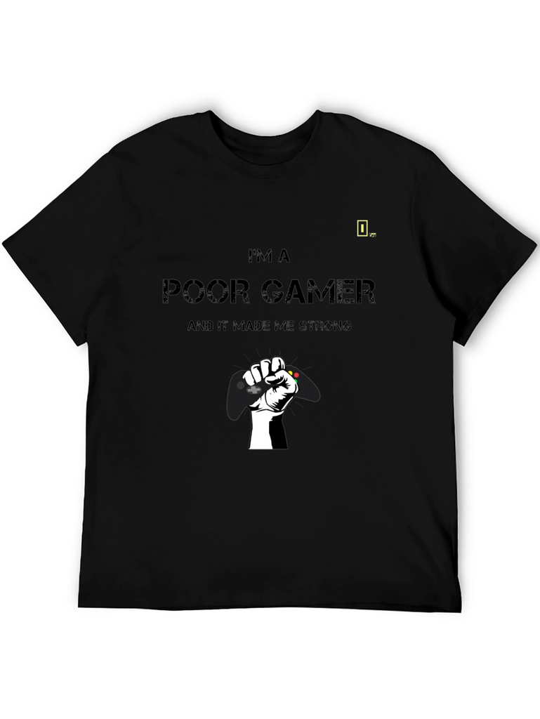 Show off your gaming pride with this black graphic tee. Featuring the text "I'm A Poor Gamer and it Made Me Strong", and a fist holding a controller. This tee is perfect for casual wear, gaming events, or just lounging around. Made from comfortable materials, it's ideal for everyday wear.