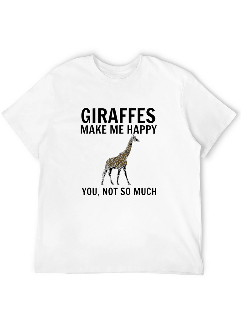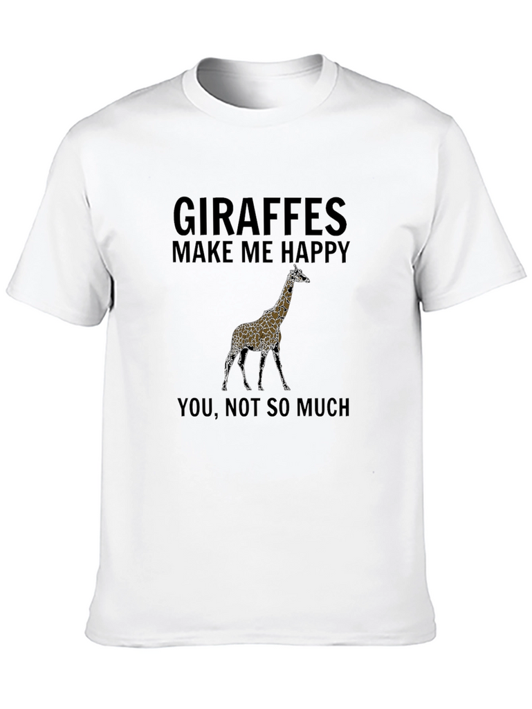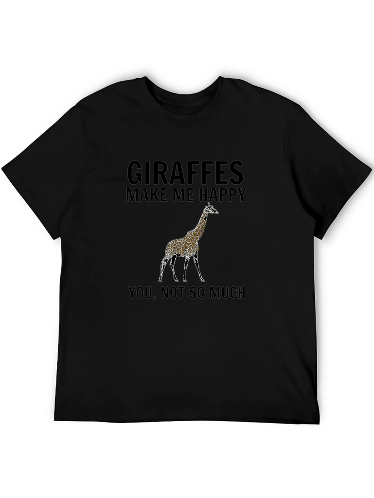 Show off your love for giraffes with this fun and quirky graphic tee! This black t-shirt features the phrase "GIRAFFES MAKE ME HAPPY. YOU, NOT SO MUCH" along with a unique giraffe graphic in the center. The shirt appears to be made from a soft and comfortable material, perfect for everyday wear. This novelty shirt is ideal for casual outings, lounging at home, or as a fun gift for the giraffe lover in your life. Its witty design is sure to spark conversations and bring smiles. Grab yours today and let everyone know where your true affections lie!