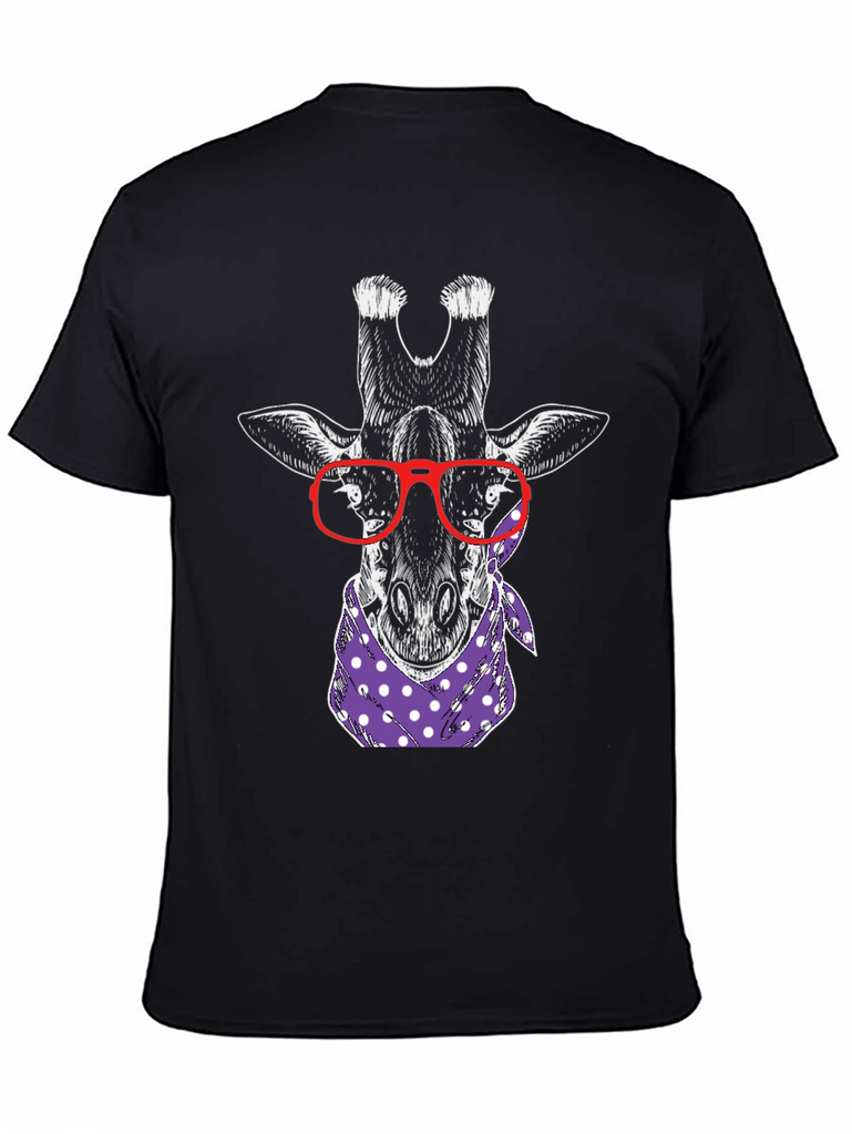 Show off your wild side with this unique black t-shirt featuring a cool giraffe graphic! This tee features a monochrome giraffe design wearing trendy red glasses and a stylish purple bandana with white polka dots. The design offers a playful and quirky aesthetic. Made from a comfortable, breathable fabric, this shirt is perfect for everyday wear or casual outings. Pair it with jeans or shorts for a relaxed look. A perfect gift for animal lovers and those who appreciate unique fashion.