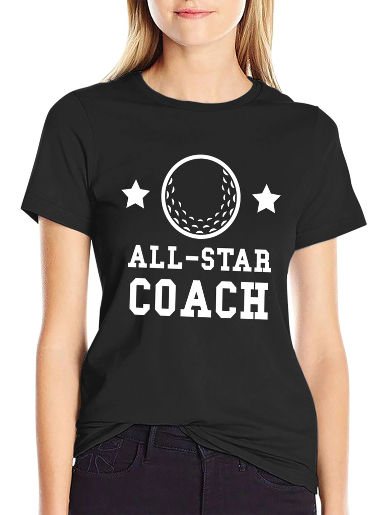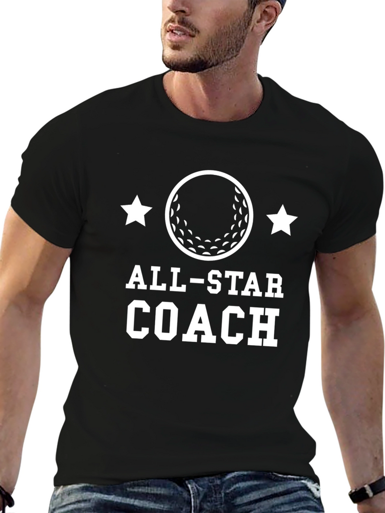Show your appreciation for the all-star coach in your life with this unique t-shirt. This black tee features a bold, white graphic design, including a golf ball image flanked by two stars, above the text "ALL-STAR COACH". Made from a comfortable, breathable fabric, this shirt is perfect for wearing on and off the golf course. The classic fit ensures a relaxed and stylish look. This t-shirt is an ideal gift for coaches, mentors, or anyone who loves golf and deserves recognition for their stellar performance.