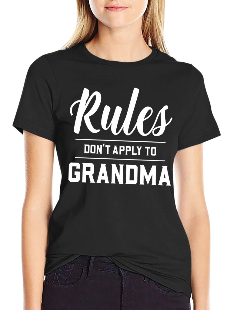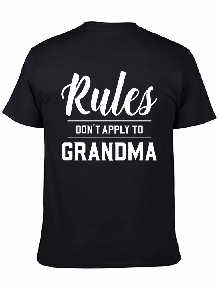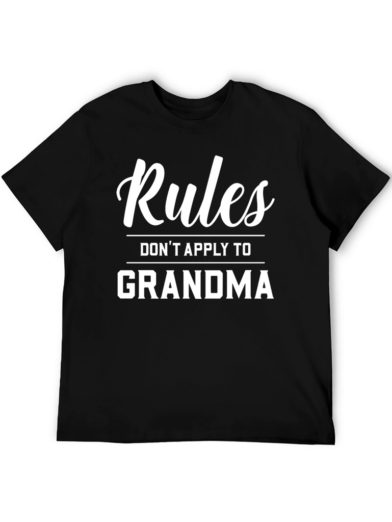 Show off your love for grandma with this stylish black t-shirt! Featuring the humorous quote "Rules Don't Apply to Grandma" in a bold white font, this tee is sure to be a conversation starter. Made from a comfortable-looking fabric, this classic fit t-shirt is perfect for casual wear, family gatherings, or as a fun gift for your favorite grandma-loving person. Durable and eye-catching, this t-shirt combines comfort and a playful message. Get yours today!