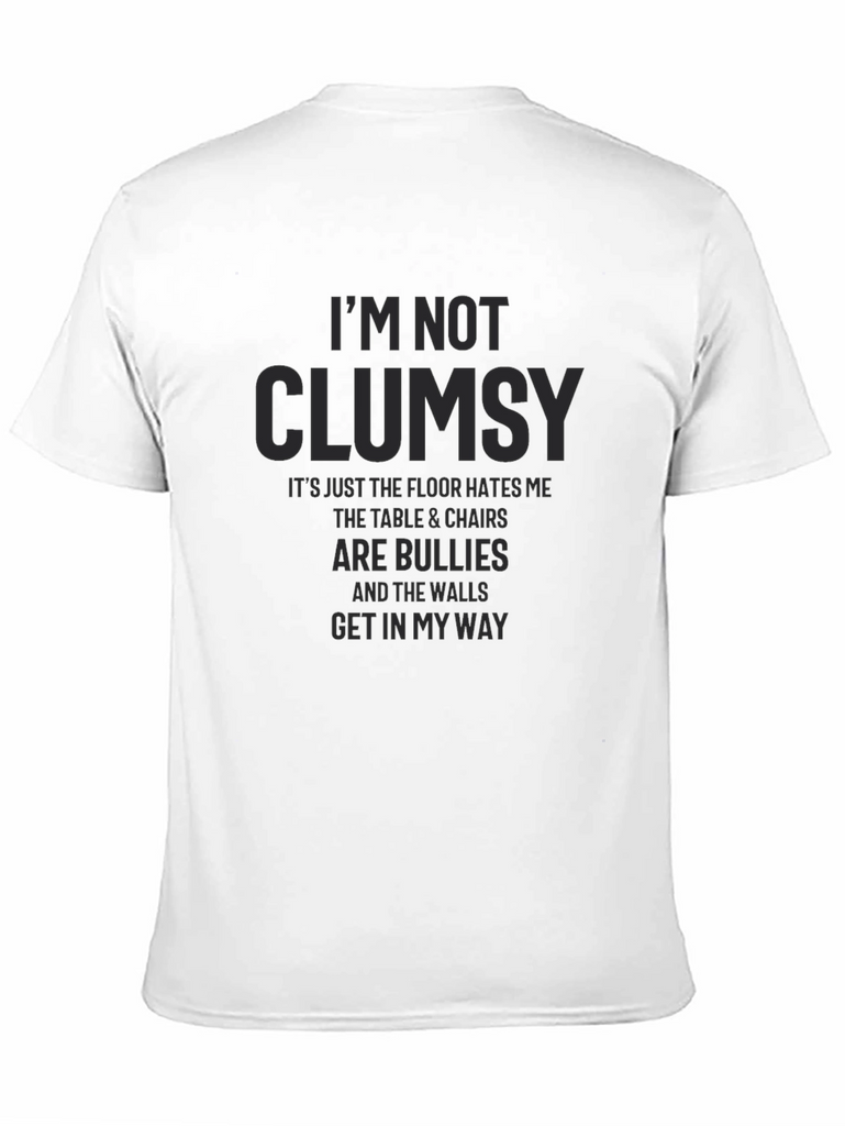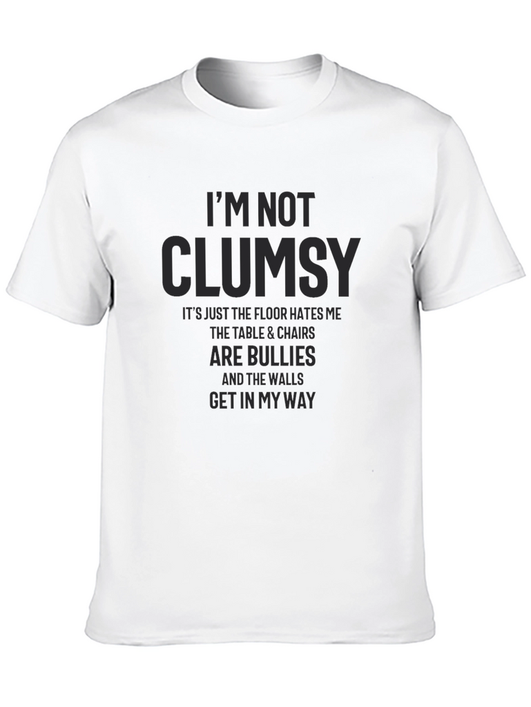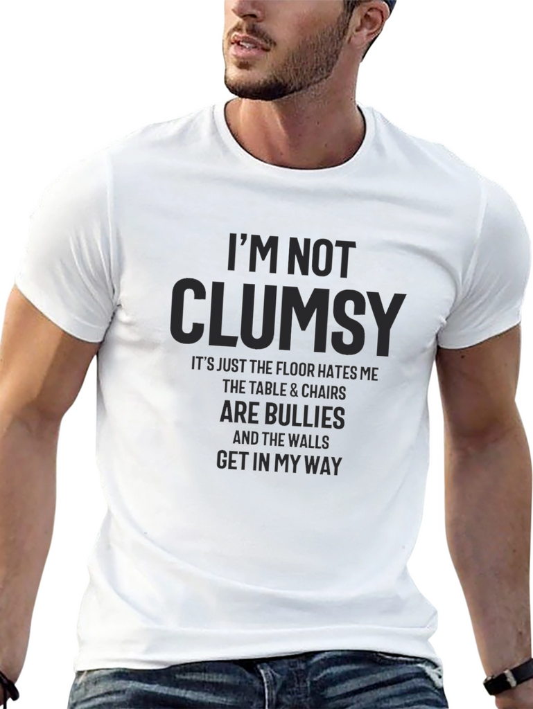 This black graphic tee features a humorous saying: "I'M NOT CLUMSY. It's just the floor hates me, the table & chairs are bullies, and the walls get in my way." This tee offers a comfortable fit and casual style. The dark print is a light grey or very dark shade of grey. Perfect for everyday wear. Add a touch of humor to your wardrobe with this conversation-starting piece. Dress it up or down with jeans or shorts for versatile styling. A great gift idea for those who always seem to be running into things.