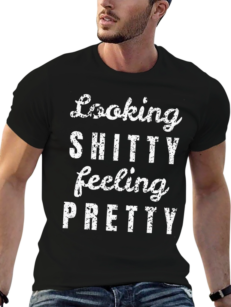 Express your unique style with this bold black graphic tee. The shirt features the humorous statement "Looking Shitty Feeling Pretty" in a crisp, white font, making it a fun and relatable addition to your casual wardrobe. Made from comfortable, breathable fabric, this tee is perfect for everyday wear. The classic fit makes it versatile for pairing with jeans, shorts, or skirts. Ideal for casual outings, lounging at home, or making a statement wherever you go. Show off your sense of humor and embrace your individuality with this eye-catching tee.