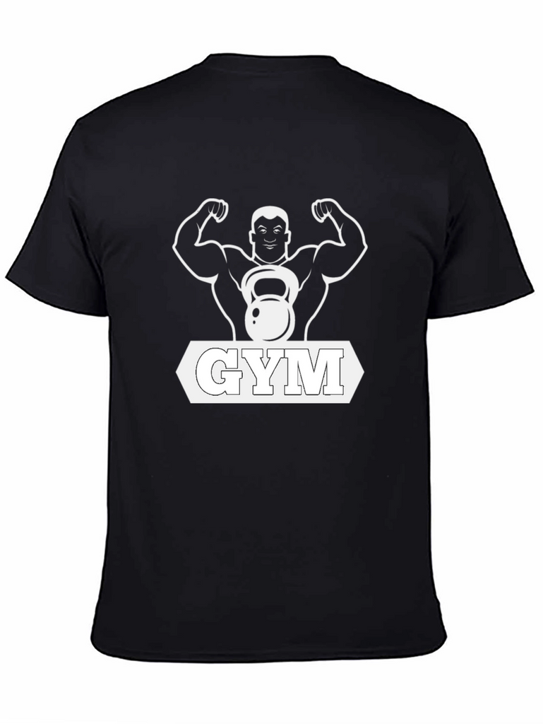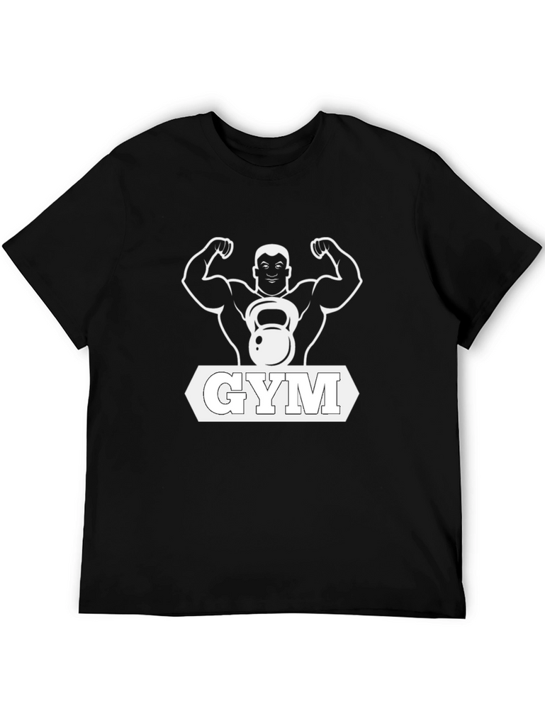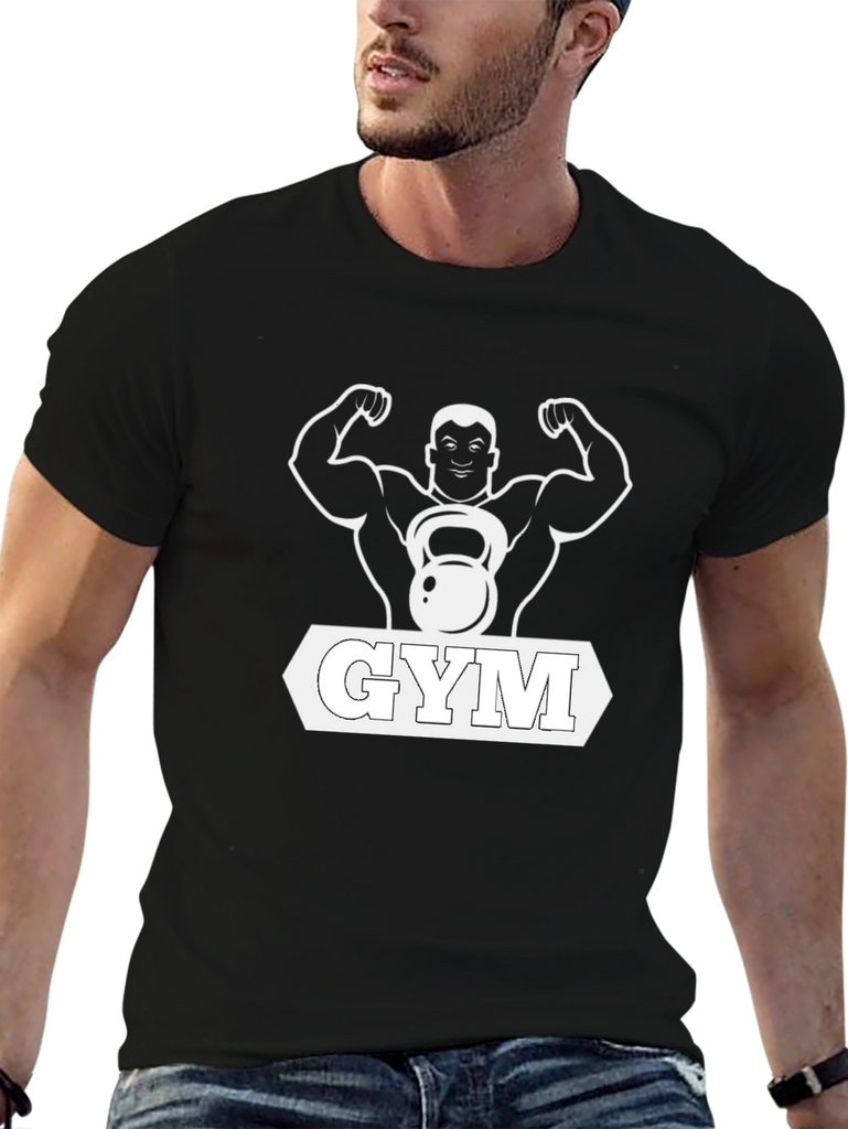 Show your dedication to fitness with this bold black t-shirt. Featuring a striking white graphic, this tee showcases a muscular figure lifting a kettlebell, complemented by the word "GYM" in a clean, modern font. Made from a soft, comfortable fabric, this t-shirt is perfect for workouts or casual wear. Its eye-catching design makes it a great conversation starter at the gym or on the street. The classic crew neck and short sleeves offer a relaxed fit. Wear your passion with this gym-inspired tee!