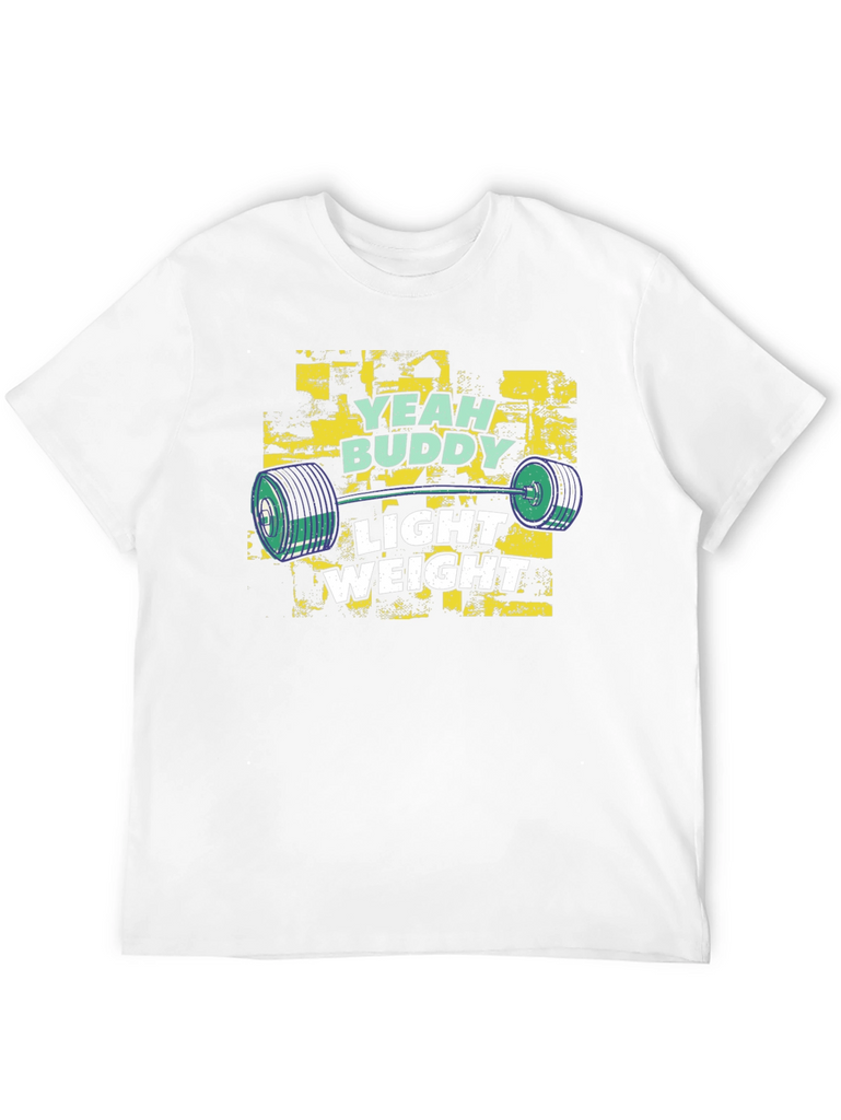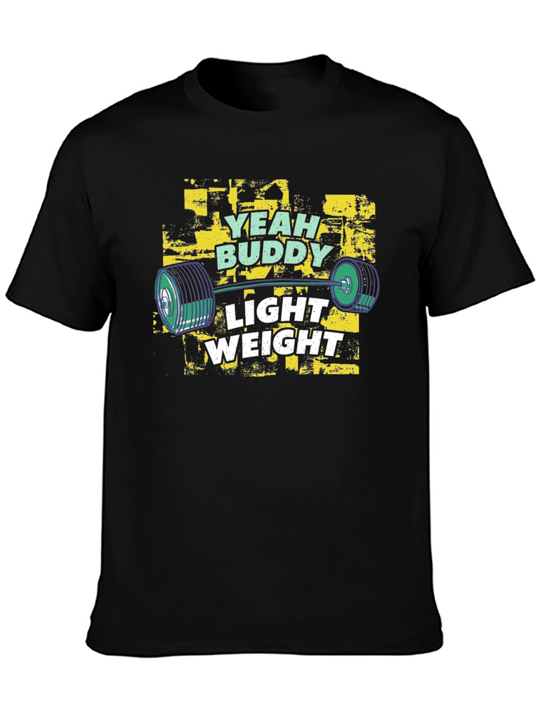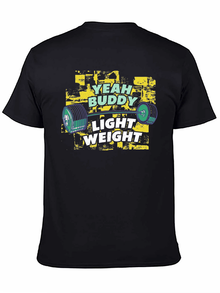 Show off your love for fitness with this stylish black t-shirt. The shirt features a vibrant graphic design with the text "Yeah Buddy" and "Light Weight" printed above and below a barbell image. The design incorporates a distressed, grunge-style background. Made from a comfortable, soft fabric, this shirt is perfect for workouts or casual wear. This t-shirt is an ideal choice for gym-goers, weightlifters, and fitness enthusiasts who want to express their passion for training. The regular fit ensures comfortable and stylish wear, suitable for any casual occasion or workout session.