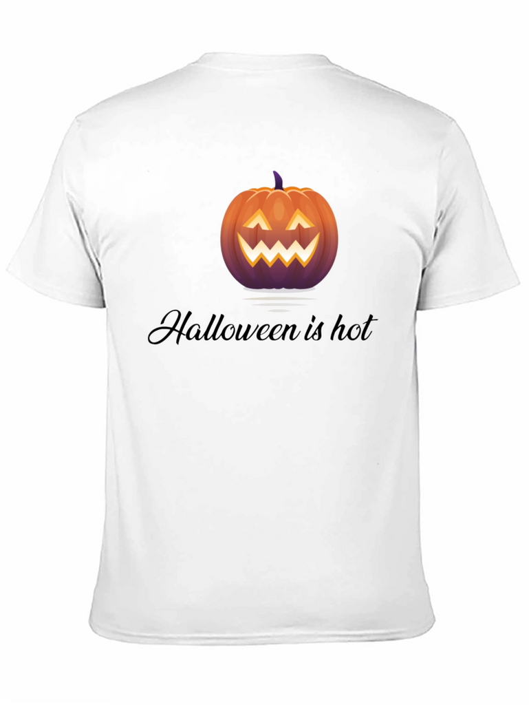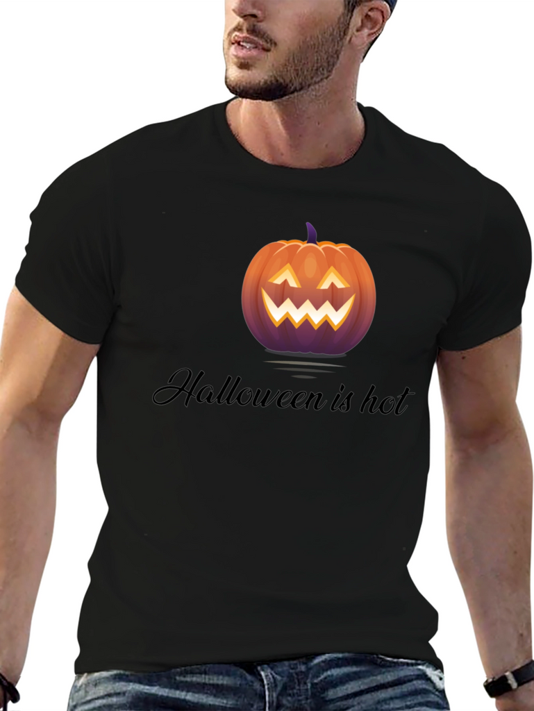 Show off your Halloween spirit with this unique black graphic tee. The shirt features a vibrant cartoon-style pumpkin design, complete with a glowing carved face and playful purple accents. Underneath the pumpkin, the text "Halloween is hot" is displayed in a cursive script. Made from comfortable, breathable fabric, this t-shirt is perfect for casual wear, Halloween parties, or festive events. Stand out from the crowd and embrace the Halloween season with this stylish and eye-catching tee. The classic fit makes it a versatile addition to any wardrobe.