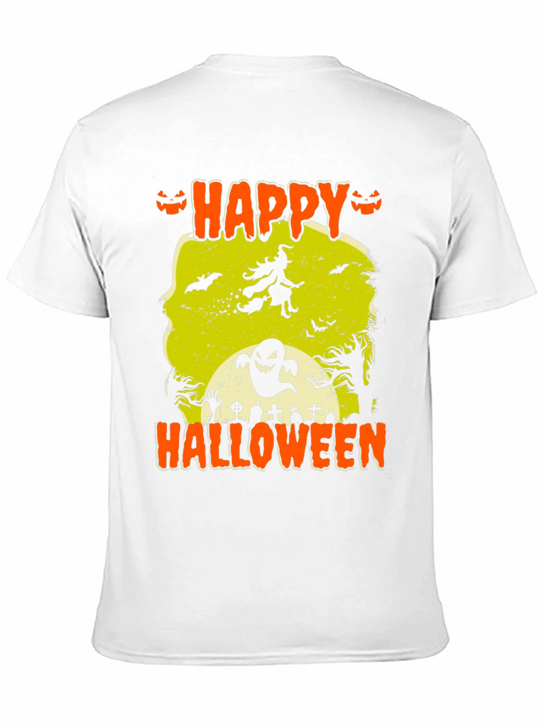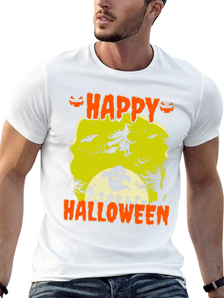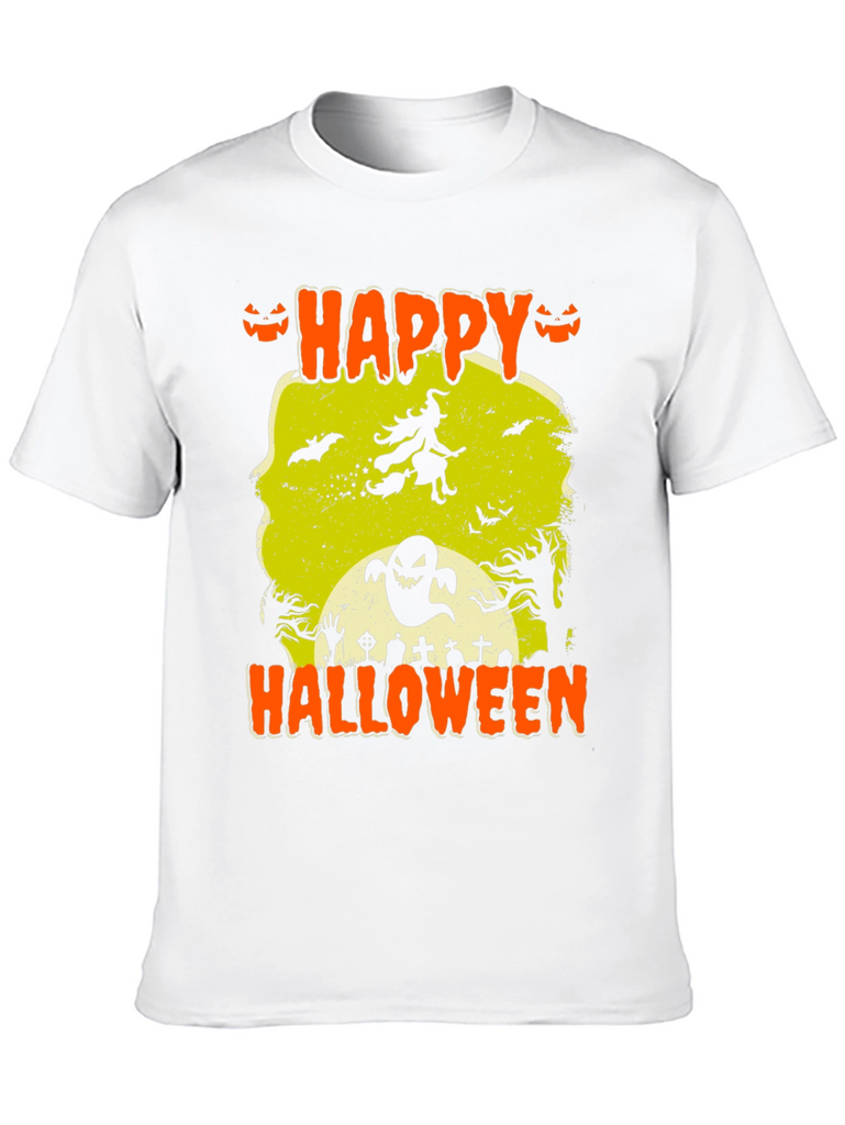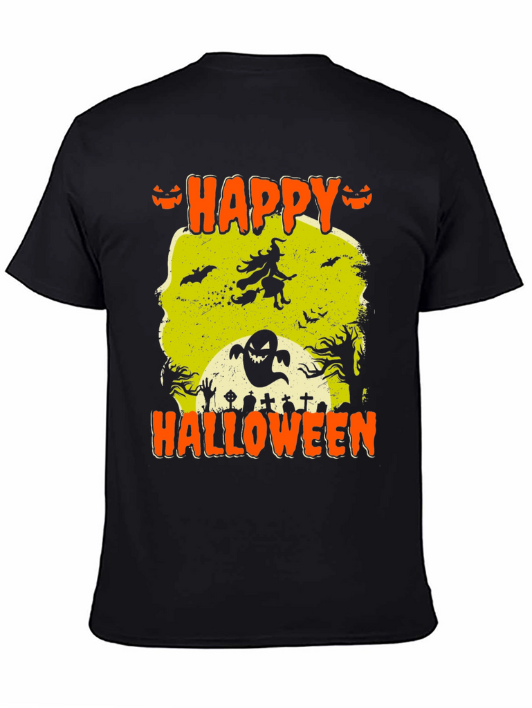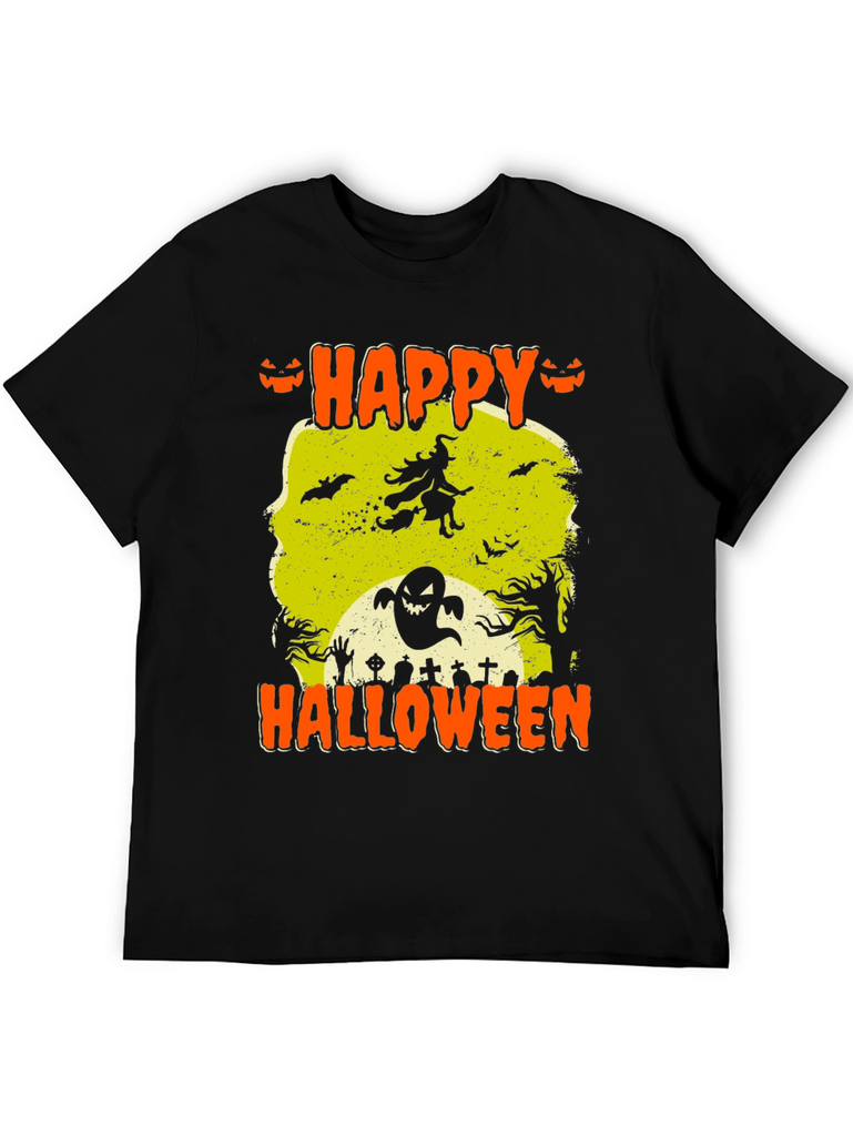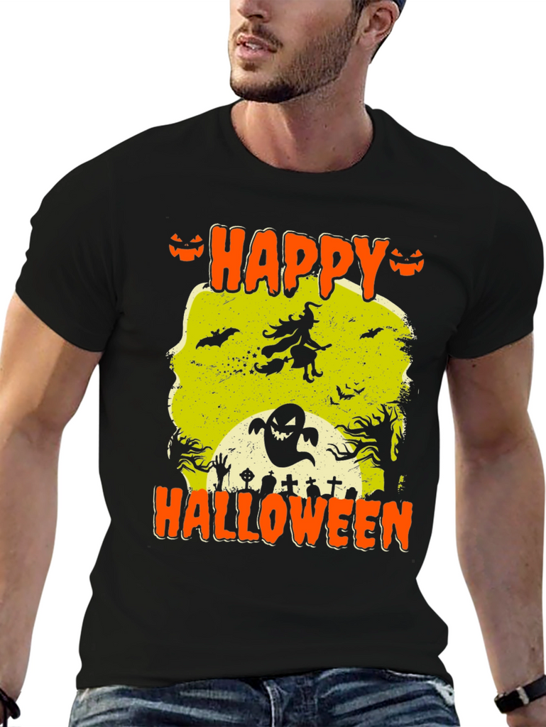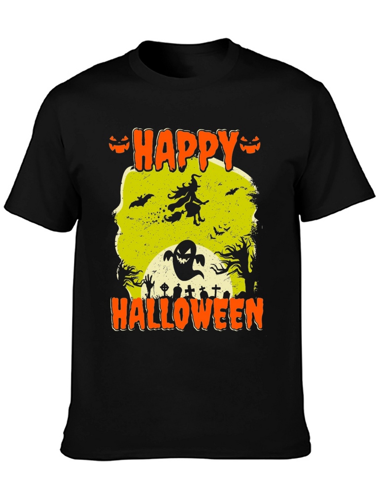 Get ready for spooky season with this Halloween-themed graphic tee! This black t-shirt features a vibrant and detailed Halloween design, including a witch flying across the moon, bats, gravestones, and a friendly ghost. The words 'Happy Halloween' are prominently displayed in an orange, spooky font. Made from a comfortable-looking fabric, this t-shirt is perfect for Halloween parties, trick-or-treating, or just showing off your love for the holiday. Its unique design ensures you'll stand out during any Halloween event. Grab yours now and celebrate Halloween in style!