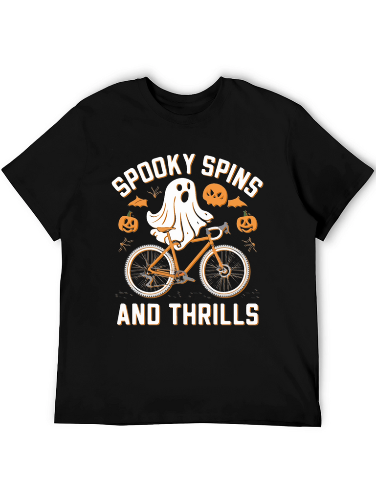 Get ready for Halloween with this unique graphic t-shirt! The design features a fun and spooky illustration of a ghost riding a bicycle, surrounded by pumpkins and bats. The playful text reads "Spooky Spins and Thrills," making it a perfect shirt for the spooky season. Made from comfortable material, this black t-shirt is ideal for casual wear, Halloween parties, or bike rides. Show off your Halloween spirit with this eye-catching and comfortable tee!