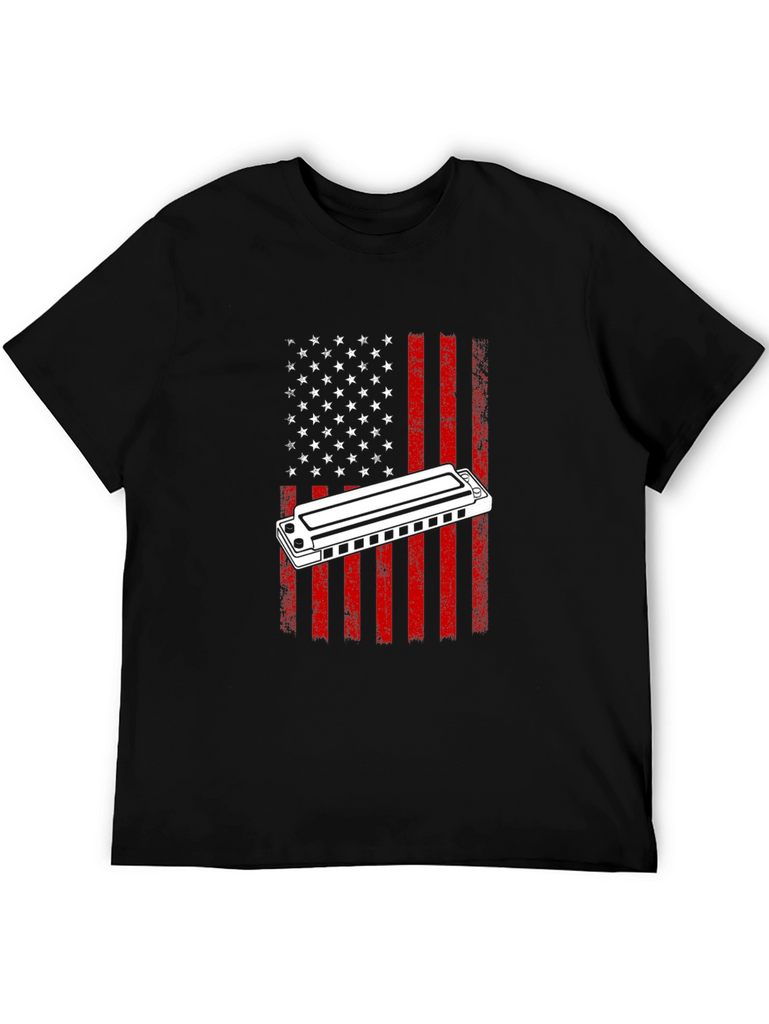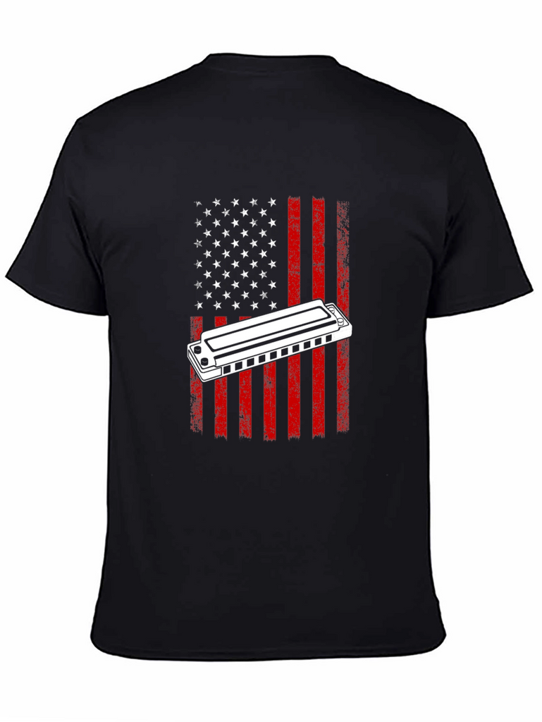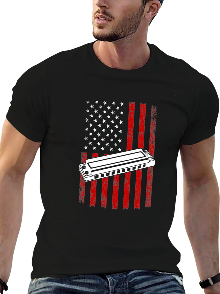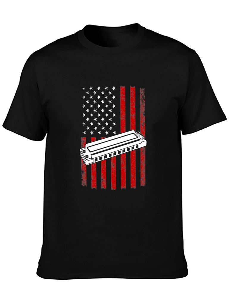 Showcase your love for music and country with this unique t-shirt! This stylish black tee features a bold graphic of an American flag with a harmonica overlayed, making it a perfect statement piece. Made from a soft, comfortable fabric, it's ideal for casual wear, music festivals, or showing off your patriotic spirit. Whether you're a musician, a music enthusiast, or simply want to express your American pride, this t-shirt is a great addition to your wardrobe. Pair it with jeans or shorts for a relaxed look.