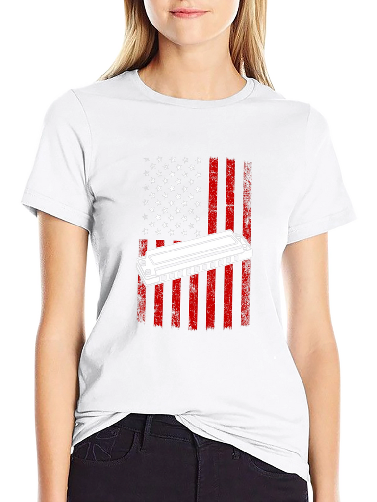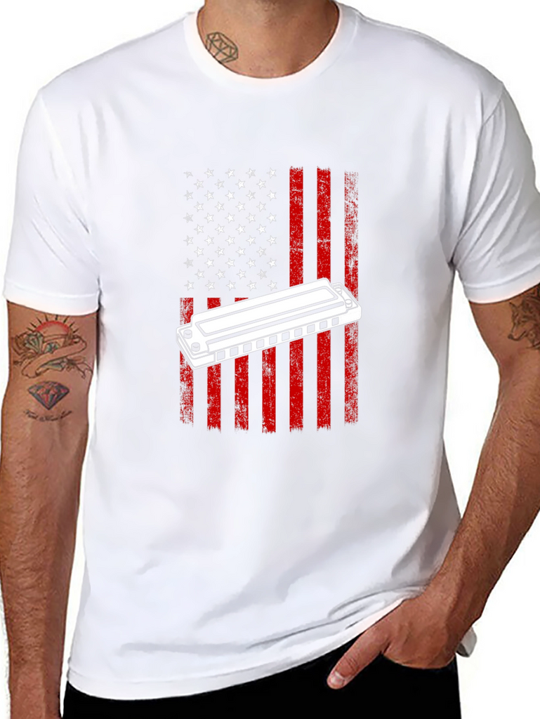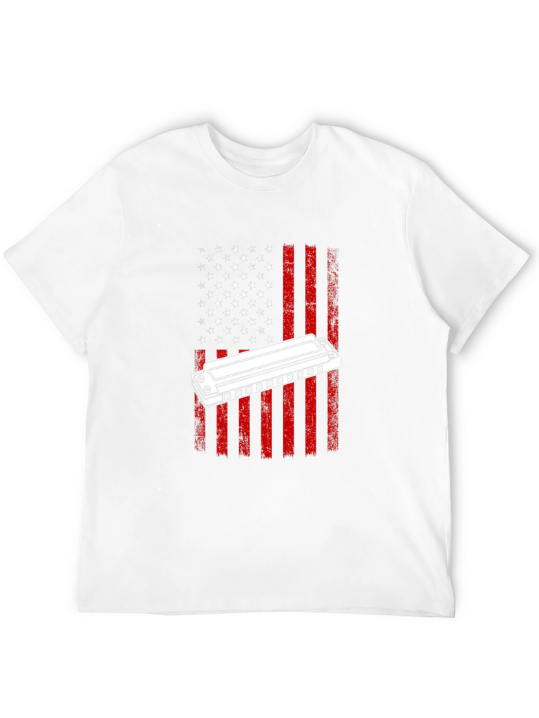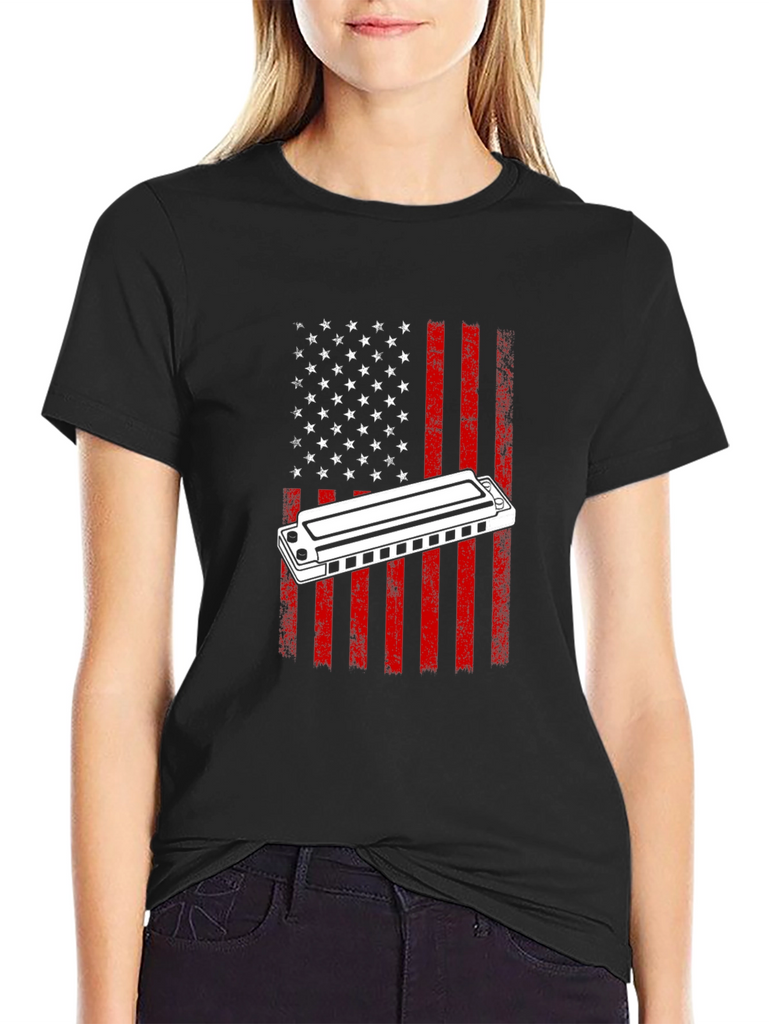 Showcase your love for music and country with this unique t-shirt! This stylish black tee features a bold graphic of an American flag with a harmonica overlayed, making it a perfect statement piece. Made from a soft, comfortable fabric, it's ideal for casual wear, music festivals, or showing off your patriotic spirit. Whether you're a musician, a music enthusiast, or simply want to express your American pride, this t-shirt is a great addition to your wardrobe. Pair it with jeans or shorts for a relaxed look.