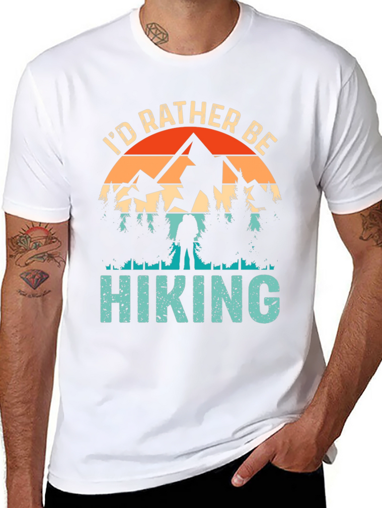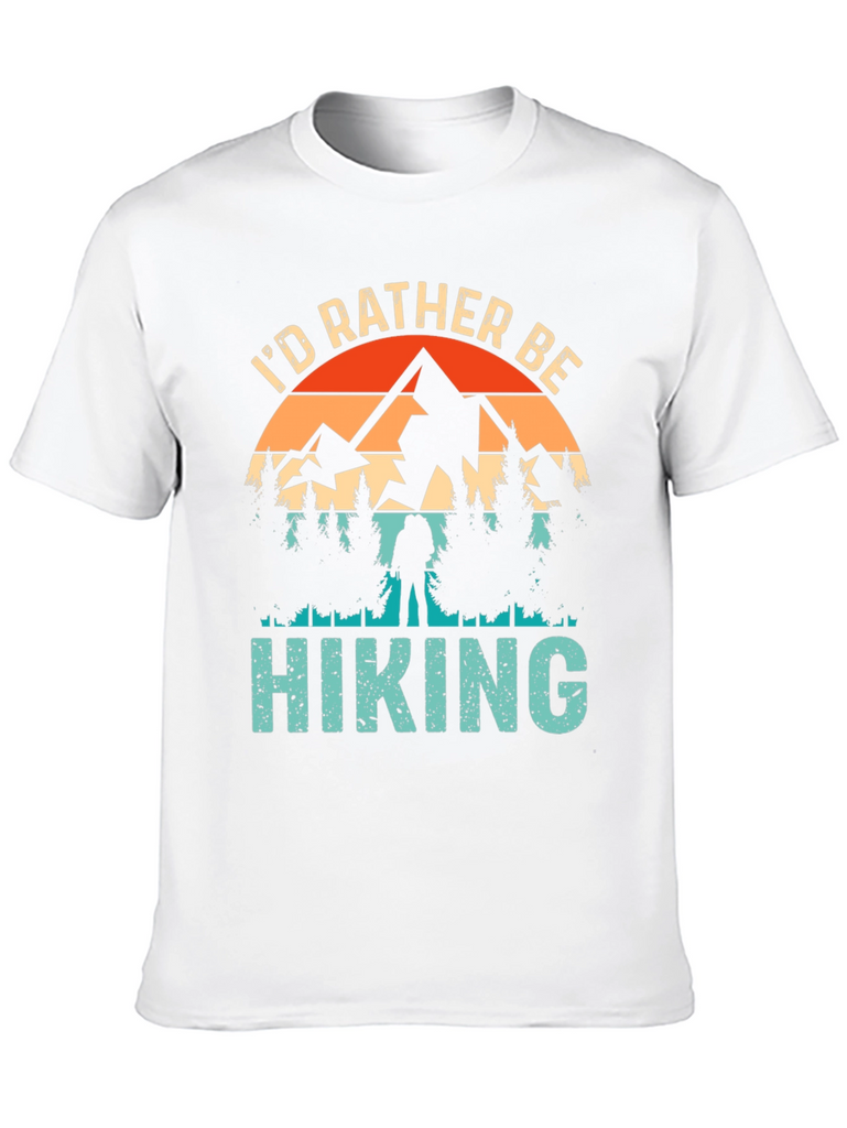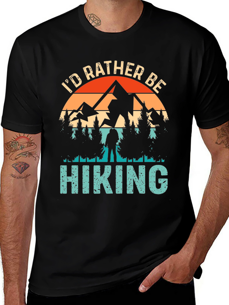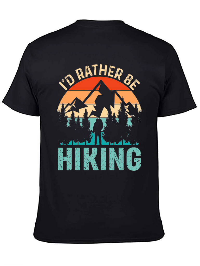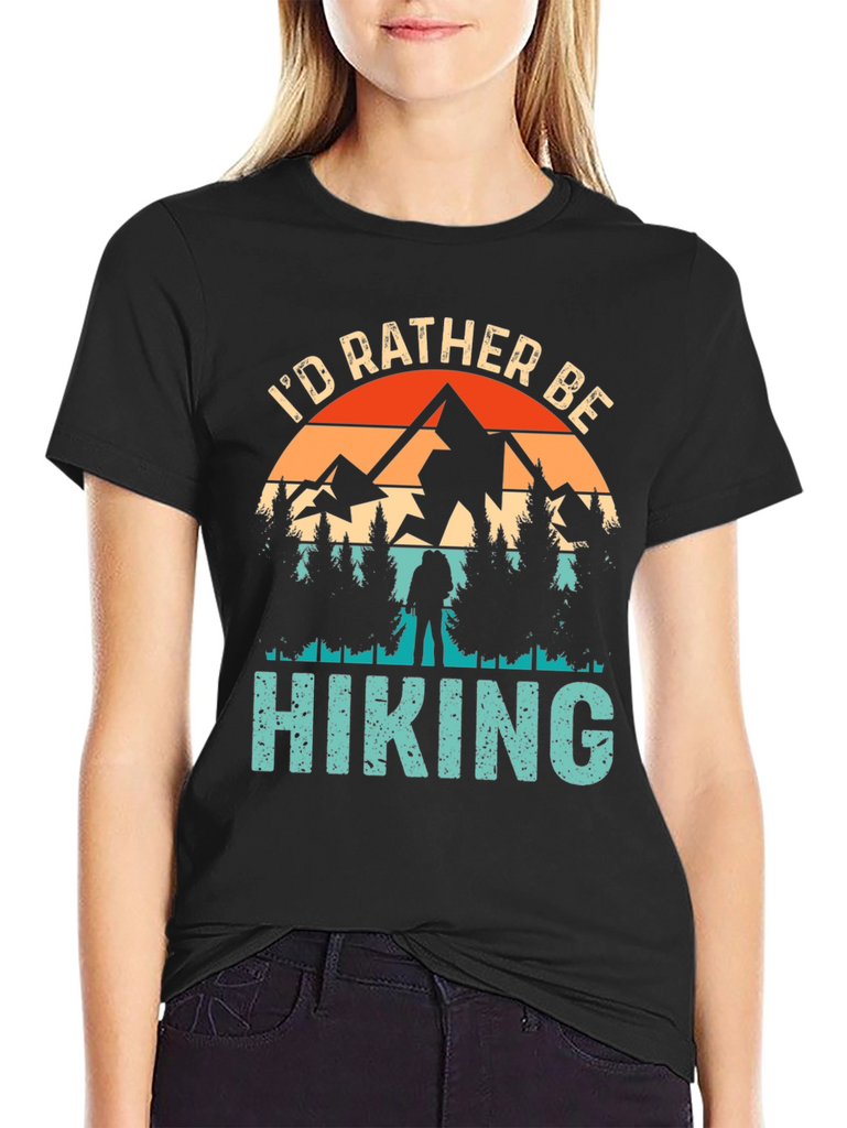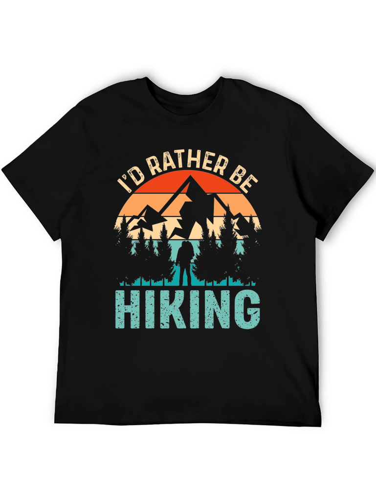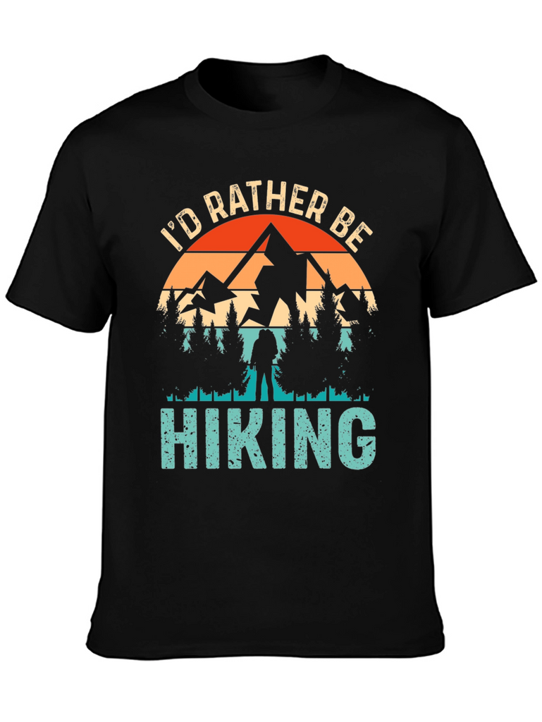 Embrace the great outdoors with this classic hiking tee! Featuring a vintage-inspired sunset design with mountains, trees, and a hiker silhouette, this shirt speaks to the adventurous spirit. The bold text "I'D RATHER BE HIKING" makes a statement and expresses a love for nature. Made from comfortable fabric, this black t-shirt is perfect for casual wear or your next outdoor expedition. Show off your passion for hiking, camping, and exploring with this stylish and comfortable tee.