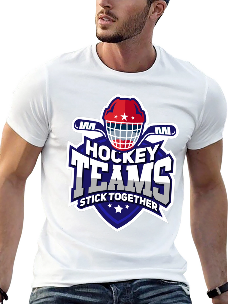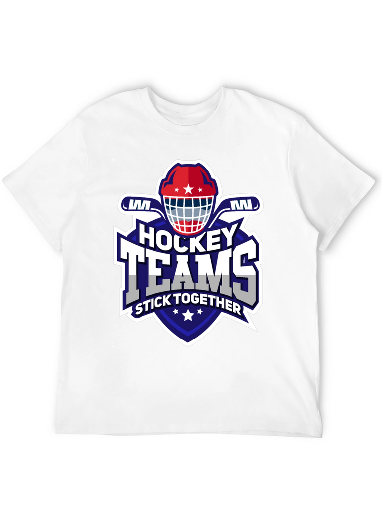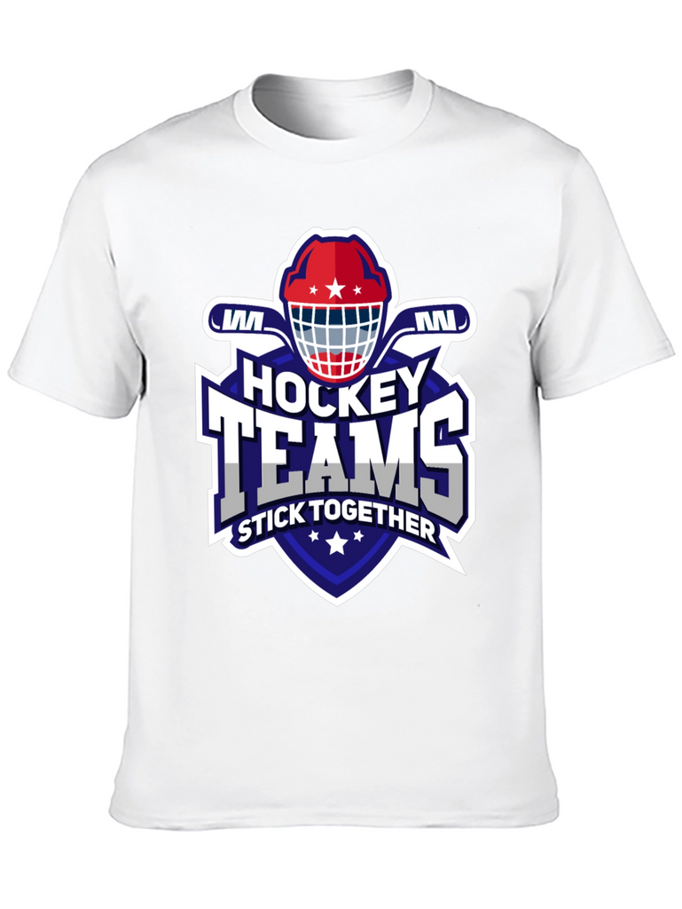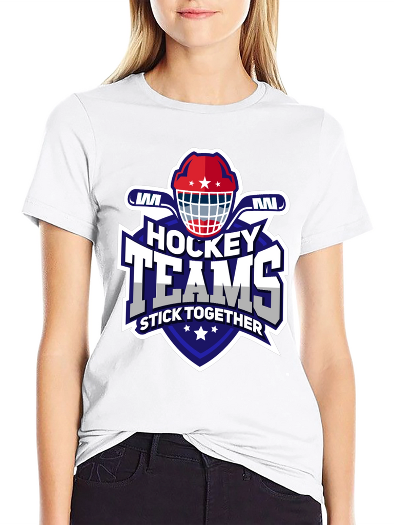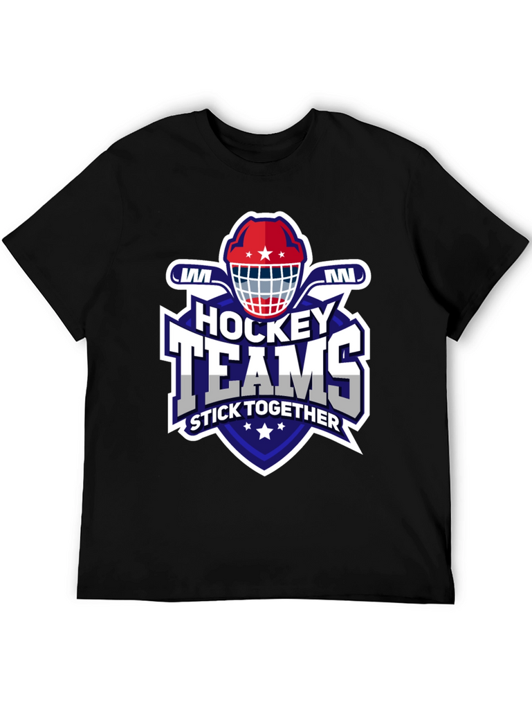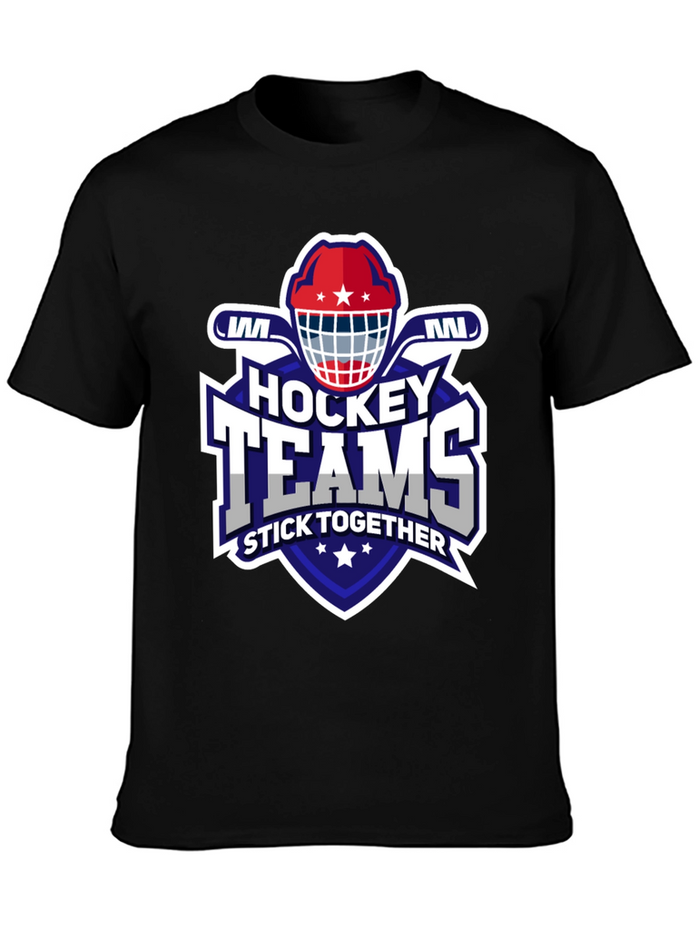 Show your love for hockey with this stylish graphic t-shirt. The design features a bold and eye-catching hockey-themed graphic with a helmet, crossed sticks, and the words "Hockey Teams Stick Together." The design utilizes a vibrant color palette of red, white, and blue. Made from soft, breathable fabric, this t-shirt offers all-day comfort and is perfect for wearing to games, practices, or just casually showing off your passion for the sport. It’s a great conversation starter and a must-have for any hockey fan's wardrobe. Ideal for players, fans, or anyone who appreciates the camaraderie and teamwork of hockey.