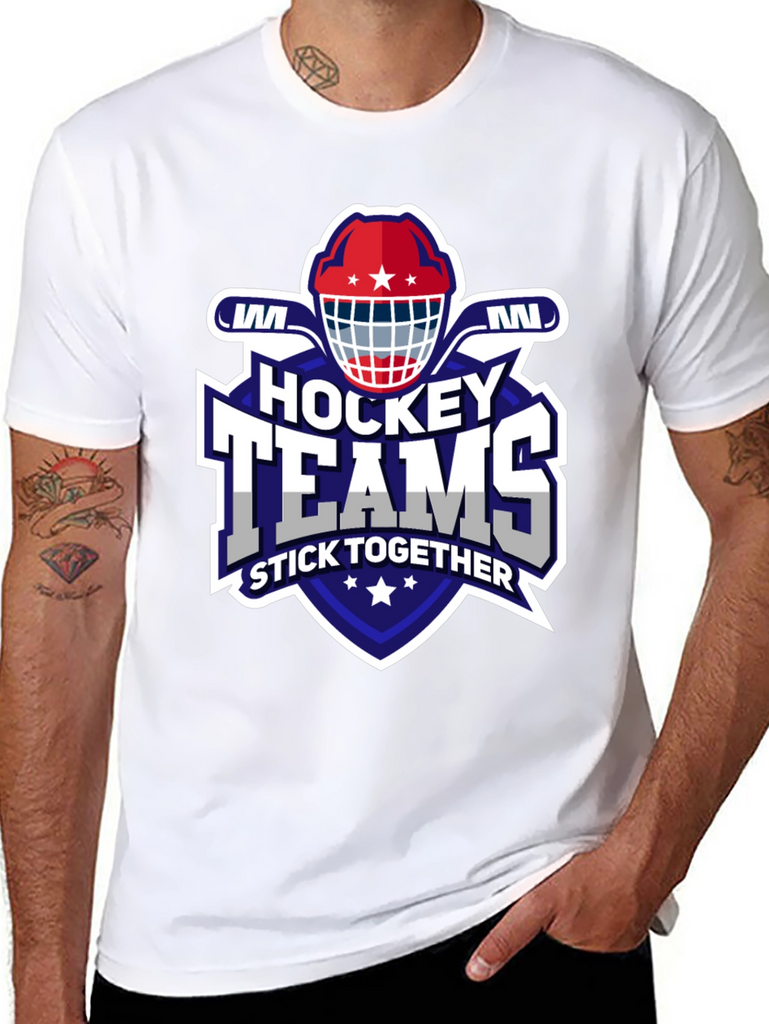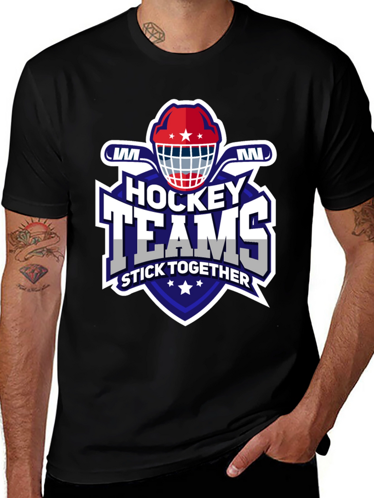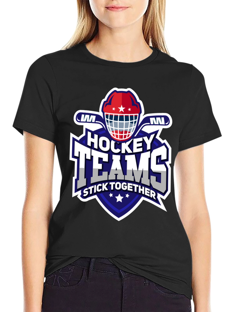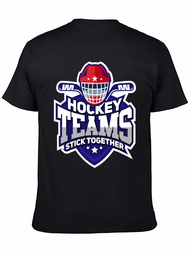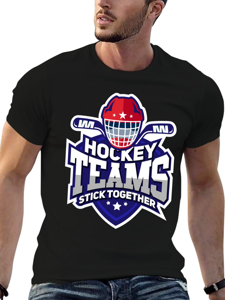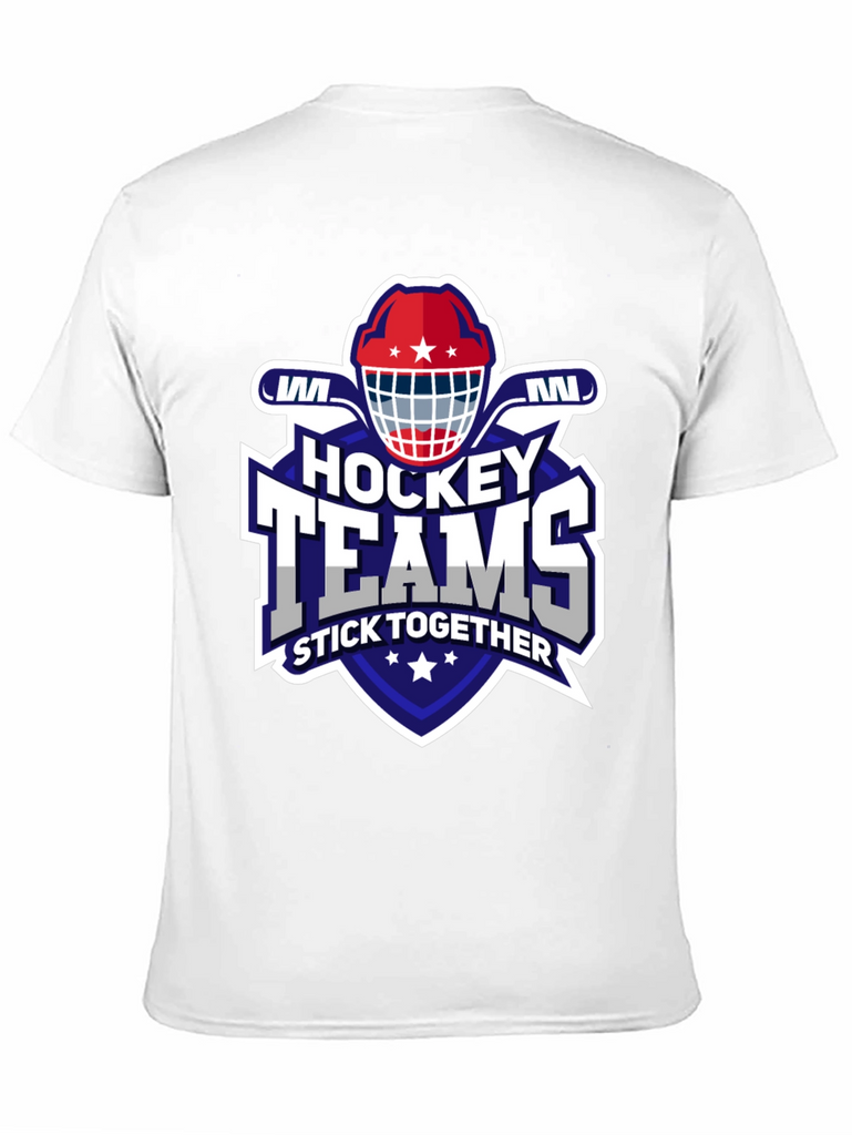 Show your love for hockey with this stylish graphic t-shirt. The design features a bold and eye-catching hockey-themed graphic with a helmet, crossed sticks, and the words "Hockey Teams Stick Together." The design utilizes a vibrant color palette of red, white, and blue. Made from soft, breathable fabric, this t-shirt offers all-day comfort and is perfect for wearing to games, practices, or just casually showing off your passion for the sport. It’s a great conversation starter and a must-have for any hockey fan's wardrobe. Ideal for players, fans, or anyone who appreciates the camaraderie and teamwork of hockey.