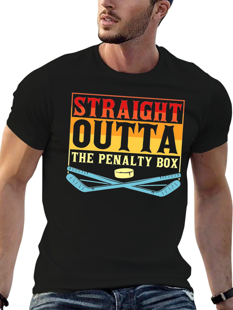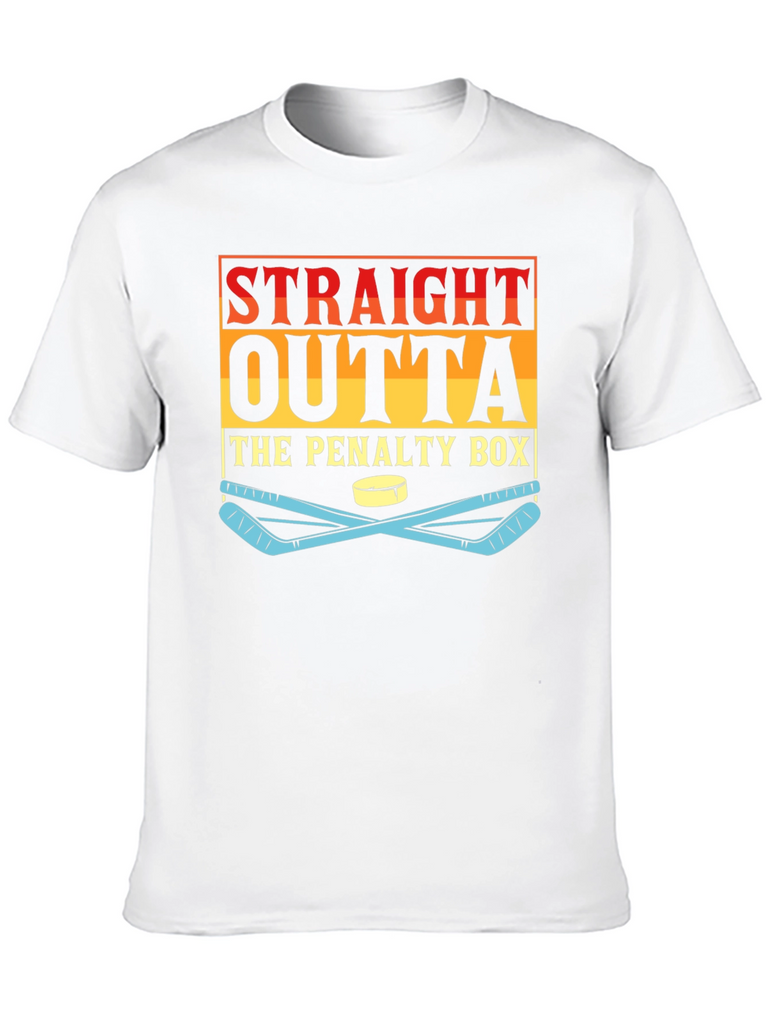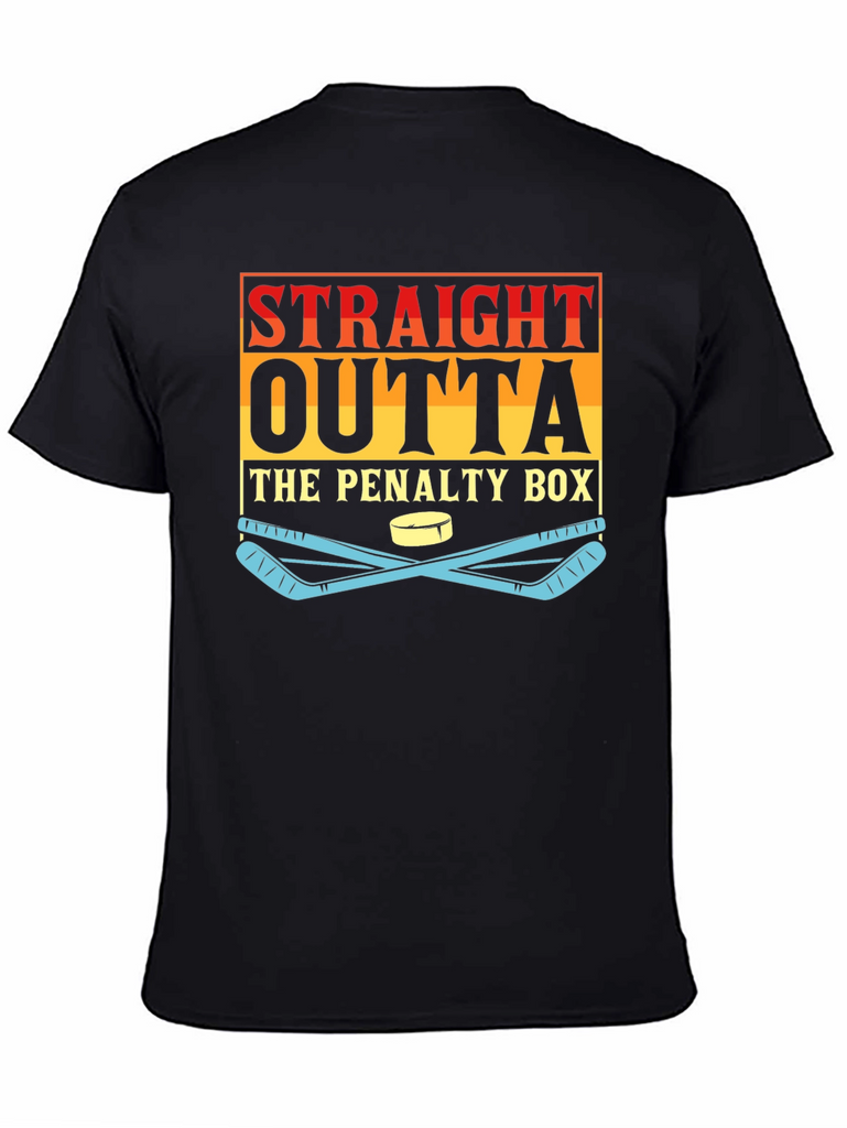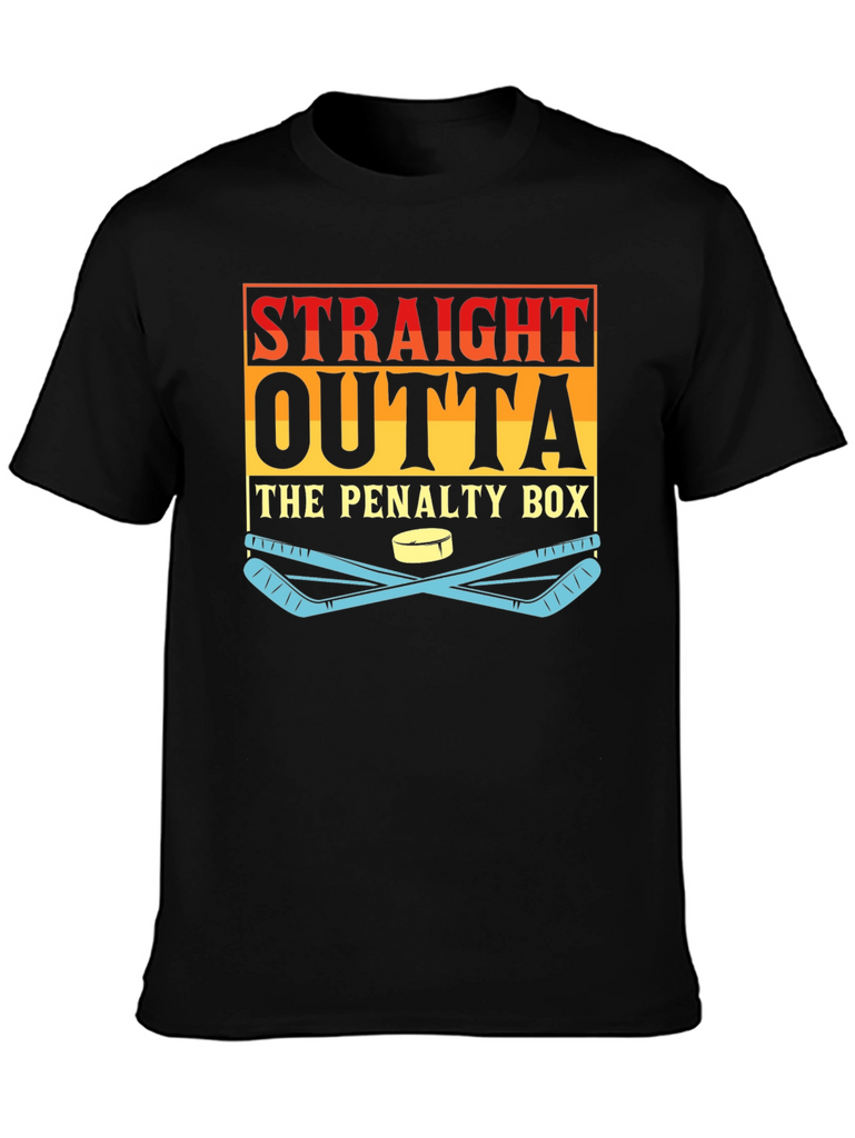 Show off your love for hockey with this unique "Straight Outta The Penalty Box" T-shirt. The shirt features a playful design with bold text and crossed hockey sticks, perfect for hockey players and fans alike. Made from comfortable material, this tee is ideal for casual wear, sports events, or hockey practice. Great way to express your passion and humor for the game, making it a cool addition to your wardrobe. Get yours today and let everyone know you're a proud hockey enthusiast!