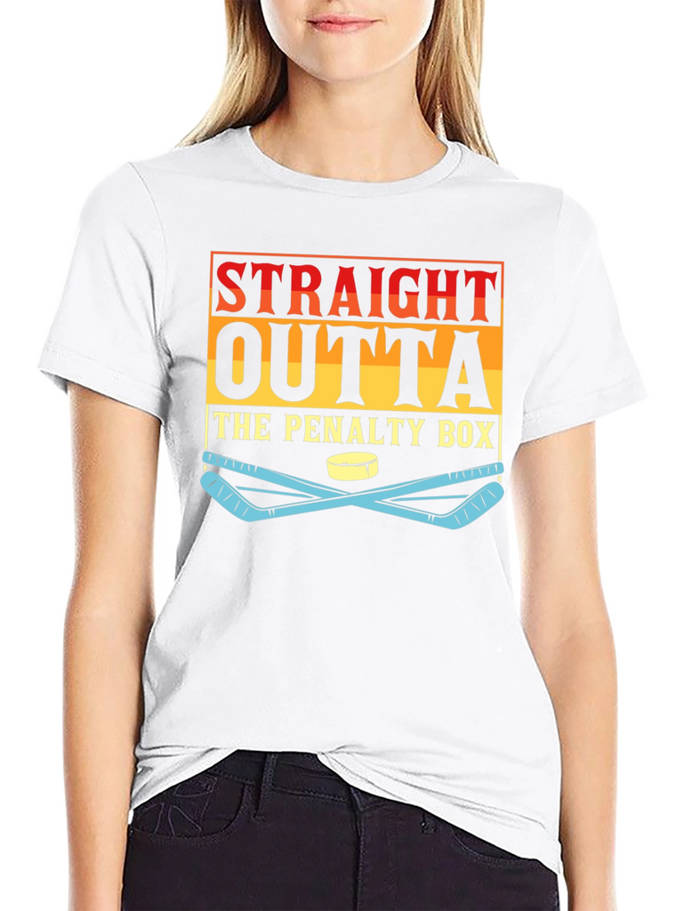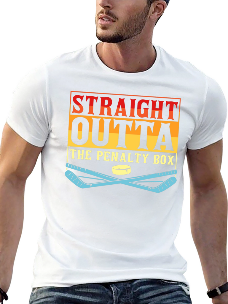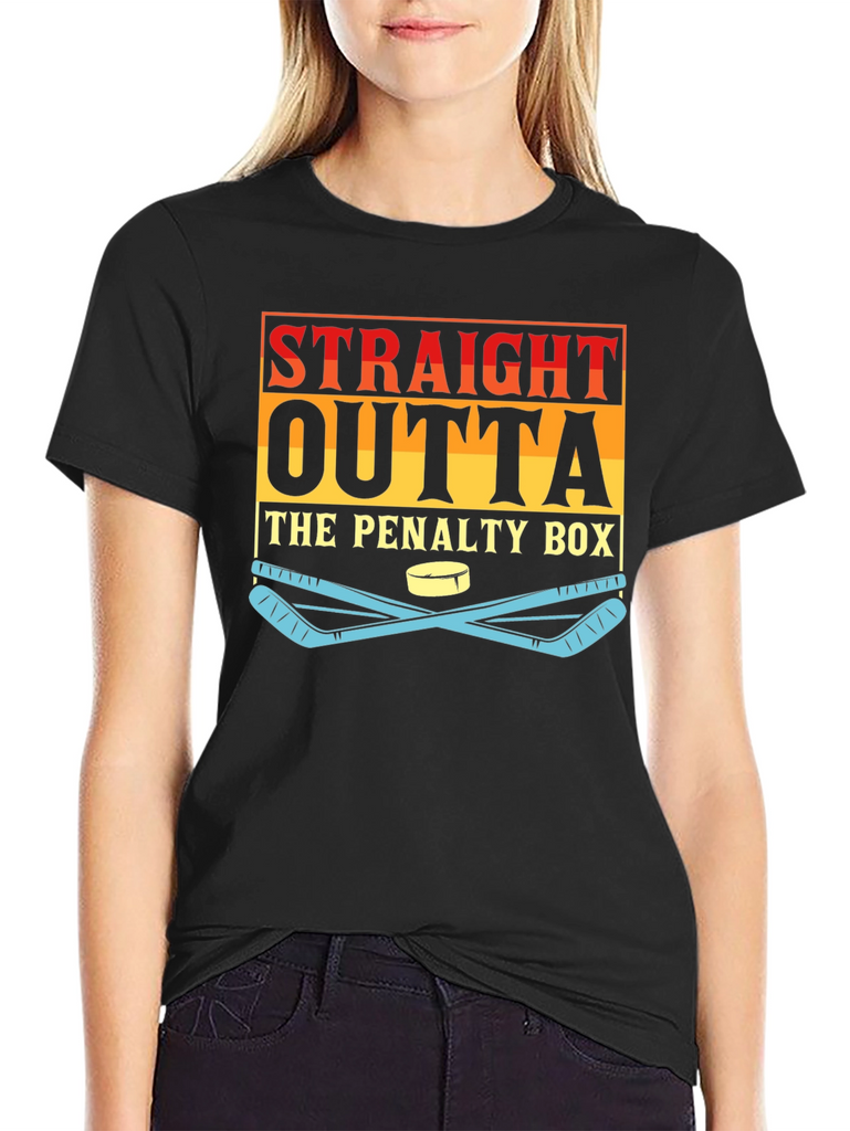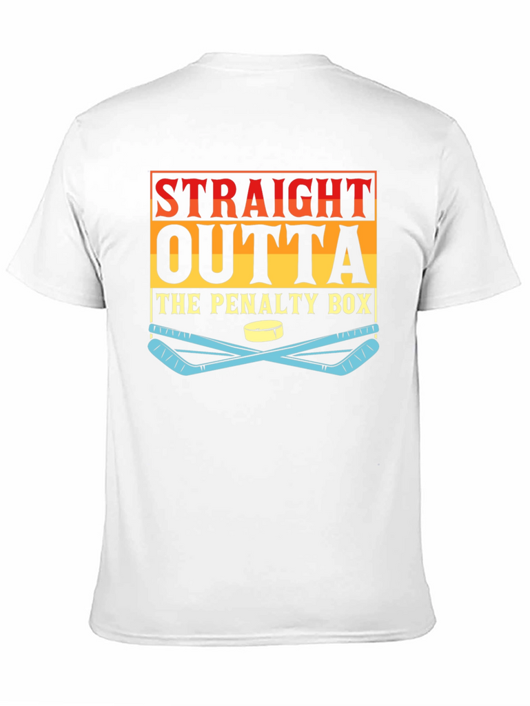 Show off your love for hockey with this unique "Straight Outta The Penalty Box" T-shirt. The shirt features a playful design with bold text and crossed hockey sticks, perfect for hockey players and fans alike. Made from comfortable material, this tee is ideal for casual wear, sports events, or hockey practice. Great way to express your passion and humor for the game, making it a cool addition to your wardrobe. Get yours today and let everyone know you're a proud hockey enthusiast!