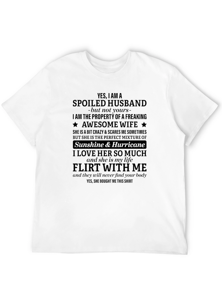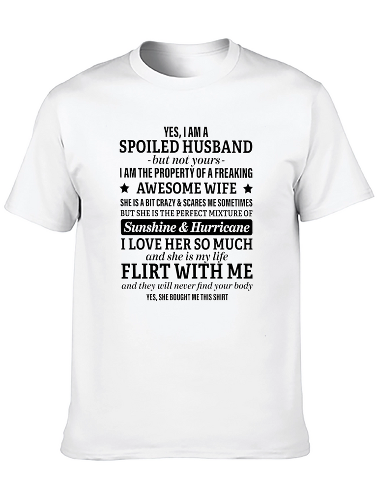Show off your love for your wife with this fun and unique graphic tee! This black t-shirt features bold text that declares "YES, I AM A SPOILED HUSBAND but not yours - I AM THE PROPERTY OF A FREAKING AWESOME WIFE". It also includes fun phrases like "Sunshine & Hurricane" and "FLIRT WITH ME and they will never find your body" This tee is sure to get a laugh and make a statement. Made from a comfortable fabric, this t-shirt is perfect for casual wear, weekend outings, or just lounging around the house. It also makes a great gift for your special partner.