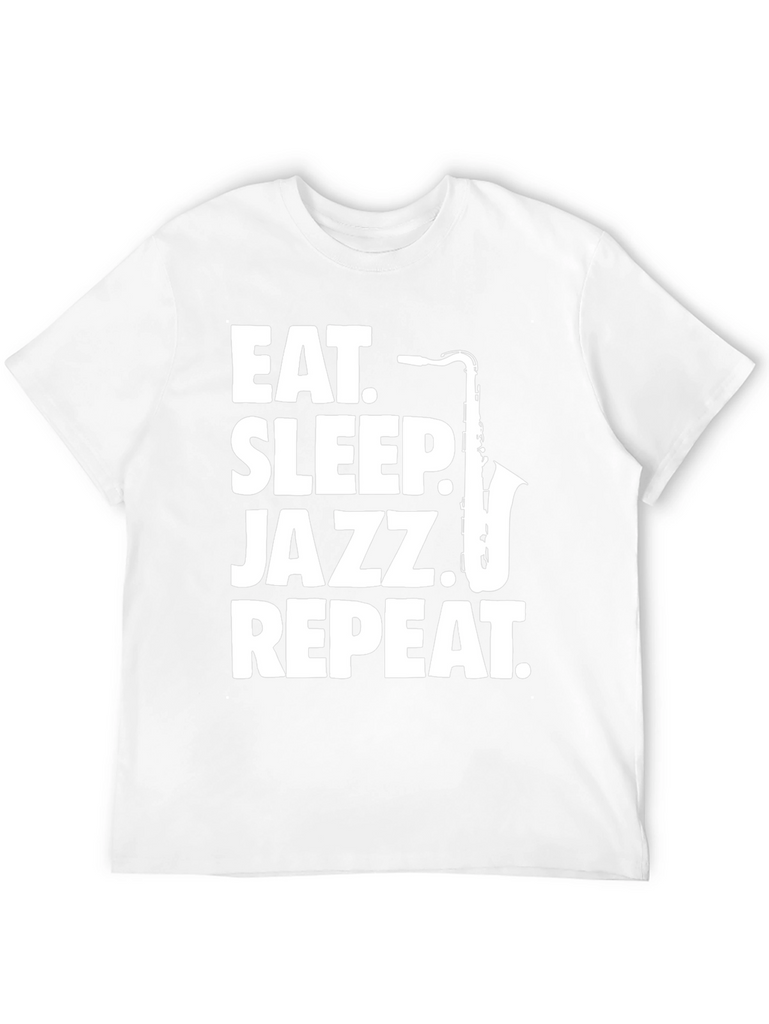 Express your love for music with this stylish black t-shirt. Featuring the playful phrase "Eat. Sleep. Jazz. Repeat." in bold white lettering, complemented by a sleek saxophone graphic. This tee is a must-have for jazz enthusiasts and music lovers alike. Made from comfortable, breathable fabric, it’s perfect for everyday wear, music events, or casual outings. The classic crew neck and short sleeves offer a relaxed fit, making it a versatile addition to any wardrobe. Show off your passion for jazz in style with this unique and eye-catching t-shirt!