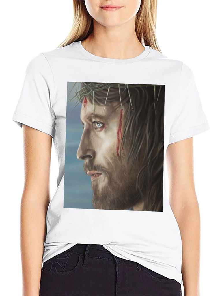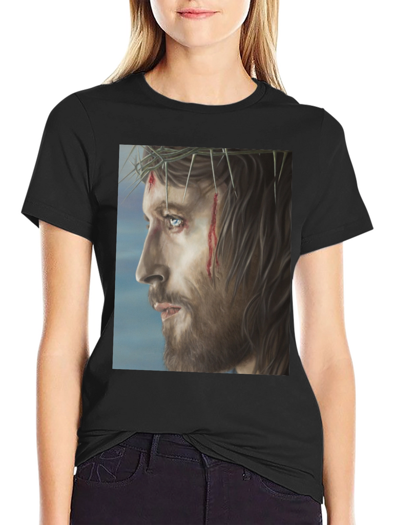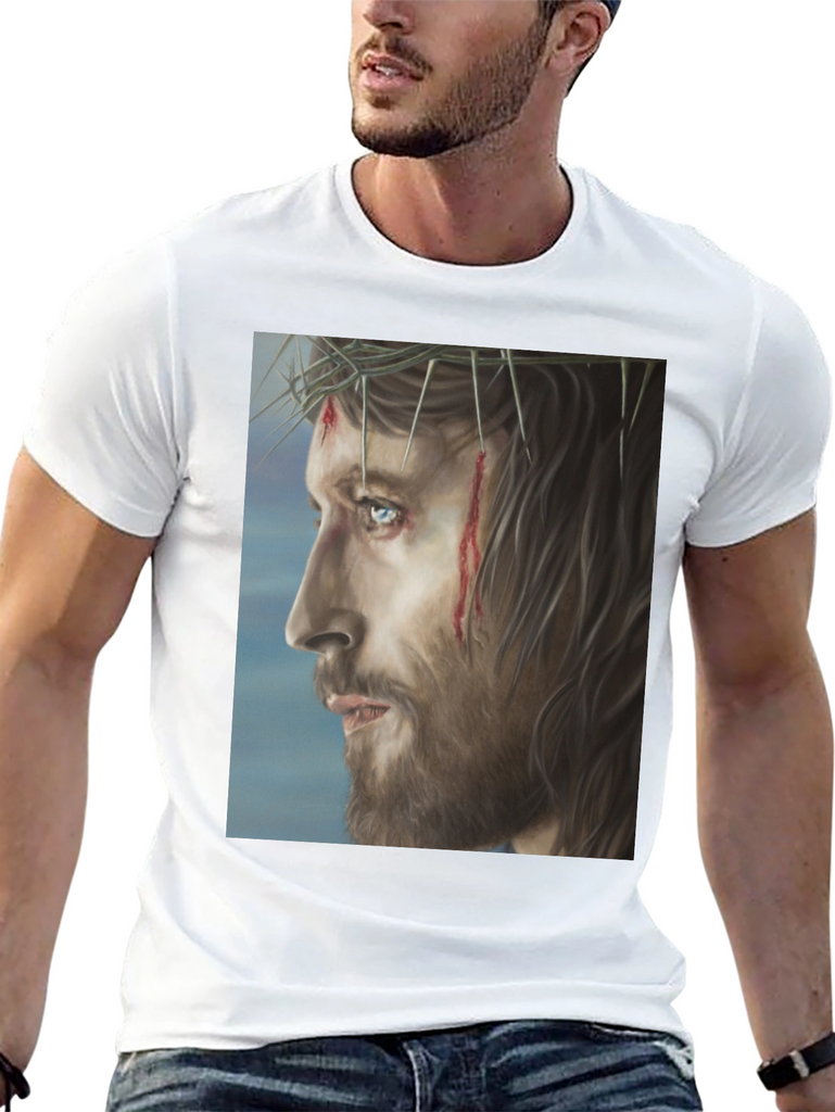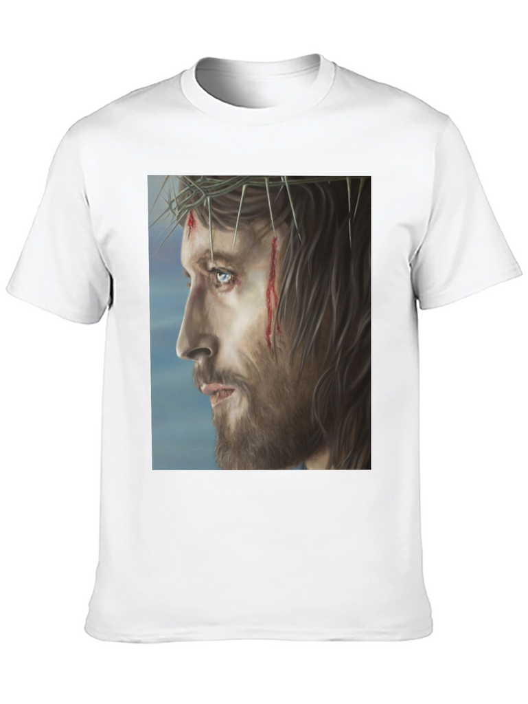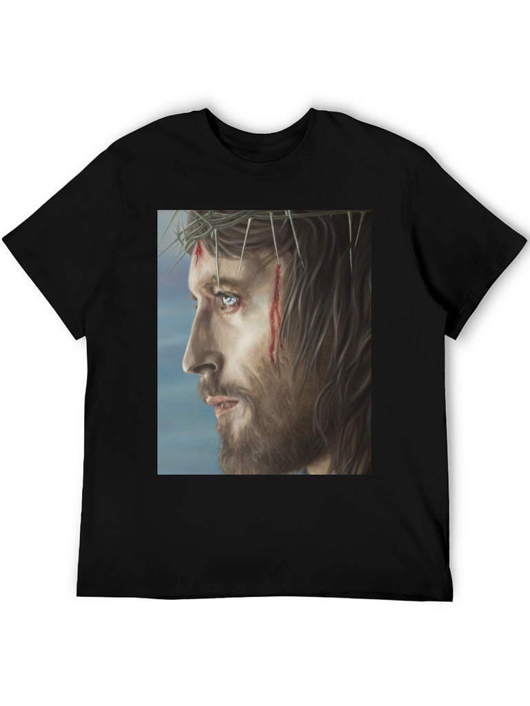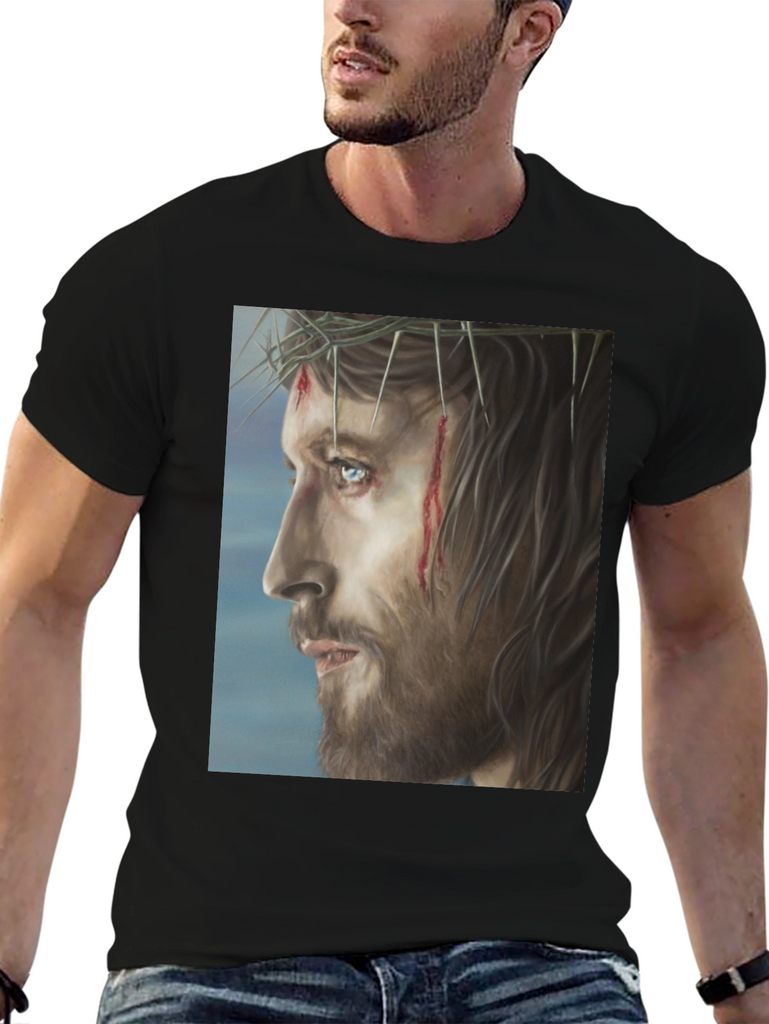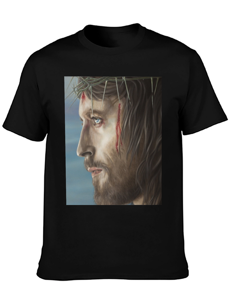 This black t-shirt features a striking graphic of Jesus wearing a crown of thorns. The image is rendered in a realistic style, complete with blood details. This shirt is made of a soft, comfortable fabric, making it perfect for everyday wear or a special occasion. Show off your faith or start a conversation with this unique tee. Wear it to church, casual outings, or as a statement piece. A simple yet bold addition to any wardrobe.
