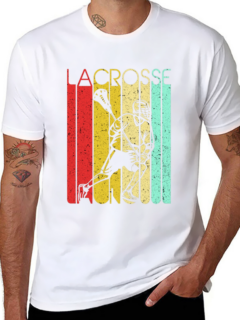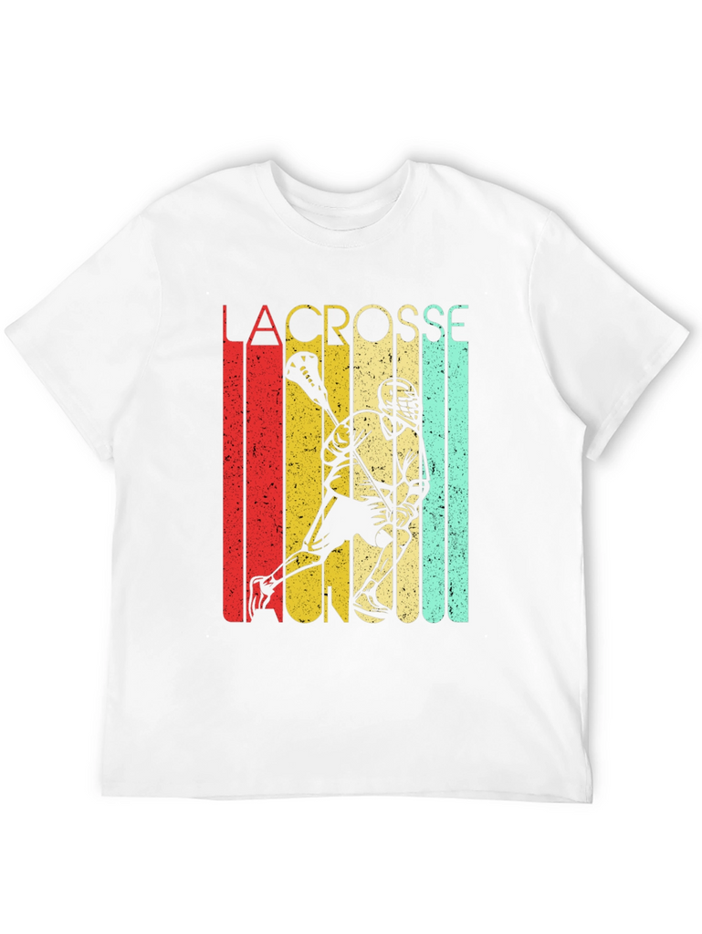 Show off your love for lacrosse with this vintage-inspired t-shirt. The shirt features a classic retro design with bold vertical stripes in various colors behind a Lacrosse player graphic. The distressed print gives it an authentic, worn-in feel. Made from a soft and comfortable fabric, this tee is perfect for everyday wear. Whether you're hitting the field, hanging out with friends, or just want to represent your favorite sport, this lacrosse t-shirt is a stylish choice. Grab yours today and let everyone know you're a part of the lacrosse community!