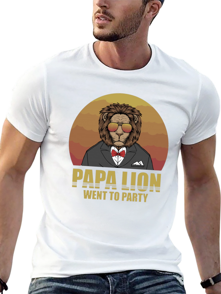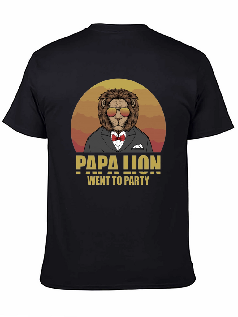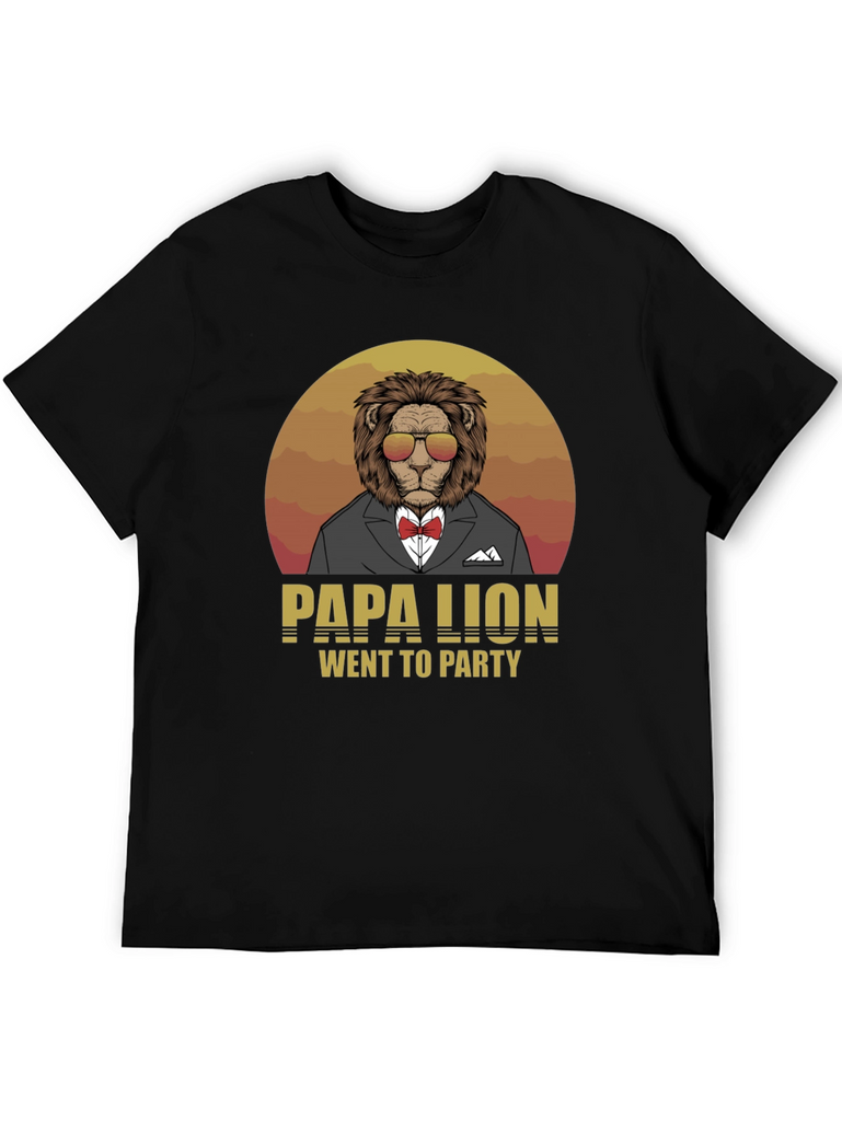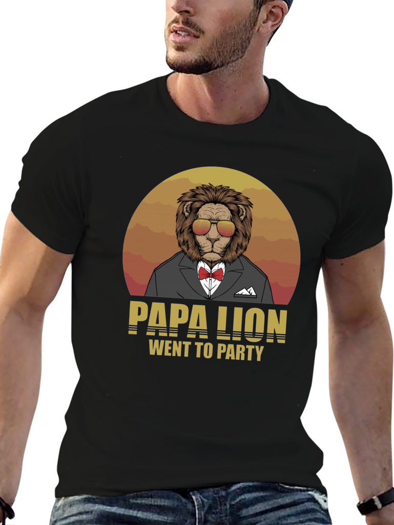 This black t-shirt features a unique and eye-catching design. It showcases a sophisticated lion wearing sunglasses and a suit with a bow tie, set against a vintage-style sunset backdrop. Bold text reads "PAPA LION WENT TO PARTY", making it a fun statement piece. The print has a slight distressed look, adding to the vintage appeal. Perfect for casual wear, parties, or anyone who loves unique graphic tees. Express your wild side with this stylish and comfortable t-shirt. Stand out in style!