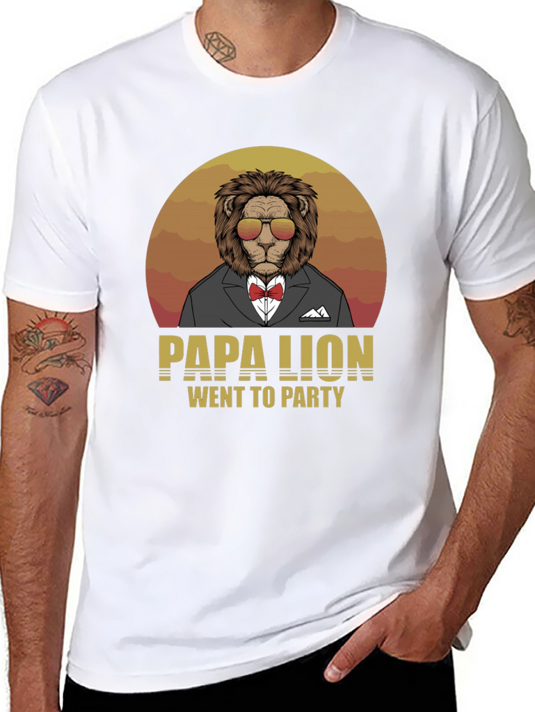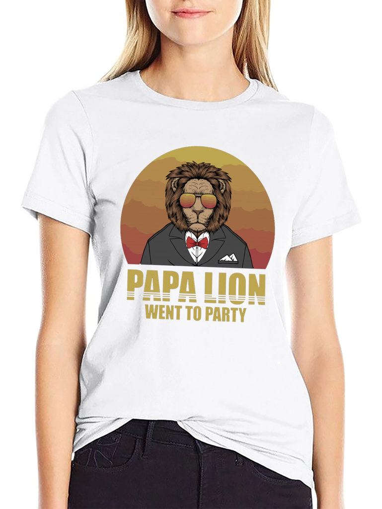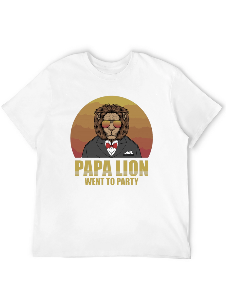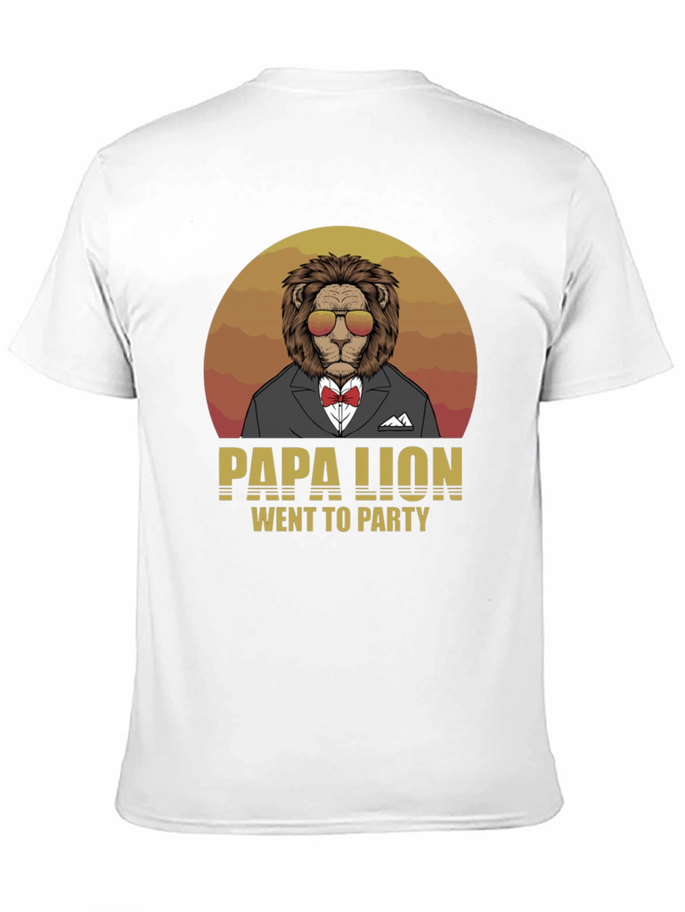 This black t-shirt features a unique and eye-catching design. It showcases a sophisticated lion wearing sunglasses and a suit with a bow tie, set against a vintage-style sunset backdrop. Bold text reads "PAPA LION WENT TO PARTY", making it a fun statement piece. The print has a slight distressed look, adding to the vintage appeal. Perfect for casual wear, parties, or anyone who loves unique graphic tees. Express your wild side with this stylish and comfortable t-shirt. Stand out in style!