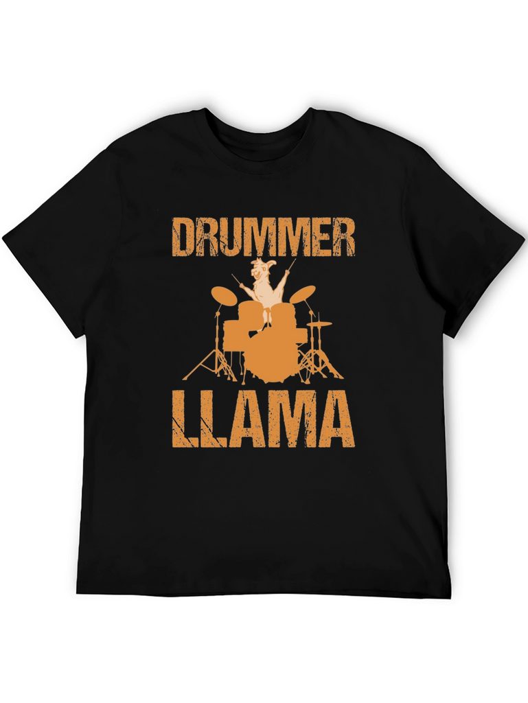 Rock out with this unique Drummer Llama graphic tee! The shirt features a bold, orange-toned design of a llama playing a drum set, set between the words "DRUMMER" and "LLAMA." The black t-shirt is made from a comfortable-looking material. The graphic is eye-catching and perfect for music lovers and llama enthusiasts alike. This tee is a great way to showcase your individuality. Ideal for casual wear, concerts, or just making a statement, this tee is sure to turn heads and spark conversations. Get yours today and show off your quirky side!