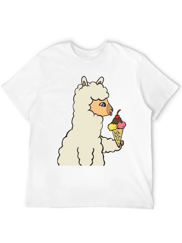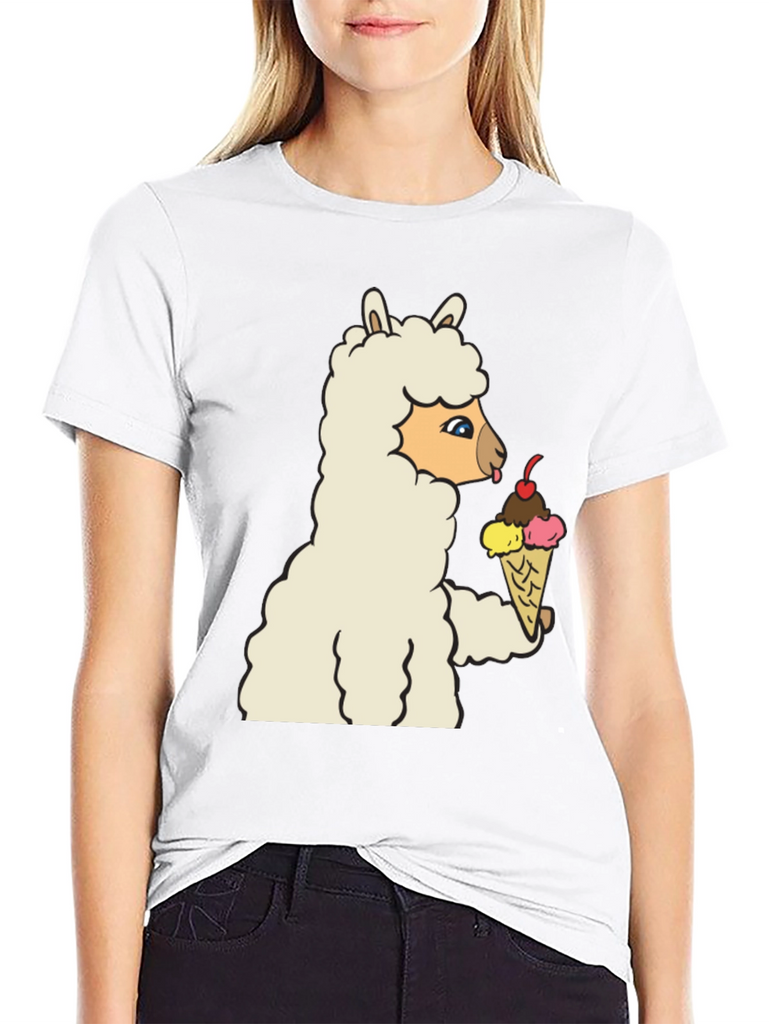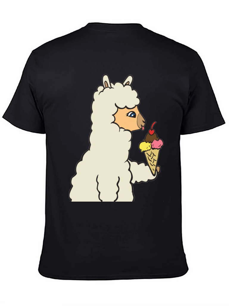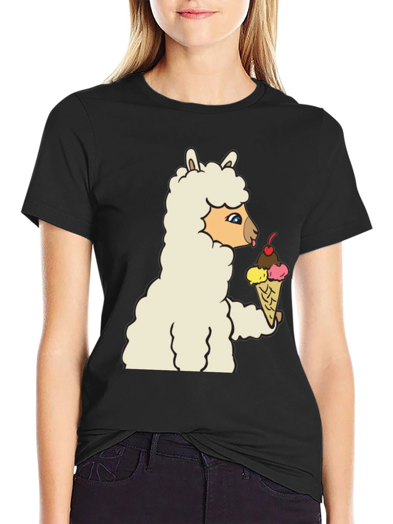 Indulge in whimsy with this unique black tee featuring a delightful graphic of a llama enjoying a triple-scoop ice cream cone topped with a cherry. The charming design adds a playful touch to your everyday wardrobe, perfect for those who love quirky and eye-catching apparel. Made from soft, comfortable fabric, this tee offers both style and comfort. Ideal for casual outings, weekend adventures, or simply expressing your fun-loving personality. Stand out from the crowd and showcase your playful side with this conversation-starting graphic tee. Get yours today and add a scoop of sweetness to your style!