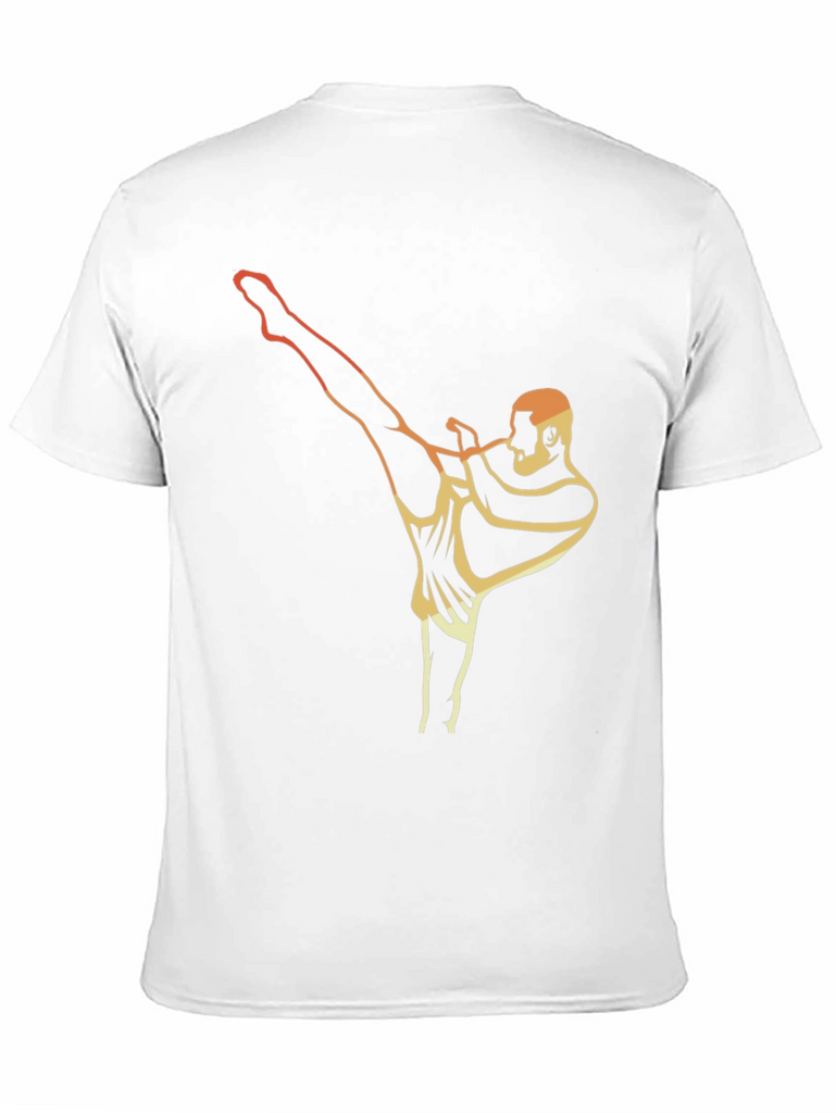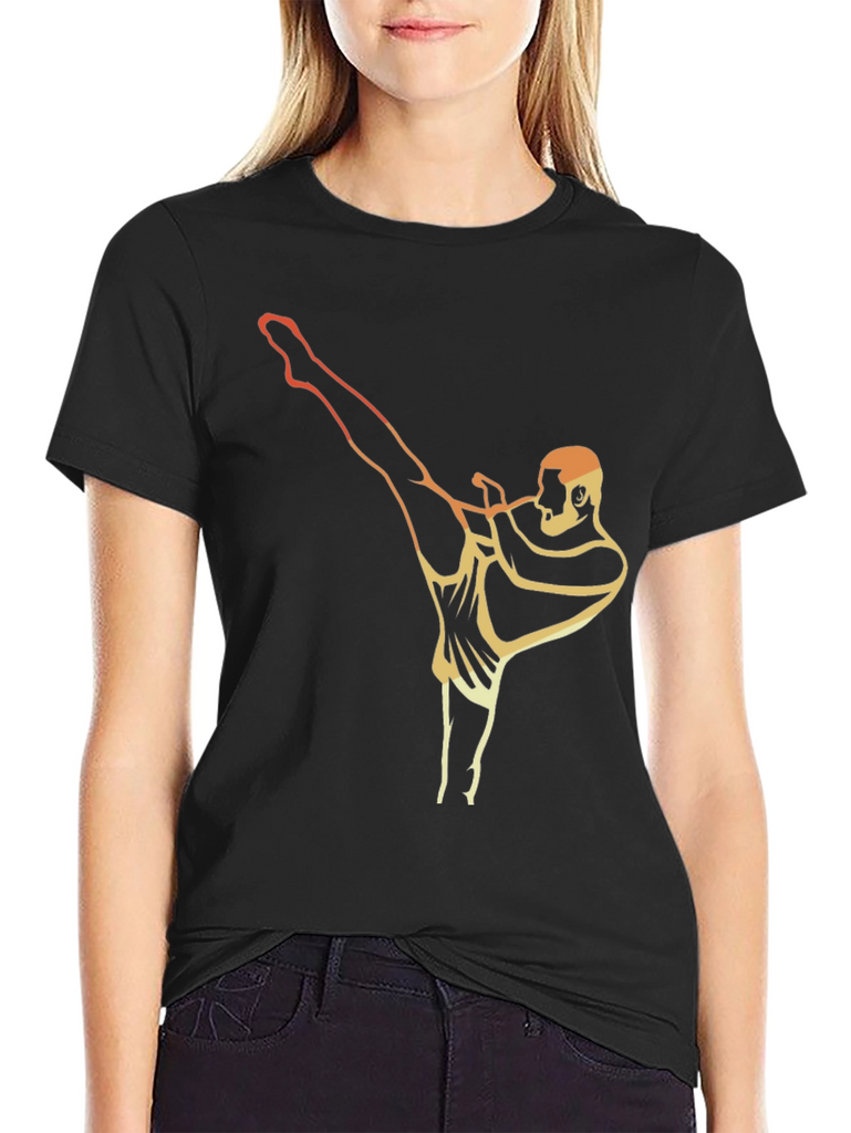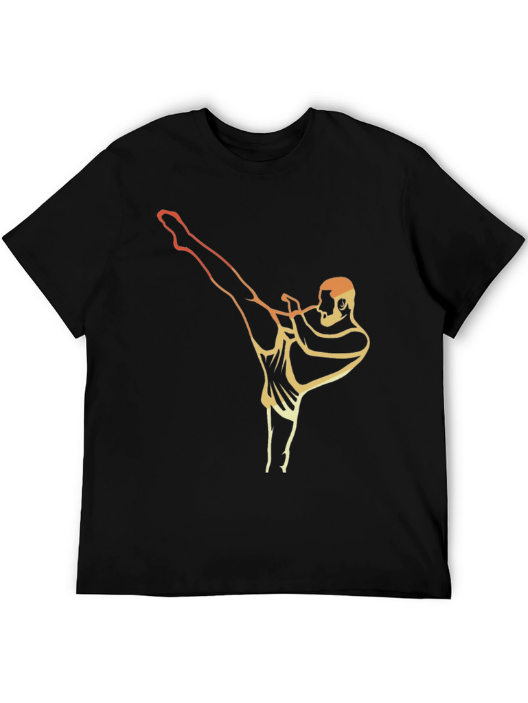 Showcase your love for martial arts with this stylish graphic t-shirt. The black tee features a retro-inspired graphic of a person in a high-kick pose, with a warm gradient from orange to gold. This short-sleeve shirt has a classic fit and is suitable for casual wear or training sessions. It's made from comfortable material and is designed to keep you cool. The unique and eye-catching design makes it a conversation starter. Express your athletic side with this must-have wardrobe essential. Perfect for everyday style.