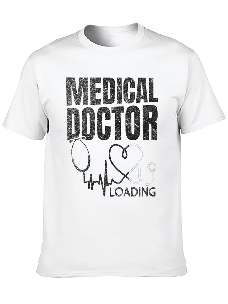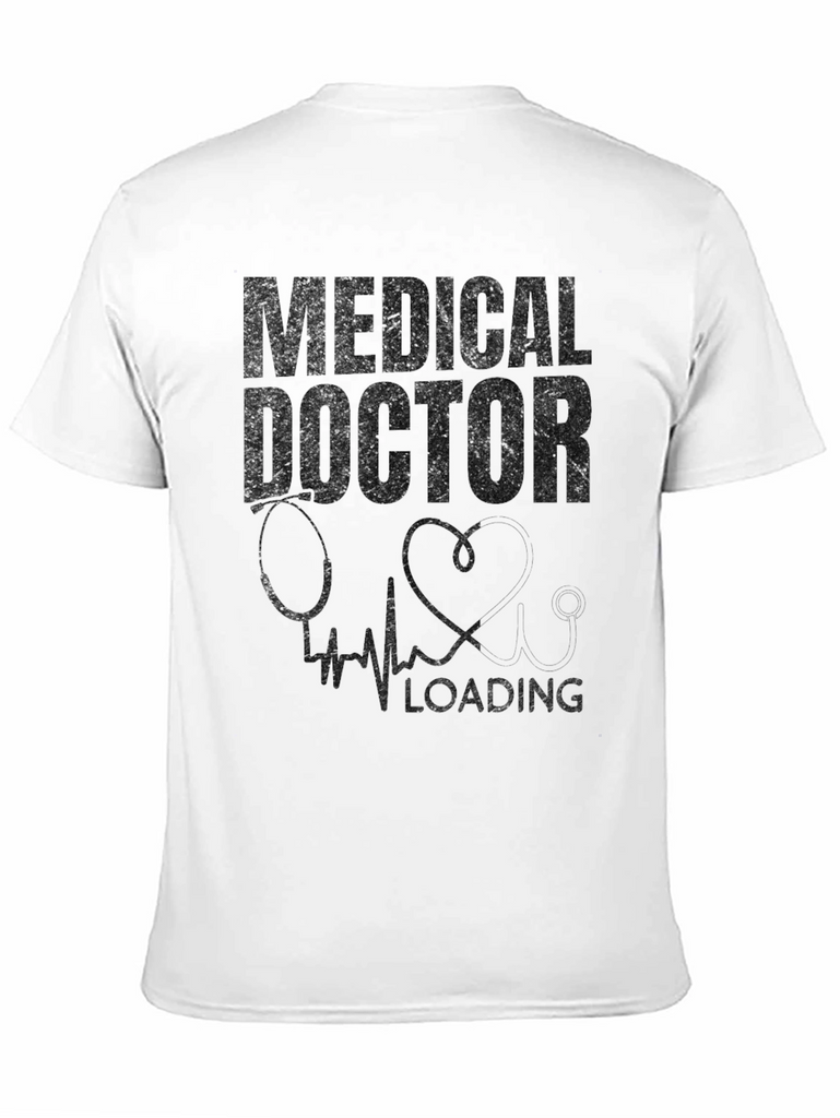 This black t-shirt features a bold "MEDICAL DOCTOR" graphic printed across the chest in a distressed style. Underneath, there's a subtle image of a stethoscope, a heart shape, and a heartbeat line, accompanied by the word "LOADING", suggesting a sense of anticipation or progress. The design is simple yet impactful. Perfect for medical students, doctors, or anyone in the medical profession, this tee is a great way to express pride and humor. Made from comfortable material, it's ideal for everyday wear, casual outings, or as a gift for someone passionate about medicine. Stand out with this unique and stylish medical-themed t-shirt!