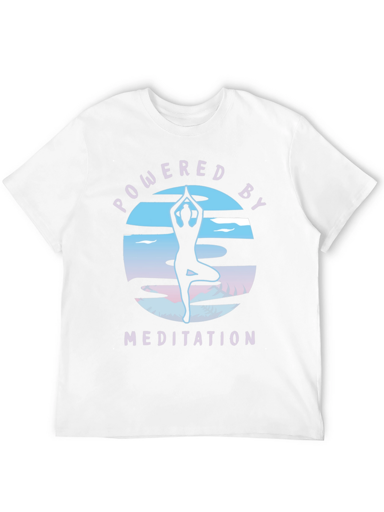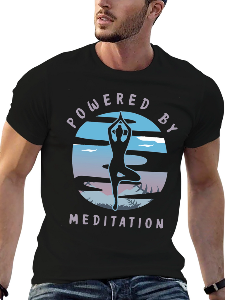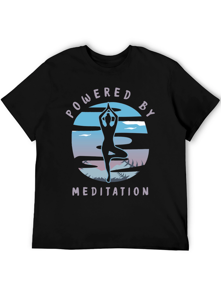 Find your inner peace with this stylish black T-shirt. Featuring a unique design of a person in a meditation pose set against a colorful landscape background, this shirt exudes tranquility and mindfulness. The words "POWERED BY MEDITATION" encircle the graphic, adding a touch of inspiration. Made from soft, breathable cotton, this comfortable tee is perfect for yoga sessions, casual outings, or simply relaxing at home. Show off your love for meditation and spread positive vibes with this eye-catching and meaningful T-shirt. A must-have for anyone seeking harmony and balance.