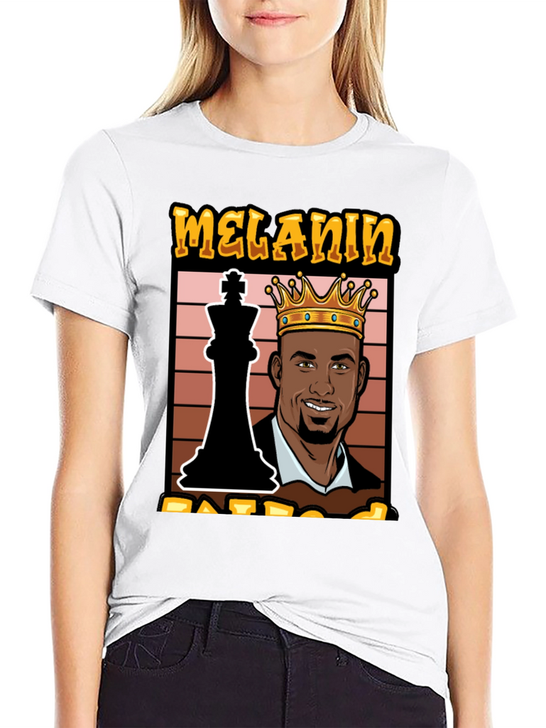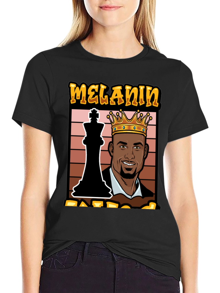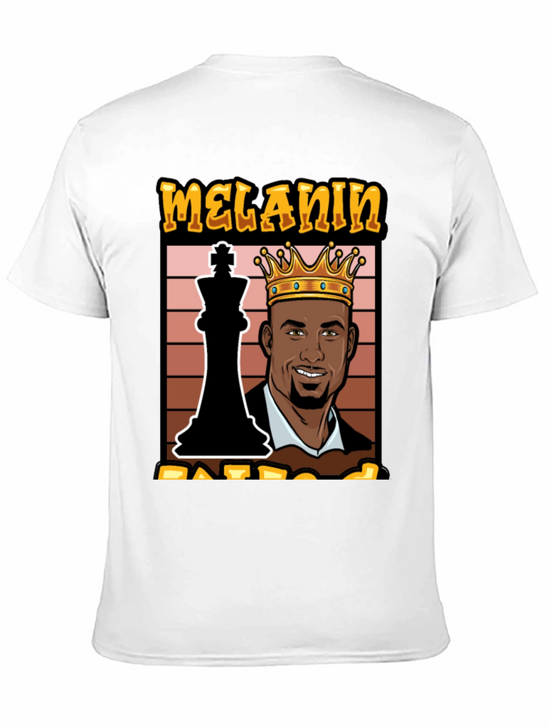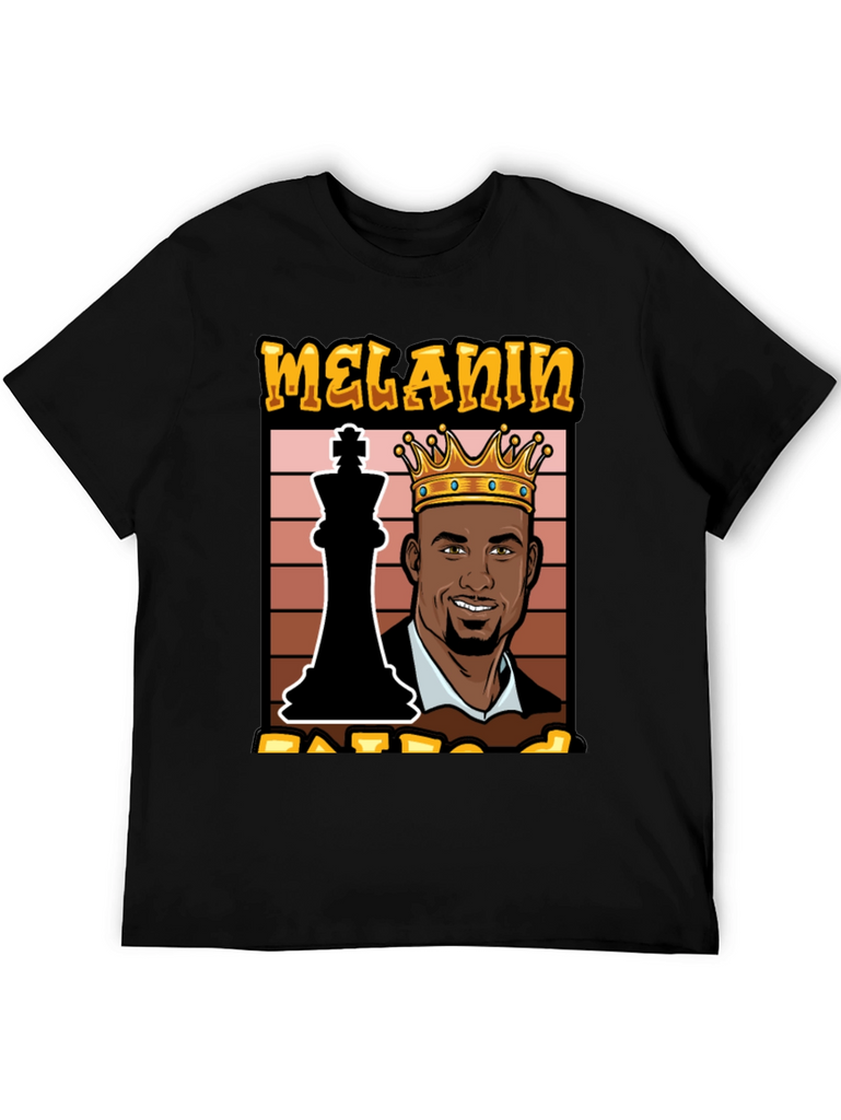 Show off your regal style with this unique "Melanin King" t-shirt. The black tee features a bold graphic of a Black man wearing a crown, juxtaposed with a chess king piece, set against a striped background. This design celebrates Black excellence and strategic thinking. Made from soft, comfortable fabric, this t-shirt is perfect for casual wear, social gatherings, or making a statement wherever you go. Get yours today and represent the king you are!