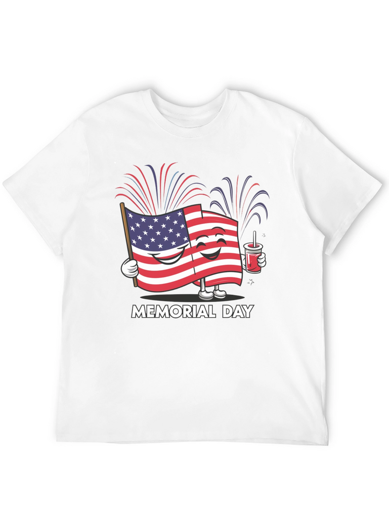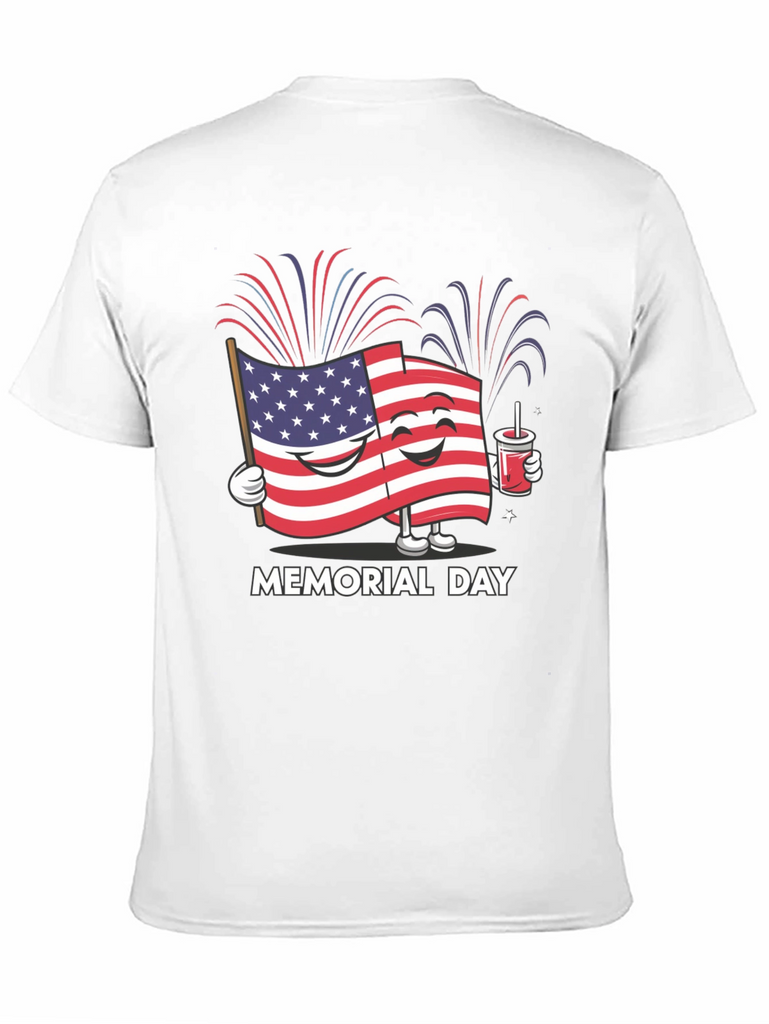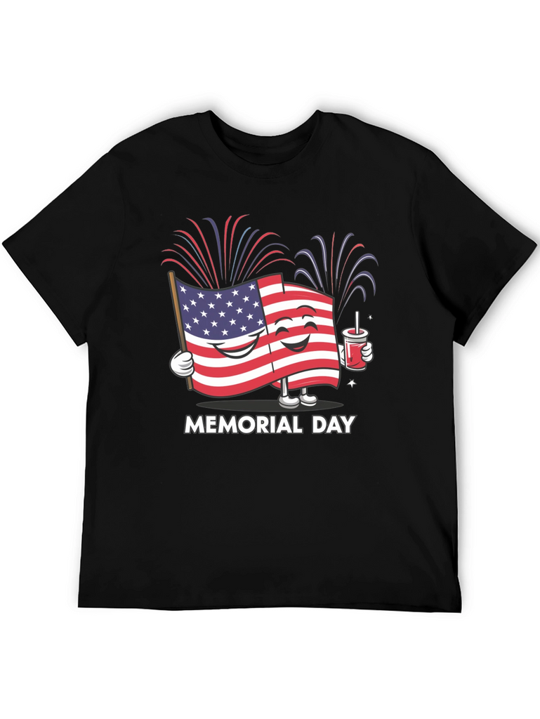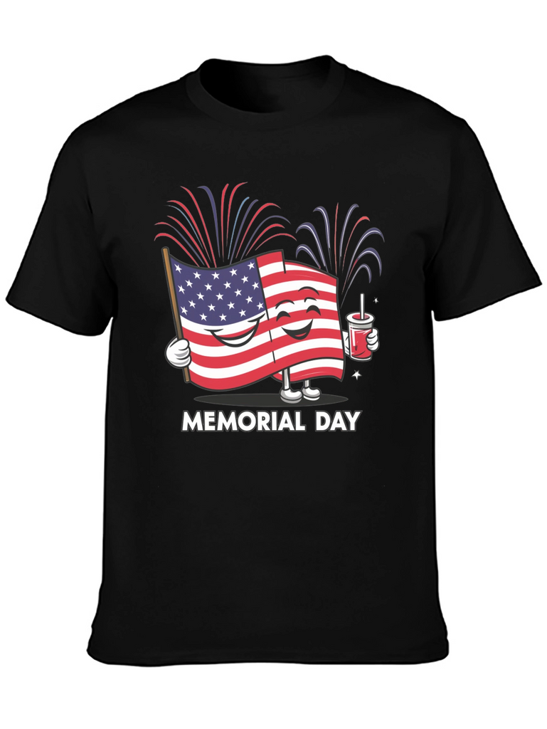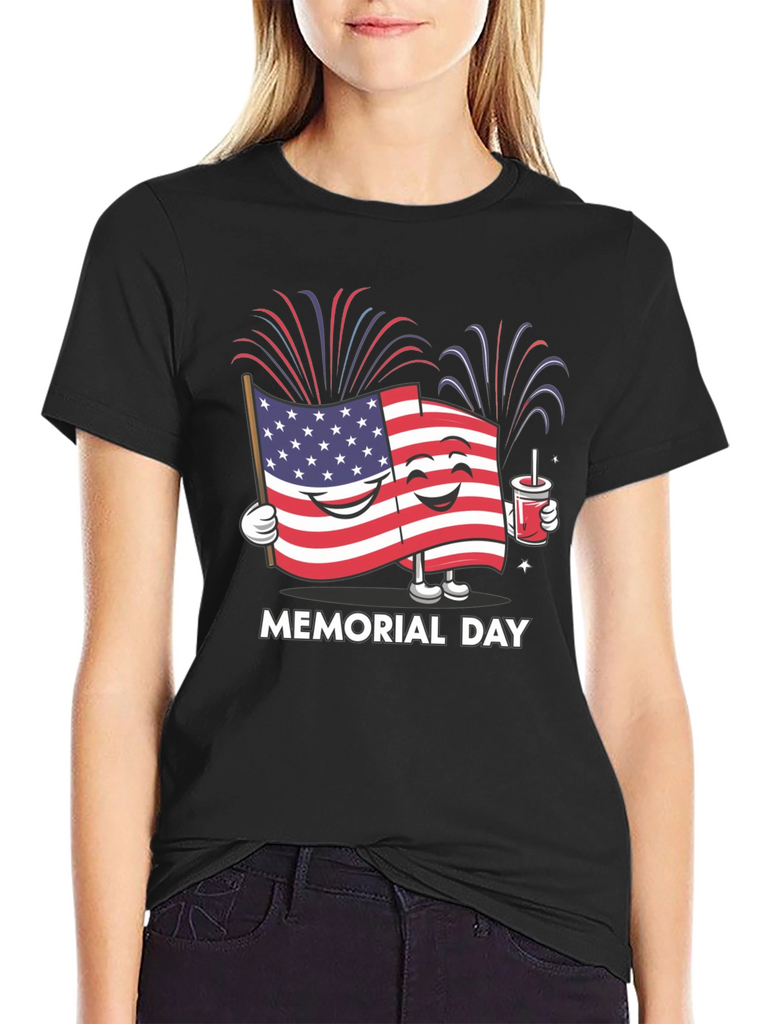 Celebrate Memorial Day in style with this unique graphic t-shirt. The shirt features a playful design of two animated American flags, complete with smiling faces, fireworks, and even a drink. The design is printed on a classic black t-shirt. The shirt appears to be made from a comfortable, breathable fabric, perfect for warm weather. Show your patriotism and remember our heroes with this eye-catching and spirited t-shirt. Ideal for Memorial Day gatherings, parades, or casual wear to commemorate the holiday.