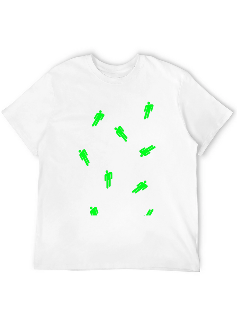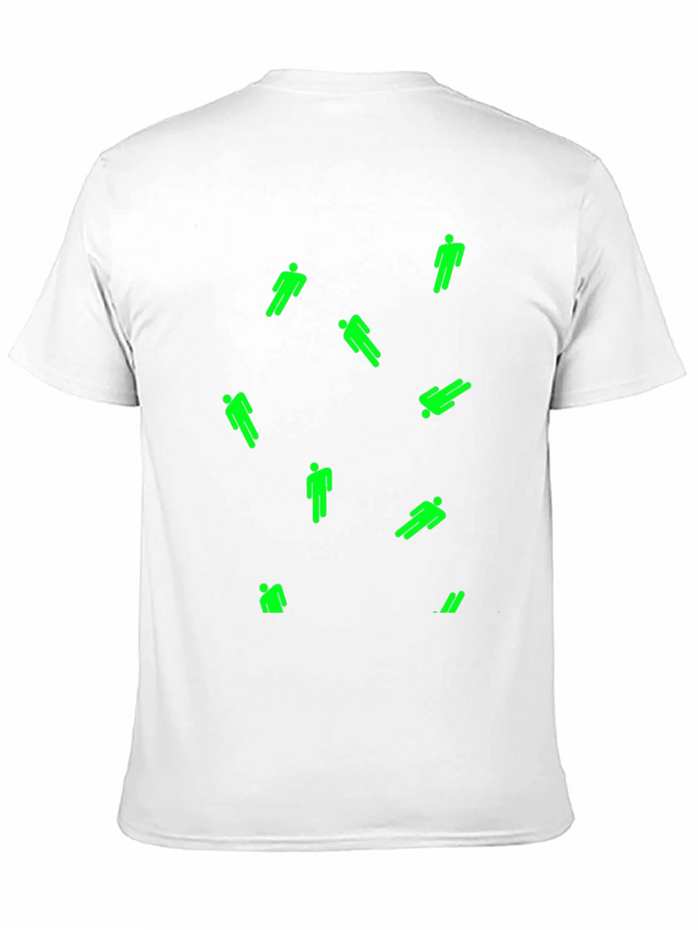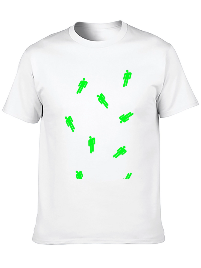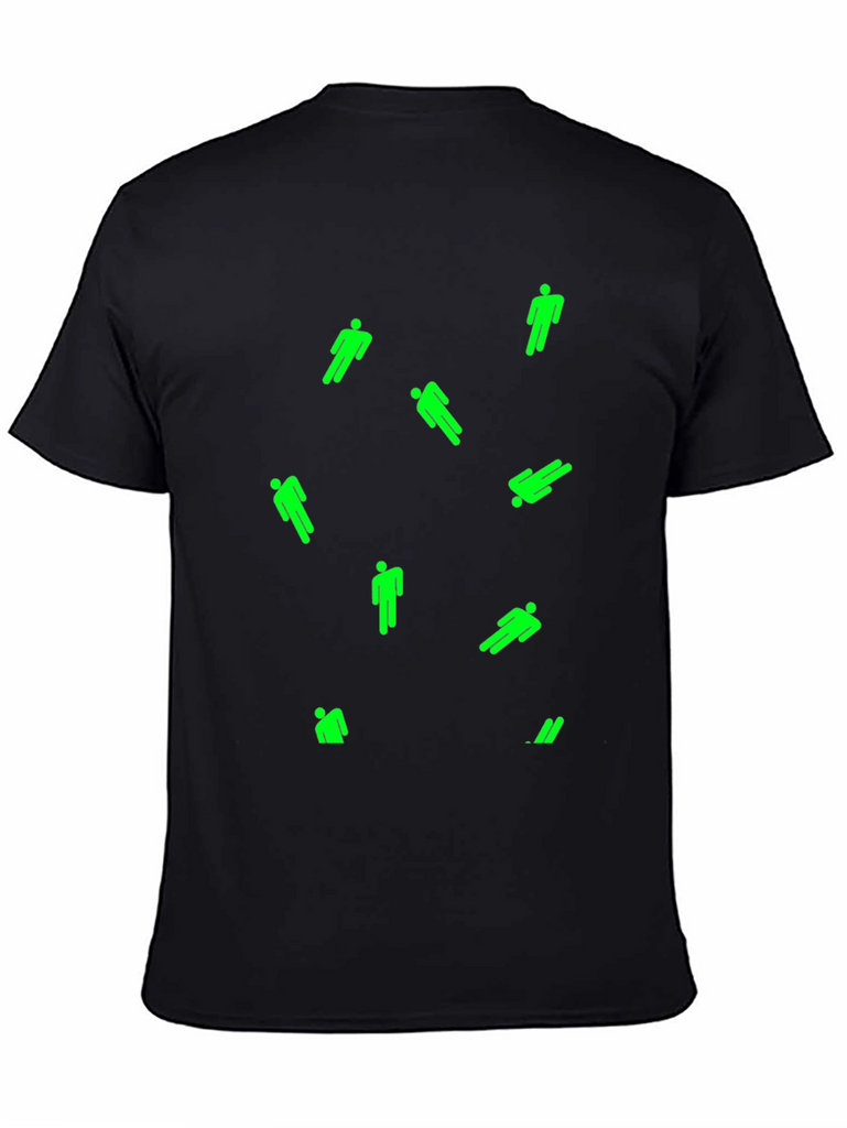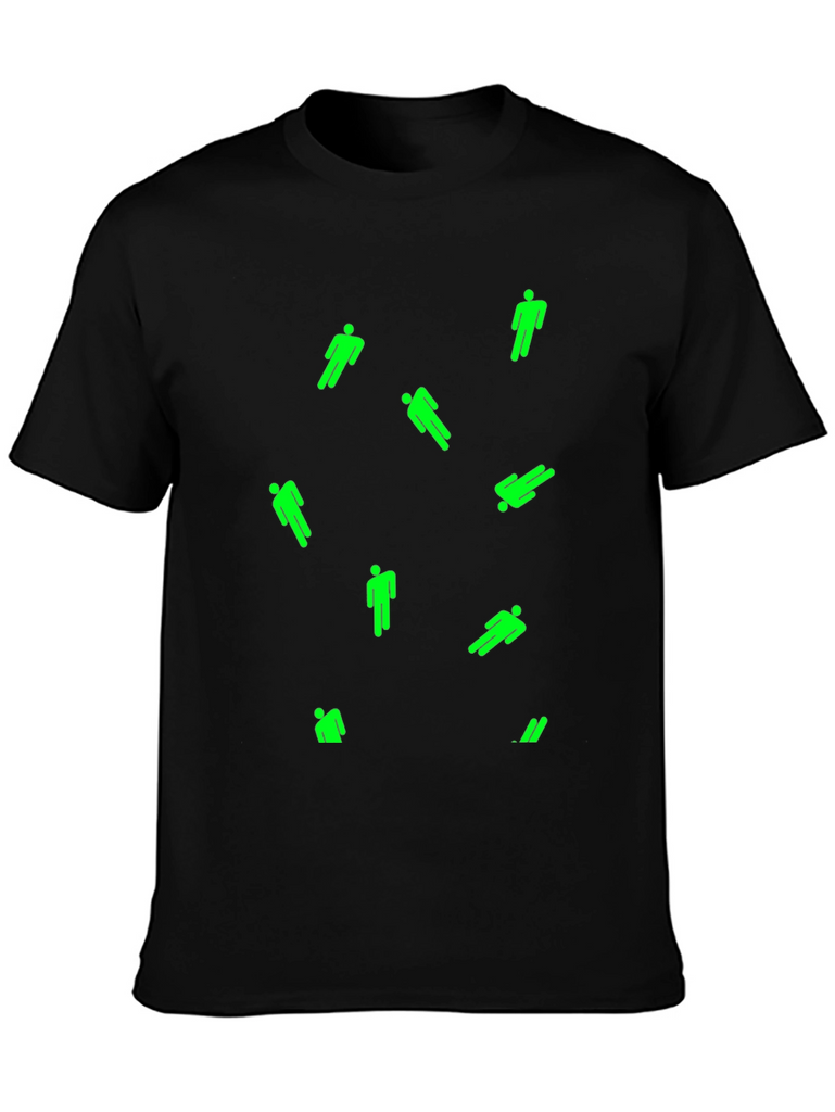Show off your unique style with this men's black T-shirt. This casual tee features a scattered design of bright green, stylized figures. The shirt appears to be made from a comfortable, breathable fabric, perfect for everyday wear. The classic crew neck and short sleeves provide a relaxed fit. Ideal for casual outings, concerts, or lounging at home, this eye-catching T-shirt is a great addition to any wardrobe. Make a statement and stand out from the crowd with this unique piece!