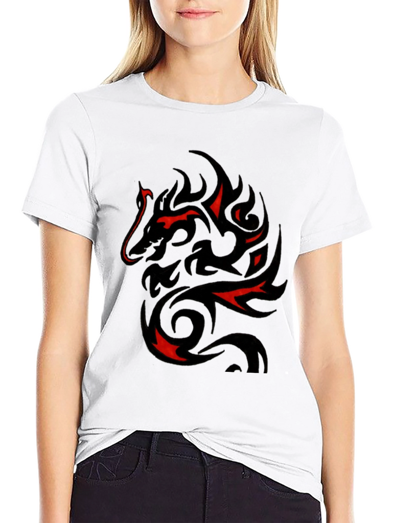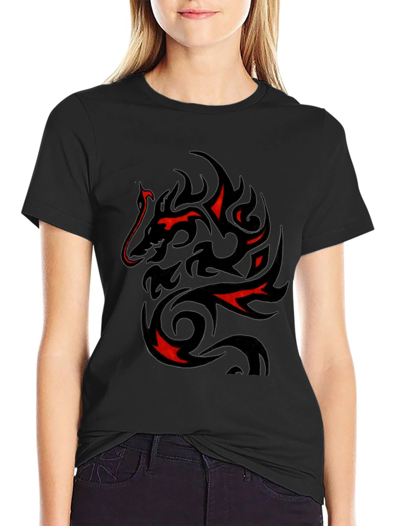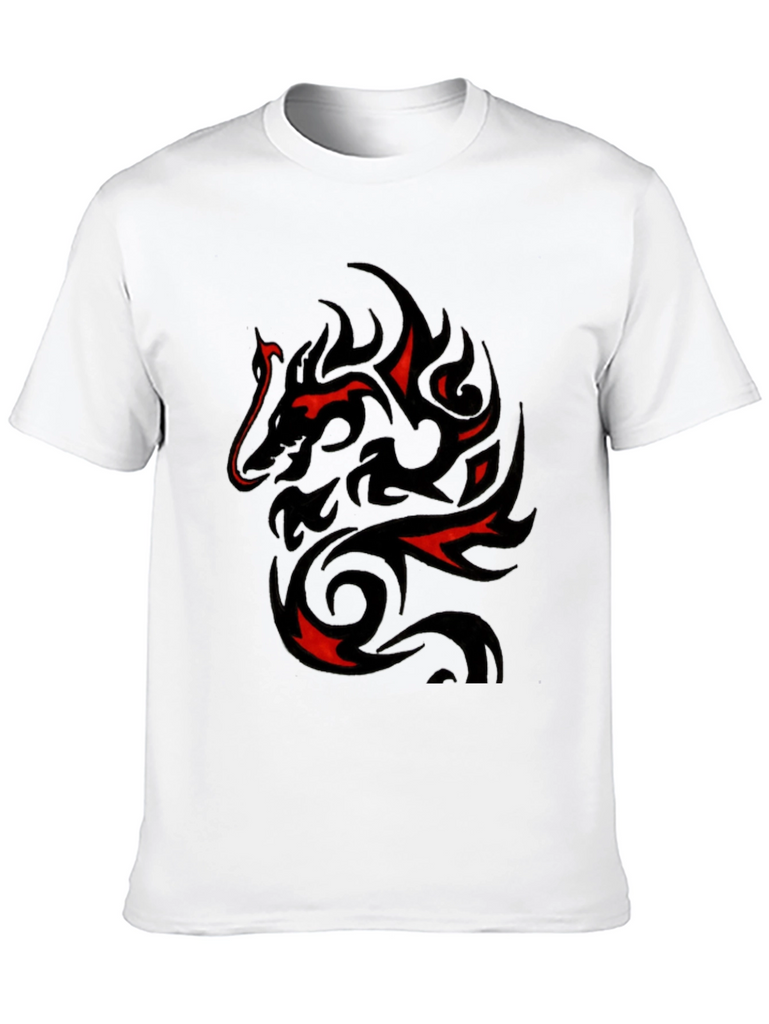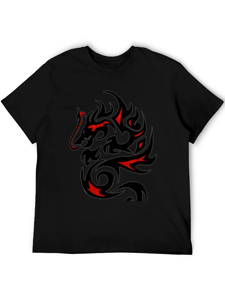 This stylish men's black t-shirt features a striking graphic design. The dragon artwork combines bold black outlines with red accents for a fierce, modern look. Made from a comfortable, breathable fabric, this tee is perfect for casual wear. The design is suitable for anyone who likes the dragon, or mythical imagery. Ideal for everyday wear, parties, or concerts, this tee is sure to turn heads. This t-shirt is a must-have for those wanting to add an eye-catching piece to their wardrobe.