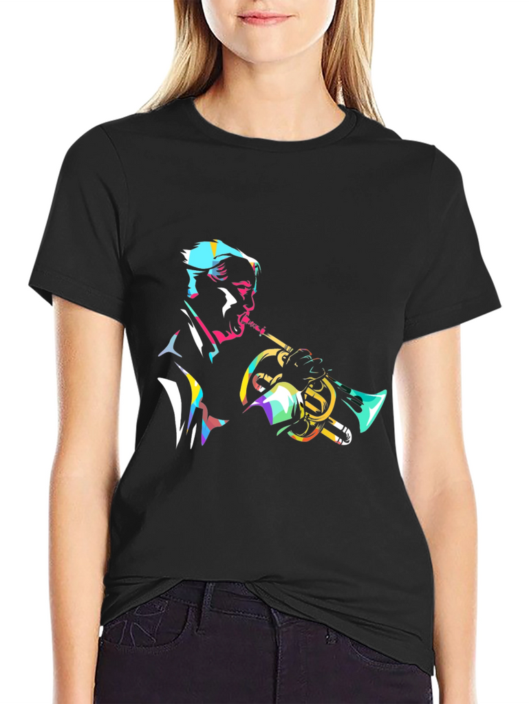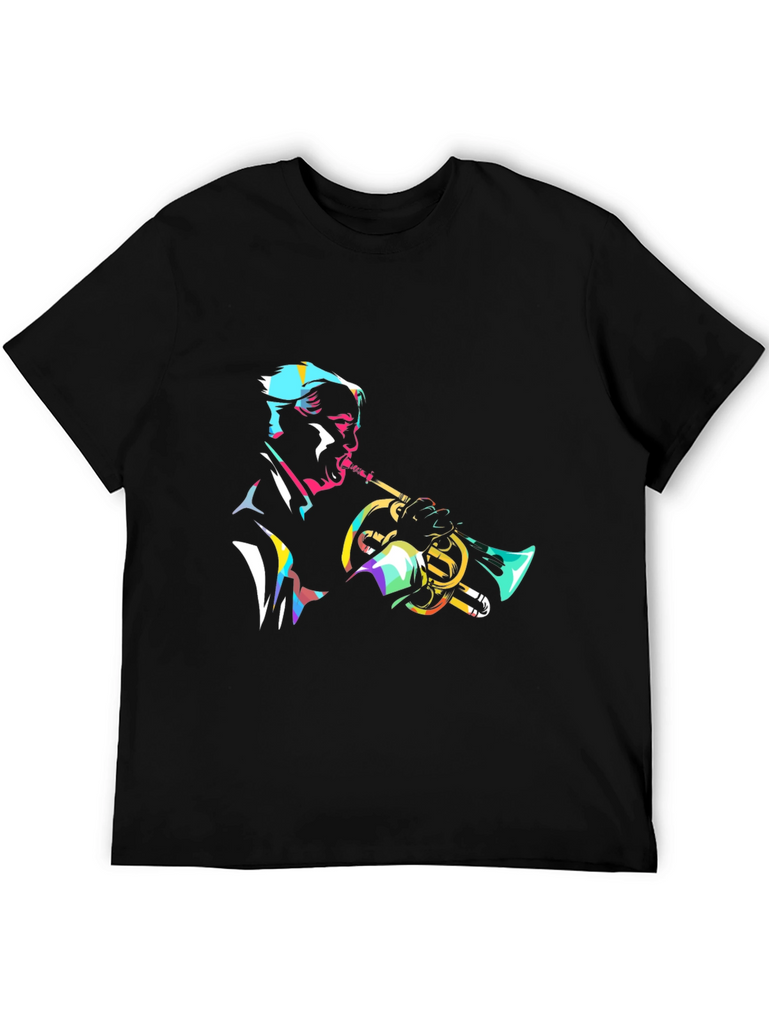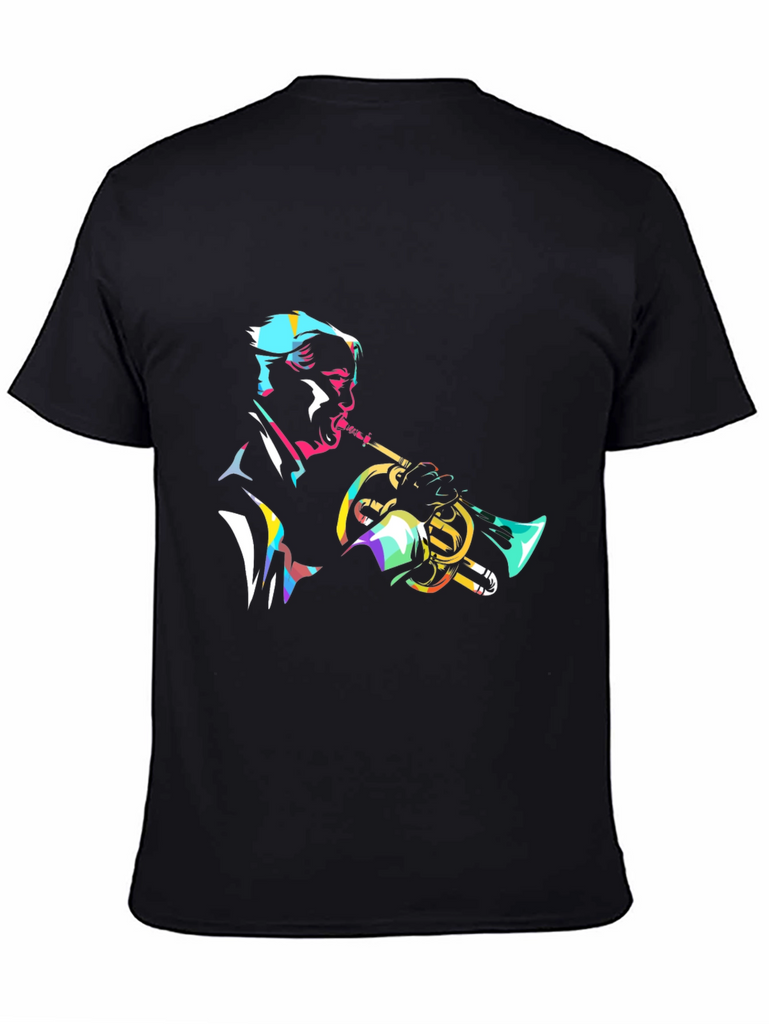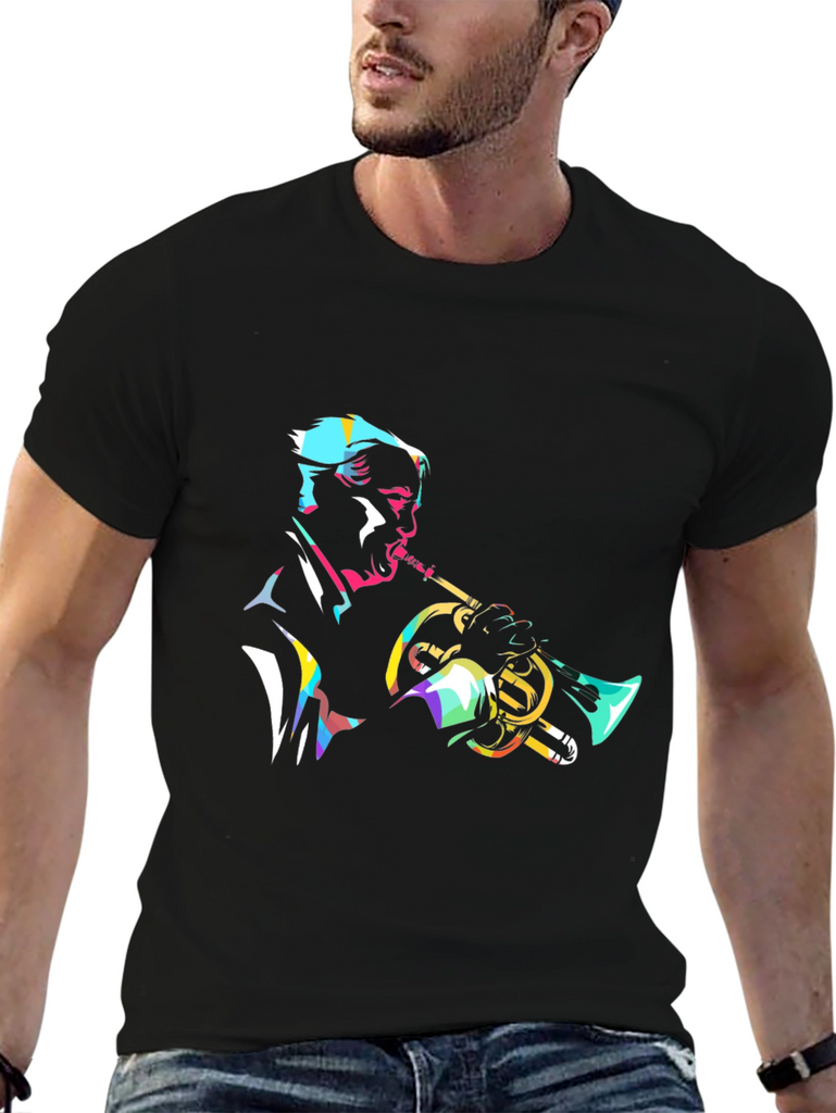 Showcase your love for music with this eye-catching men's black t-shirt. Featuring a vibrant, colorful graphic of a trumpet player, this shirt is sure to turn heads. The striking design pops against the classic black backdrop. Made from a comfortable fabric blend, this tee is perfect for everyday wear. Whether you're a musician yourself or simply appreciate the art form, this t-shirt is a stylish way to express your passion. Pair it with jeans or shorts for a casual, cool look. A must-have addition to any music lover's wardrobe!