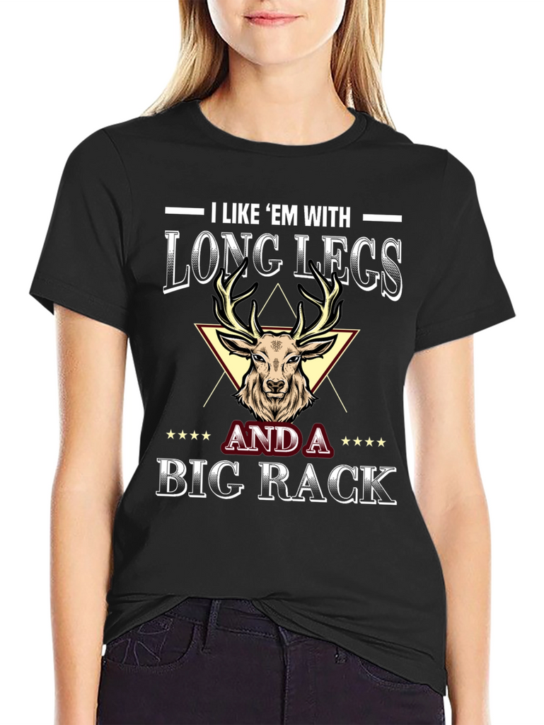 This eye-catching black t-shirt features a humorous graphic design. The shirt's central image is a detailed illustration of a deer's head with prominent antlers, set against a triangular backdrop. Above and below the image are bold, stylized text phrases: "I LIKE 'EM WITH LONG LEGS" and "AND A BIG RACK," embellished with star accents. Made from a comfortable-looking fabric, this tee is perfect for casual wear, hunting trips, or as a fun gift for outdoor enthusiasts with a sense of humor. It's sure to be a conversation starter and a unique addition to any wardrobe.