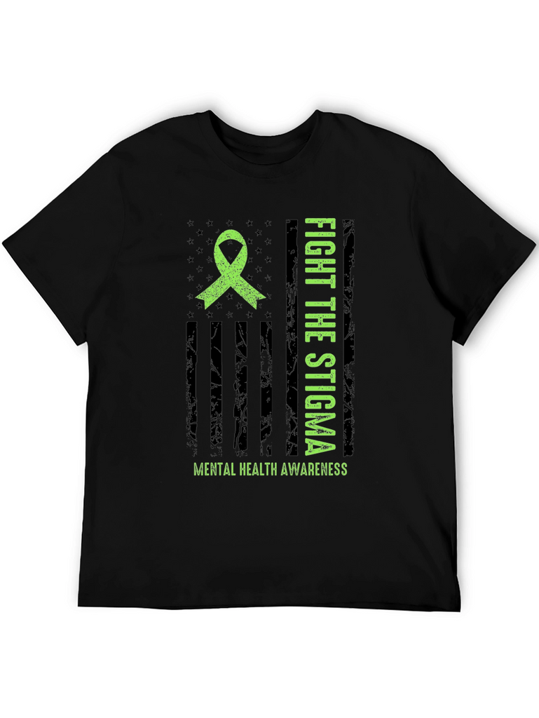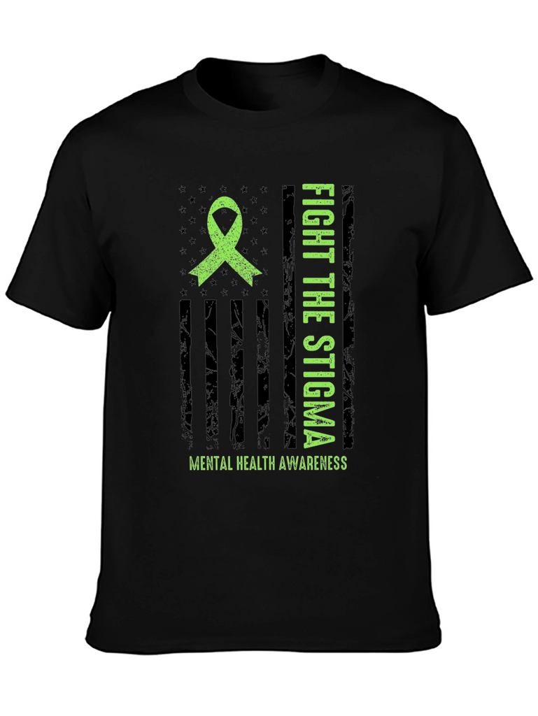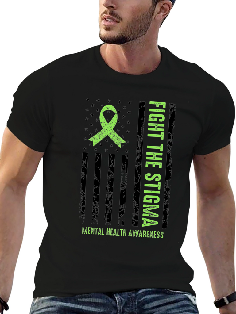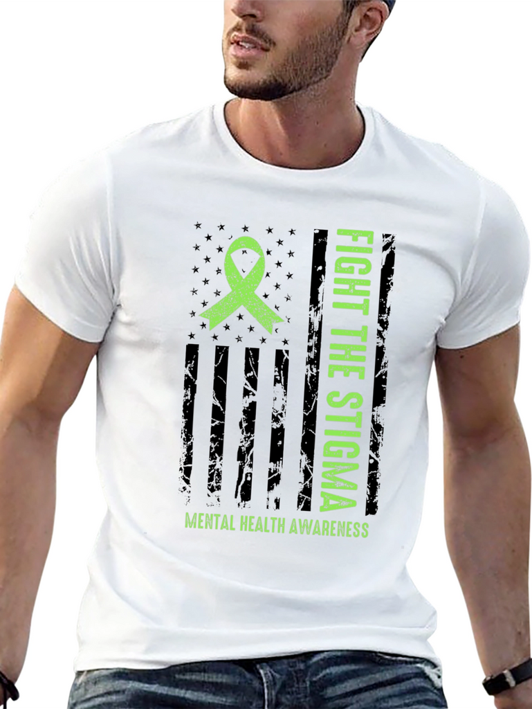 Show your support for mental health awareness with this striking graphic t-shirt. The design features a distressed American flag motif with a bright green awareness ribbon. Bold text proclaims "FIGHT THE STIGMA" alongside "MENTAL HEALTH AWARENESS" emphasizing the important message. Made from comfortable material, this tee is perfect for everyday wear. It's ideal for raising awareness and starting conversations. Wear it to support mental health initiatives, walks, or simply to show you care. A powerful statement piece that combines style with a cause.