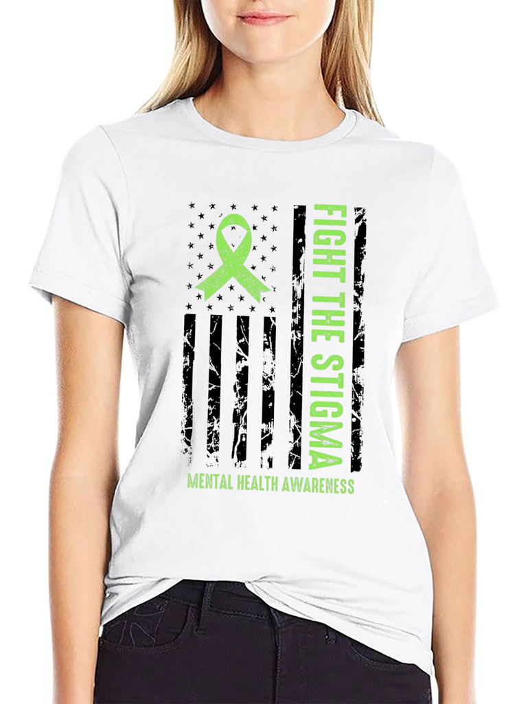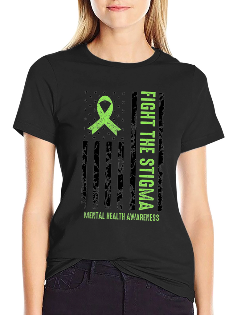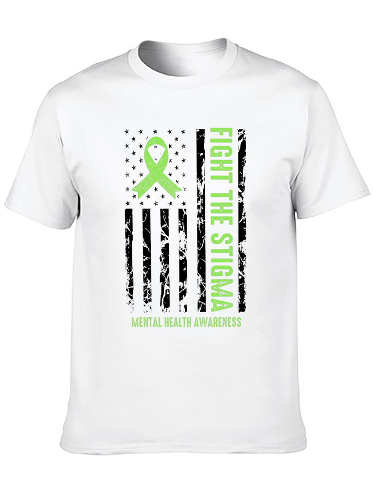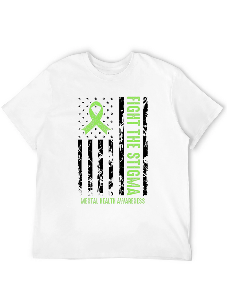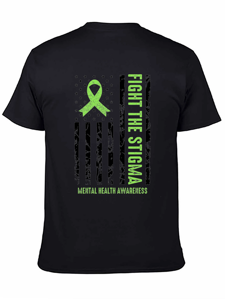 Show your support for mental health awareness with this striking graphic t-shirt. The design features a distressed American flag motif with a bright green awareness ribbon. Bold text proclaims "FIGHT THE STIGMA" alongside "MENTAL HEALTH AWARENESS" emphasizing the important message. Made from comfortable material, this tee is perfect for everyday wear. It's ideal for raising awareness and starting conversations. Wear it to support mental health initiatives, walks, or simply to show you care. A powerful statement piece that combines style with a cause.