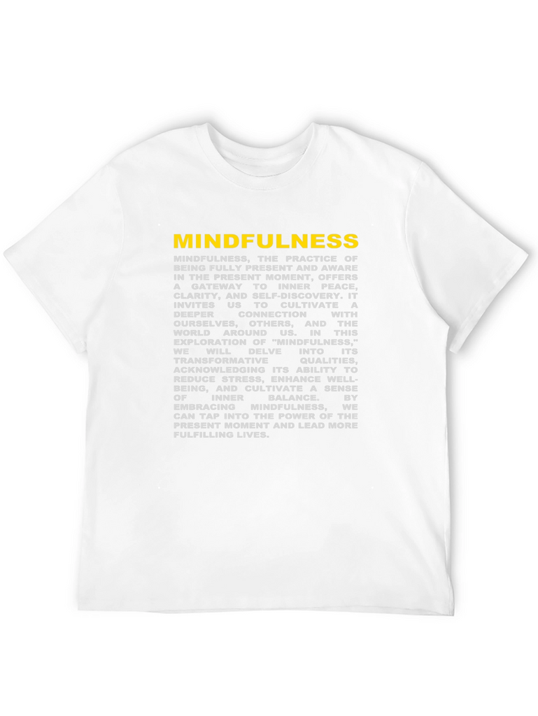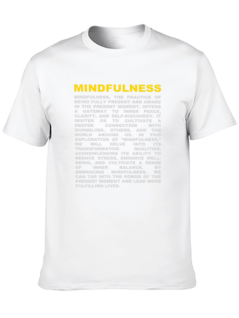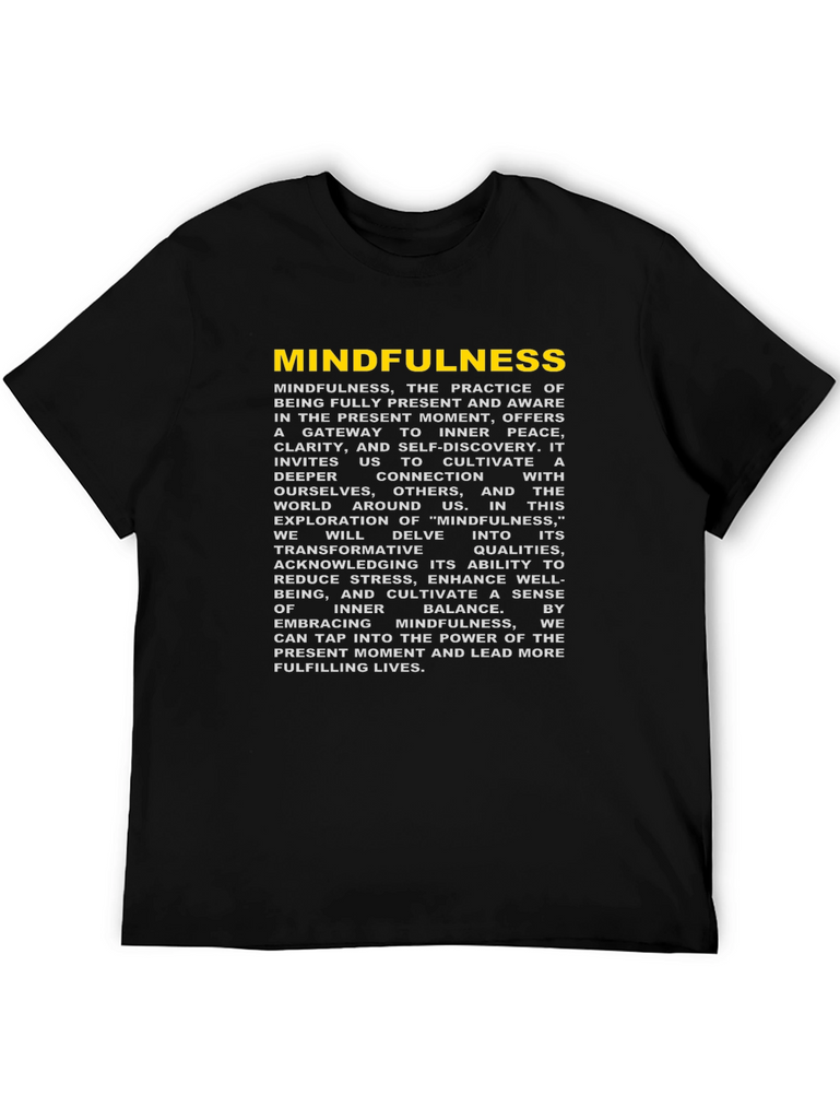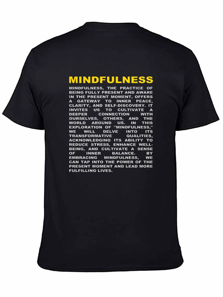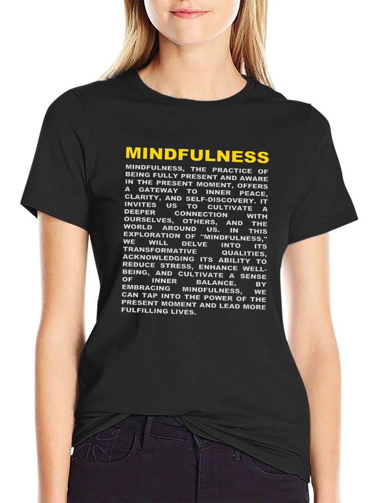 This sleek black T-shirt features a printed text design showcasing the definition of mindfulness. The print emphasizes key aspects such as presence, awareness, inner peace, and self-discovery. Made from a comfortable-looking fabric, this shirt is ideal for everyday wear and casual occasions. Its minimalist design and powerful message make it a great conversation starter for those interested in meditation, wellness, or personal growth. Wear this shirt to promote a sense of calm and mindfulness throughout your day, and inspire those around you to embrace the present moment.