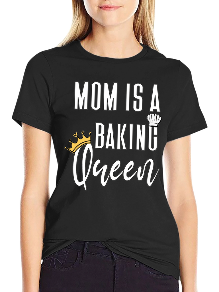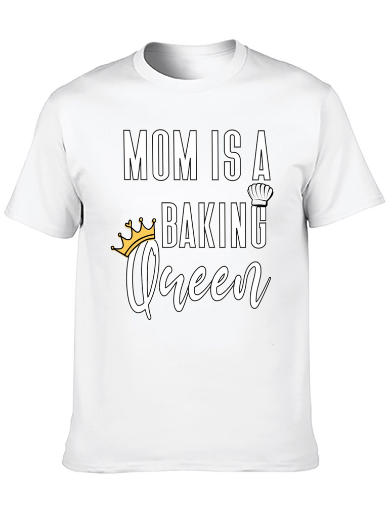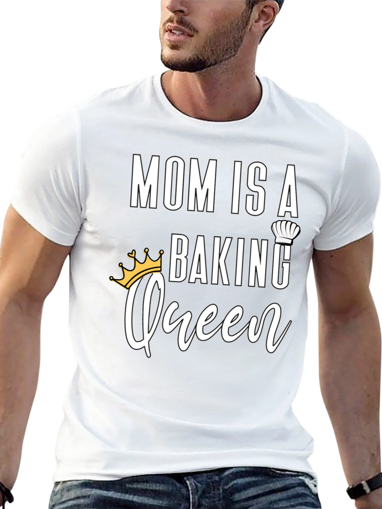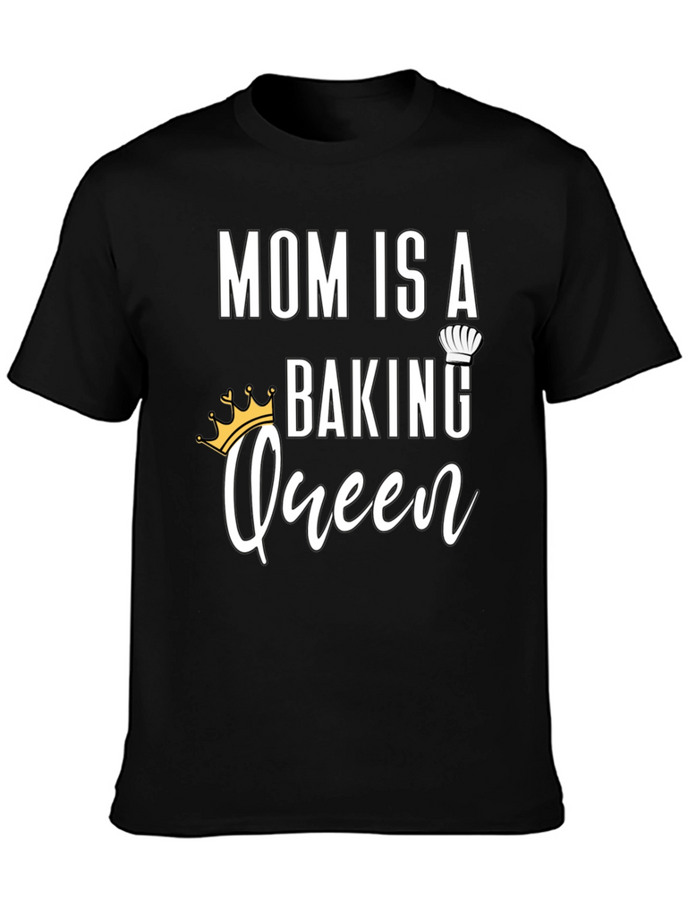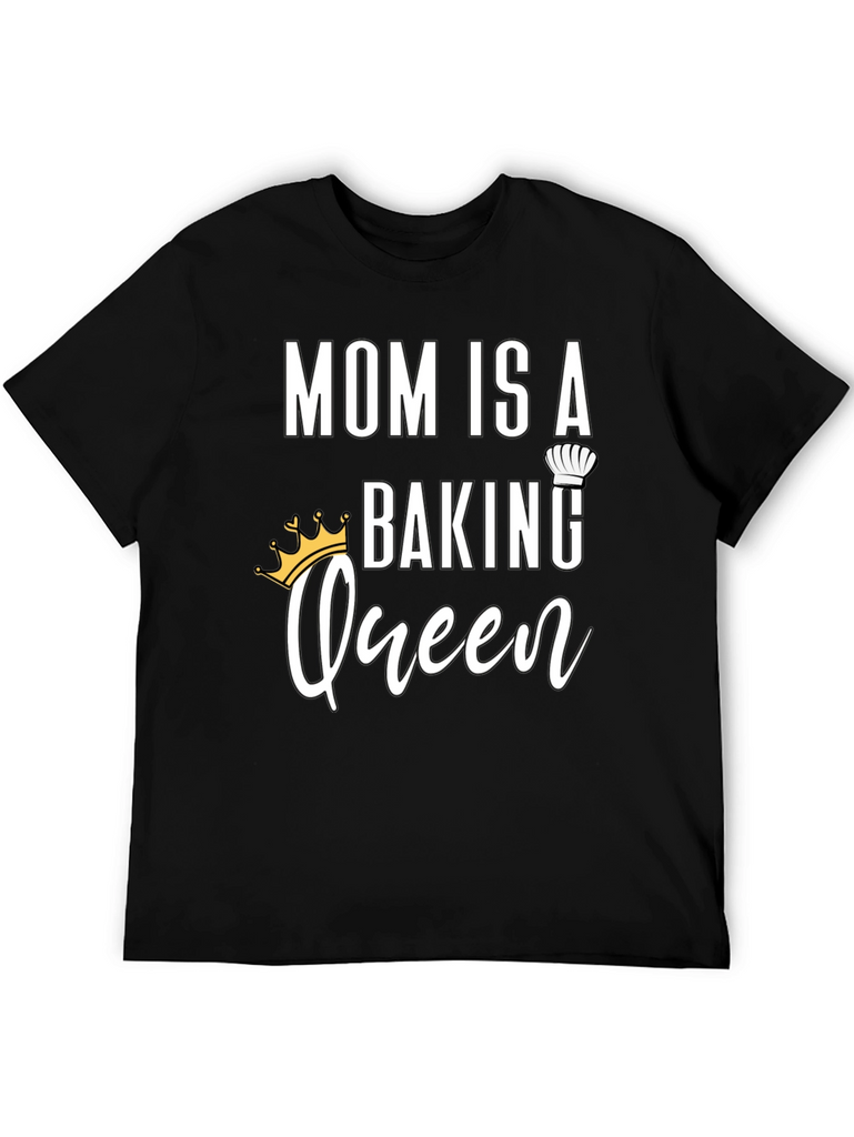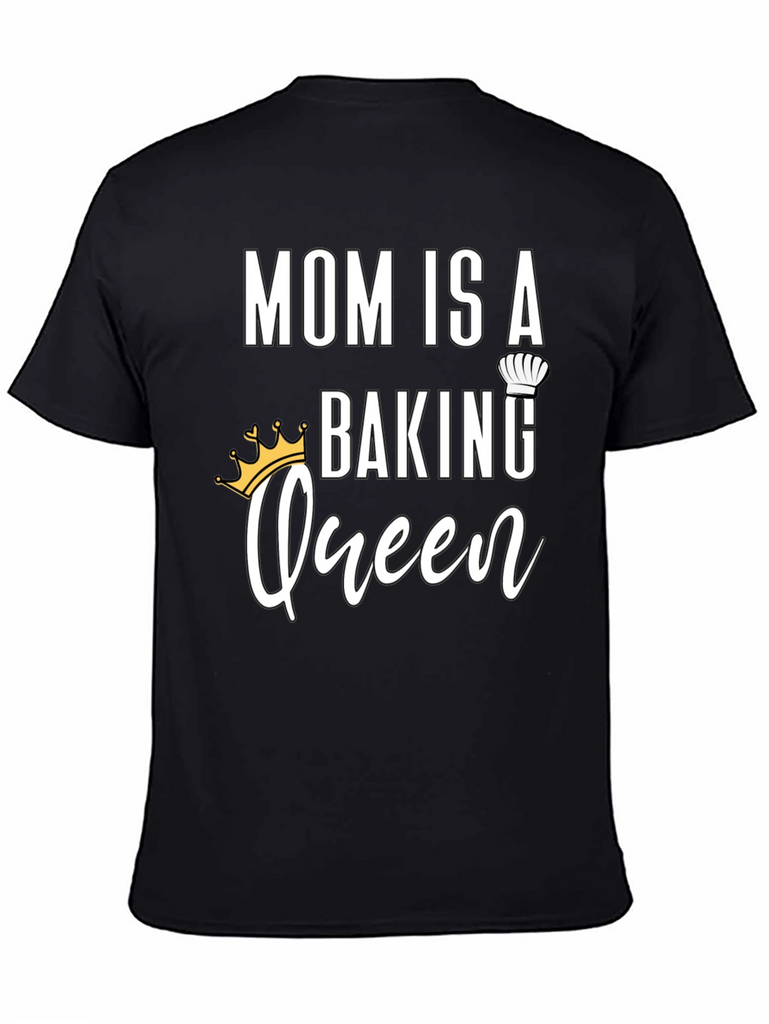 Celebrate the baking prowess of your mother with this charming black t-shirt. The design features the words 'MOM IS A' in bold, followed by 'BAKING' topped with a chef's hat, and the word 'Queen' in a cursive font with a crown. Ideal for gifting on Mother's Day, birthdays, or any special occasion, this shirt is a stylish and fun way to show your appreciation for Mom's delicious creations. Made from comfortable materials, it's perfect for wearing while baking or for everyday casual wear.
